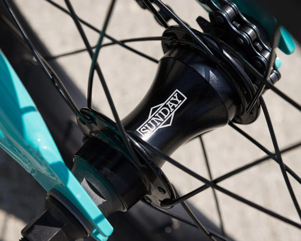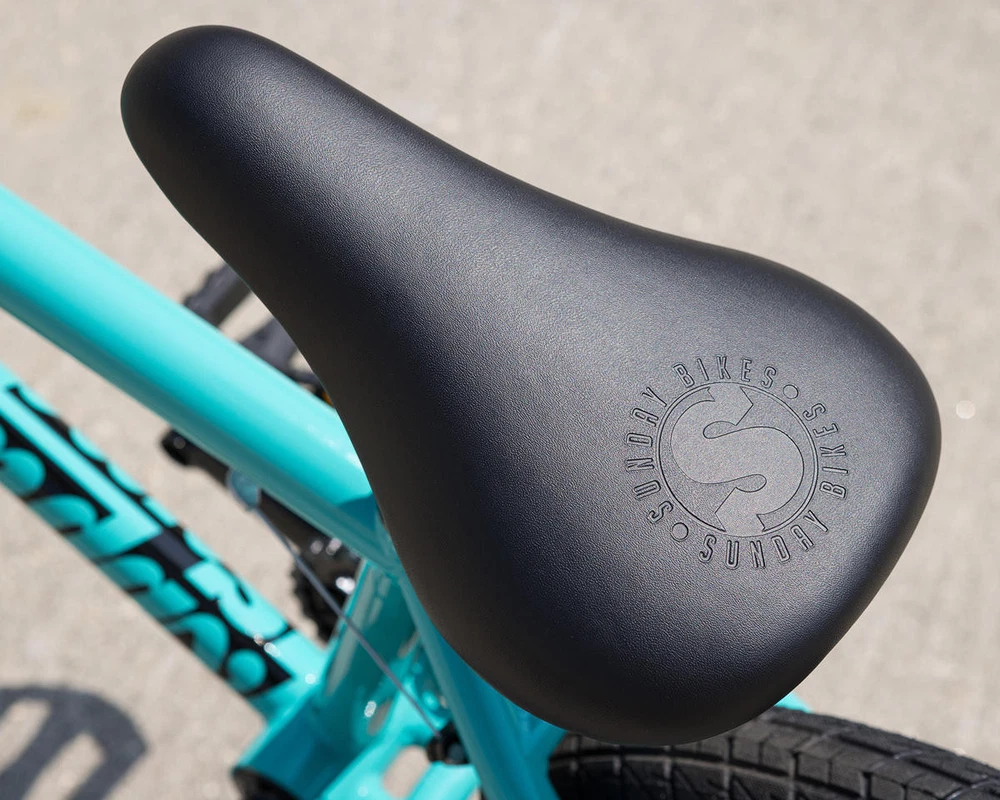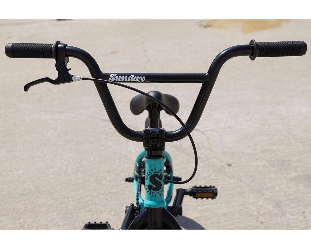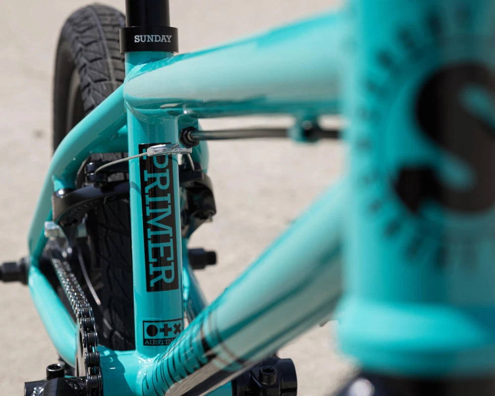 Sunday Primer 16" BMX Bike Description: The Sunday Primer 16" BMX Bike is built to get little shredders going big! The Primer 16" bike features everything you need to keep the bike smooth and durable; sealed cassette rear hub, 3-piece chromoly cranks, sealed bottom bracket bearings, and beefy 2.1" Sunday Current tires. This bike is designed as a pro-level freestyle bike for young rippers to advance their skills. Specifications: Frame: Sunday Primer, High-Tensile Steel, Integrated Headtube Fork: Sunday Primer, High-Tensile Steel, 2-Piece Steerer Tube, Welded Preload Headset: FSA Integrated (1-1/8") Stem: Top Load, Aluminum (40mm) Bars: Sunday, High-Tensile Steel, 2-Piece (23" Width) (6.75" Rise) (12° Backsweep) (1° Upsweep) Grips: Velo Junior Cranks: 3-Piece, Chromoly (127mm Length) Bottom Bracket: Sealed Mid (19mm) Pedals: Wellgo Junior Platform, Plastic Sprocket: Sunday Sabertooth V2, Steel (25 Tooth) Chain: KMC S1 Front Hub: Sunday Low-Flange, Unsealed (3/8" Axle) Rear Hub: Sunday Sealed Cassette (14mm Axle) Driver: 10 Tooth Front Rim: P-7X, Aluminum (16") (20 Hole) Rear Rim: P-7X, Aluminum (16") (20 Hole) Front Tire: Sunday Current (16 x 2.1") Rear Tire: Sunday Current (16 x 2.1") Seat: Sunday Badge (Combo) Seat Post: Combo (25.4mm) Seat Clamp: Sunday Brake Lever: Aluminum (U-Brake Compatible) Brakes: Odyssey Springfield U-Brake Gyro: - Gyro Tabs: Drilled (Not Included) Brake Mounts: Welded Extras: - Color: Turquoise Weight: 23.3 lbs Geometry: Toptube Length: 16.5" Chainstay Length: 10.6" - 10.85" Headtube Angle: 74.5° Seattube Angle: 71° Bottom Bracket Height: 9.25" Standover: 6.9" Recommended Sizing Guide: 3' 2" - 4' Rider Height Note: To ensure that every component on your bicycle is working properly, we recommend that all bikes be assembled by a qualified mechanic. Improper assembly of your bicycle may lead to premature wear or failure of individual components such as headsets, crank assembly and wheels. Failure to do so may void the manufacturer warranty. About Us | View Store