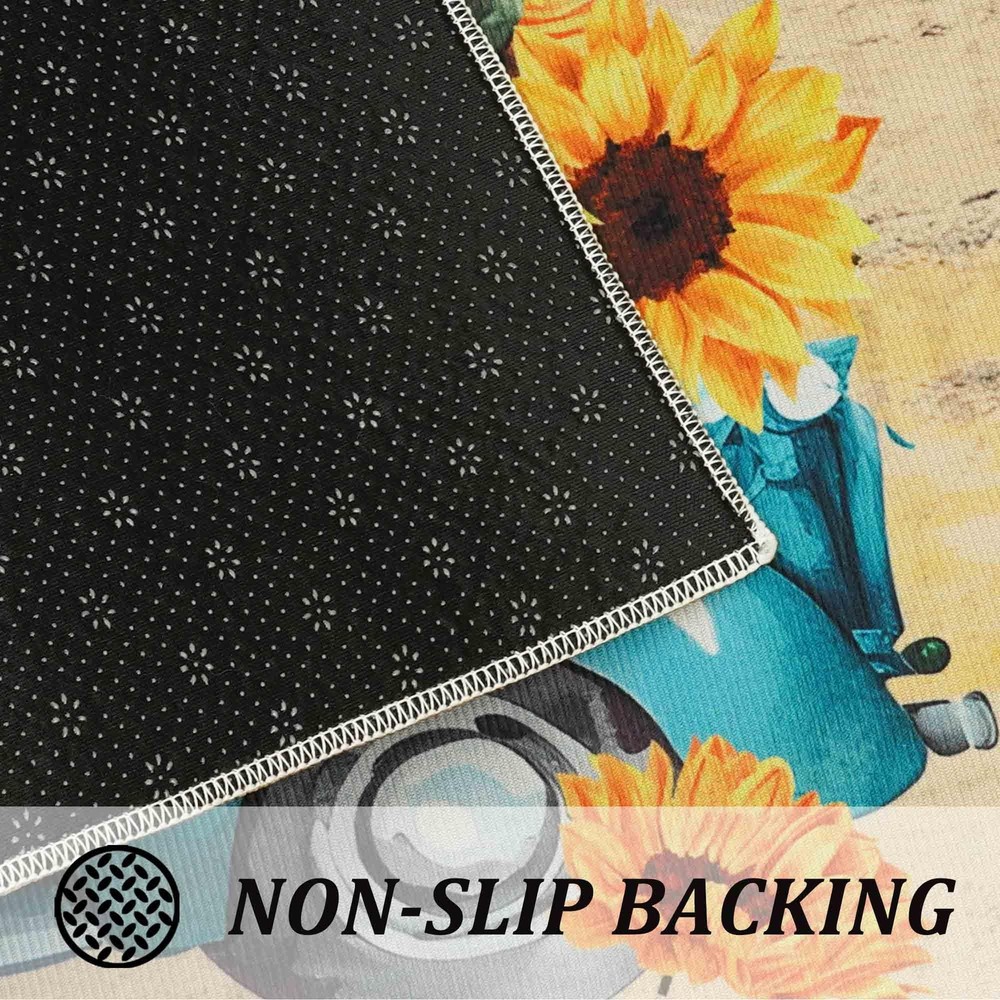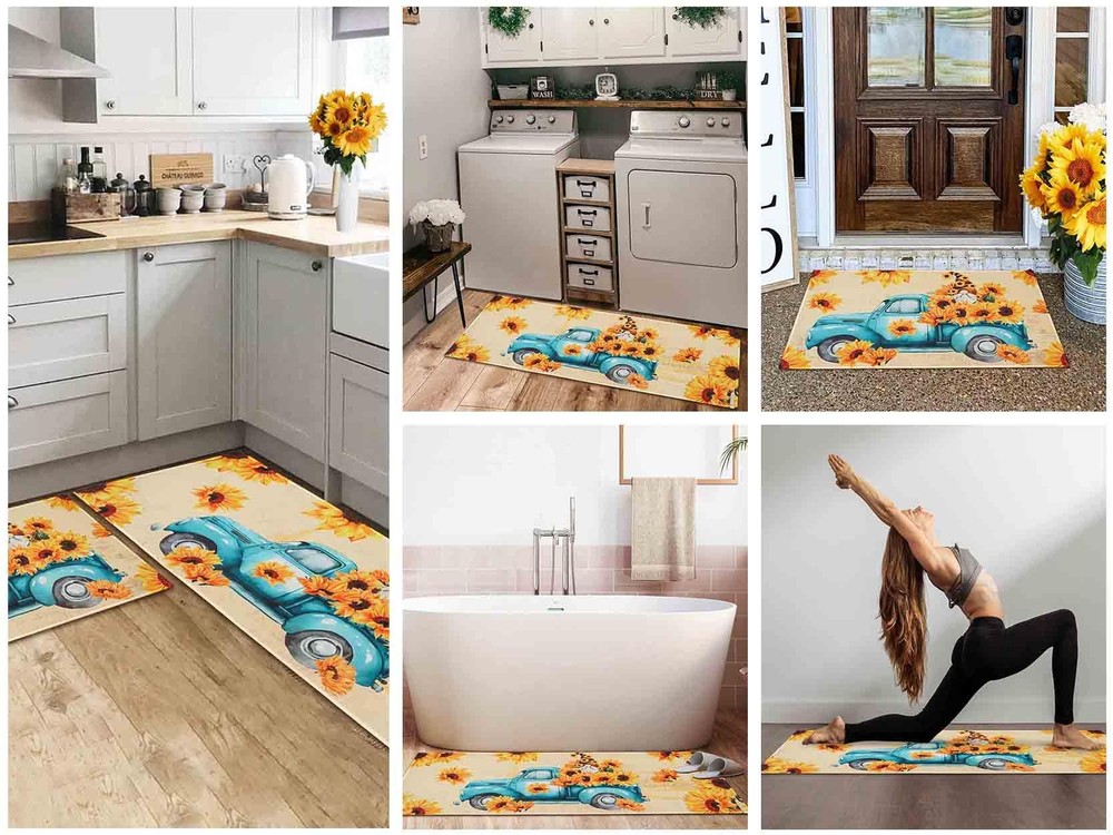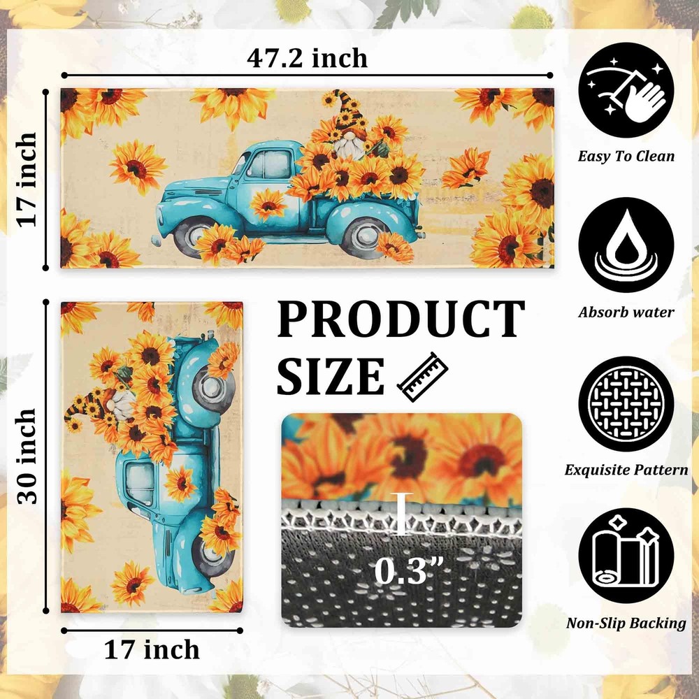 Sunflower Kitchen Rugs Decor Set of 2, Gnomes Rug Retro Style Non Slip Kitchen Sunflower Print Kitchen Mat, Farmhouse Kitchen Runner Rugs with Rubber Backing 17"x47"+17"x30" PERFECT SIZE & DURALE MATERIAL - Measures 17" x 30" and 17" x 47", features 0.25" slim. One long and one short making them just the right size for the kitchen. Our stylish sunflower kitchen mats make a beautiful addition to your kitchen, dining room, craft rooms and office spaces NON-SLIP DESIGN - Backed with non-slip recycled rubber and topped with polyester felt that is low-profile to reduce chances of tripping, high-quality durable construction to ensure that the mats will keep their shape, even with extended and heavy use PERFECT FOR HOME DECOR - Make your kitchen more stylish and comfortable with these durable, unique, seasonal kitchen mats. Add a pop of color in the entryway and protect your floors too. Perfect for any kitchen, deck, patio, porch, veranda and entryway EASY TO CLEAN - The kitchen rugs are easy to clean, you can just use vacuum to clean it on daily. If it has been used for a long time, customer can use wash machine to clean the mats. Different from other low quality kitchen mats, our mat is more durable and be strictly tested before marketing MULTIPLE USES MATS - Suitable as standing desk mat, office mat, kitchen runner mat, doormat, bedroom rug, bathroom rug mat, kid's room rug or other non-slip mat application, provides a warm accent for the home or kitchen SHIPPING Domestic Buyers - We have confidence in our products, but if you are not fully satisfied please contact us within 30 days of purchase and you will get full refund. - We ship within 3 business days of payment, usually sooner - We offer FREE shipping on all orders! - We only ship to the lower 48 states, no APO/FPO addresses or PO Boxes allowed International buyers – please note: Import duties, taxes, and charges aren't included in the item price or postage cost. These charges are the buyer's responsibility. - Please check with your country's customs office to determine what these additional costs will be prior to bidding or buying. * Order Cancellation Policy ** You can return a product for up to 30 days from the date you purchased it. 1. The seller reserves the right to cancel the special case only due to eBay cancellation fee. 2. The decision of seller is the final. 3. The seller will respond to the cancellation request within 2 business days. Please wait for the result of cancellation. 4. In case the cancellation is not completed by some reasons, the buyer can follow the options below to get the refund. 4.1 The buyer can reject the item when it arrives. 4.2 The buyer can send the item back to the seller within 30 days If the buyer receives item (USA Shipment ONLY). The seller will provide the FREE return label to the buyer when the buyer opens " Return Item" case on eBay by using the reason as "Change my mind" ONLY. 5. When buyer has placed the order. The order will be processed and completed by automatic warehouse system within 5 minutes. In case that buyer sends the cancellation request after 5 minutes of placing the order, the request will be rejected. **Sending direct message to cancel the order is not allowed for every case.* Return Policy For the return case - If buyer would like to return the items for refund or replacement, please CONTACT SELLER to receive the free return label from seller. The refund or replacement will be processed with the tracking number of return label which is provided by seller only. The other ways of return which are not approved by seller will not be processed for the refund or replacement.