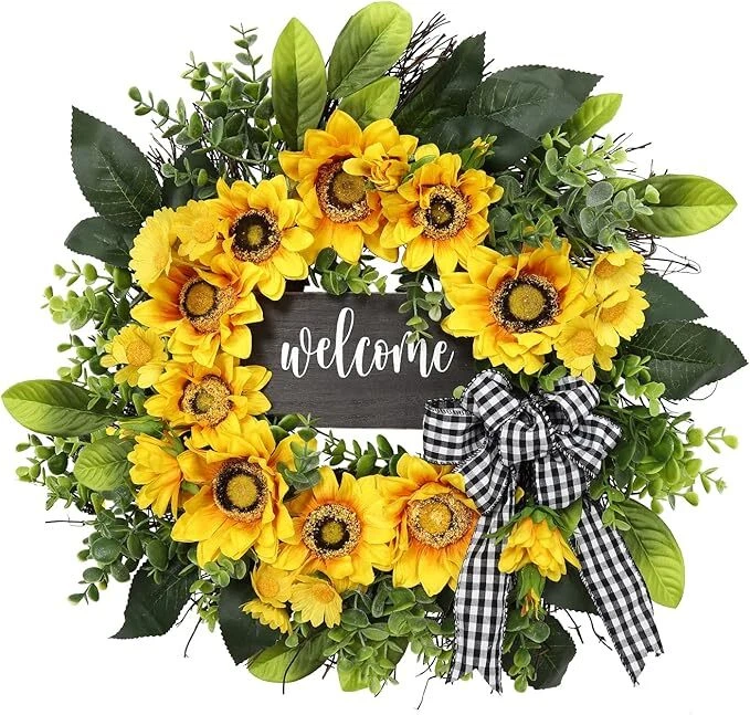 This sunflower wreath brightens up my front door with its cheerful, farmhouse charm! The vibrant yellow blooms and rustic "Welcome" sign make it perfect for spring and summer, but it’s stylish enough to stay up year-round. The quality is fantastic—handmade with lush flowers and sturdy materials. It’s a great gift for housewarmings, Mother’s Day, or just treating yourself. Love how it adds a cozy, welcoming touch to my porch!