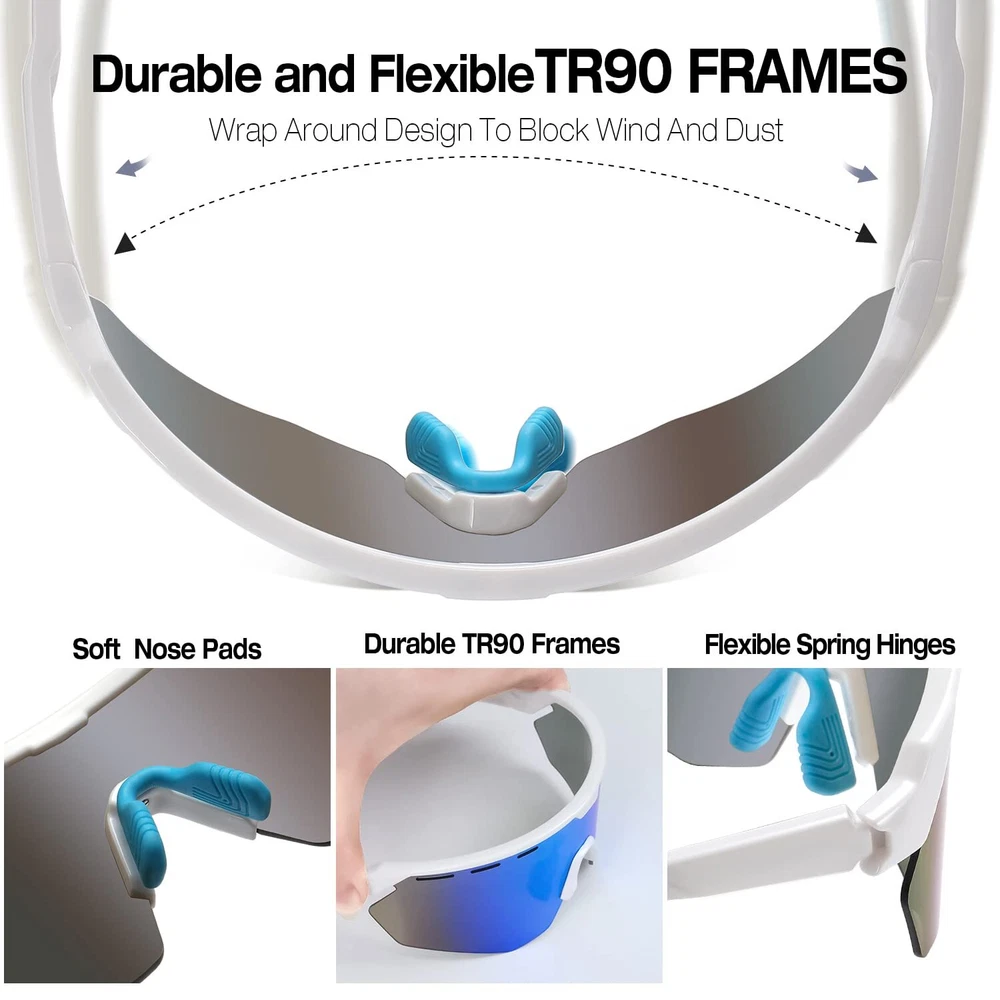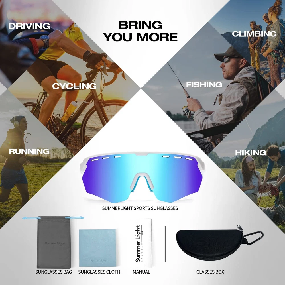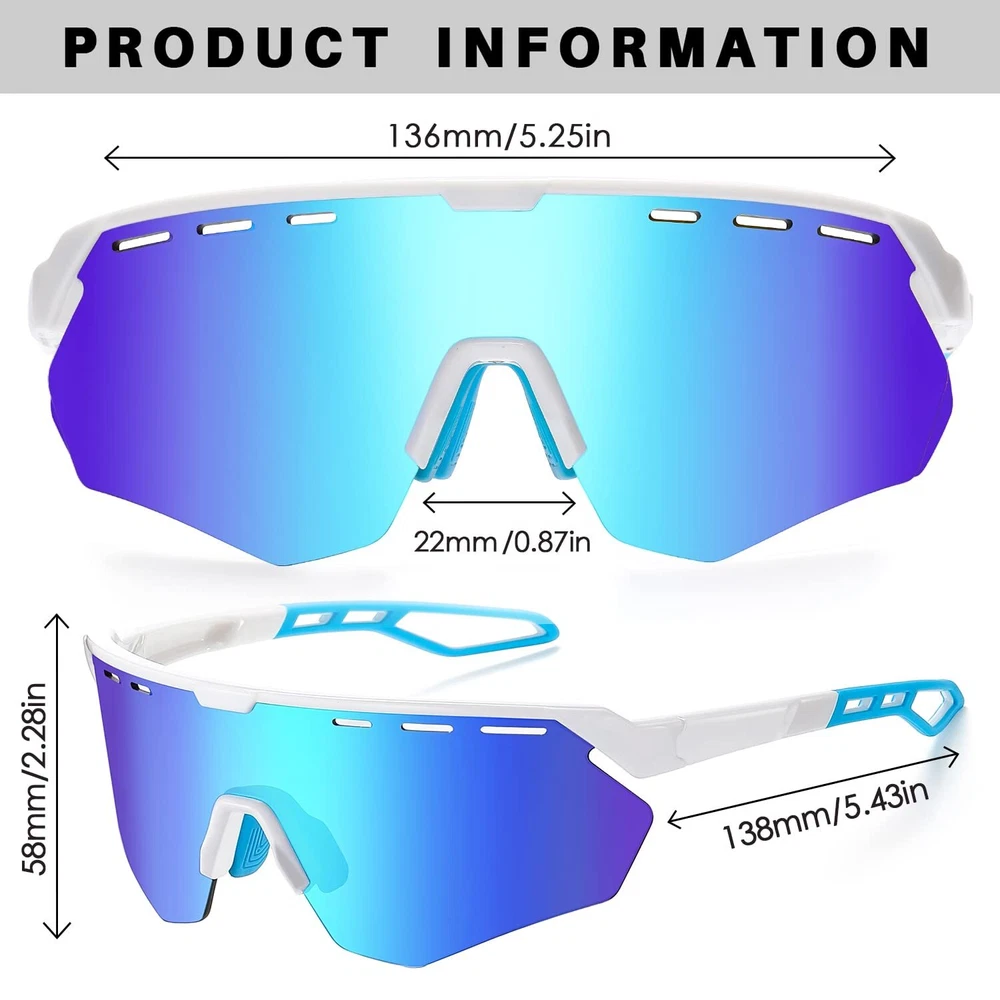 【UV400 SUNGLASSES MEN】- These sunglasses womens block 99% of glare and harmful light (UVA & UVB & UVC). Wearing baseball sunglasses outdoors can prevent eye fatigue and pain, protect eye health, and also make the vision clearer. The hole on the lens facilitates air circulation and the lens is not easy to fog up 【A+ GRADE LENS】- These mens sunglasses use premium security materials as lenses, and 9-layer lens design can effectively block harmful light. Professional cycling glasses protect eyes when doing sports, and wrap around sunglasses protect against wind and dust when riding 【OUTDOOR SPORTS SUNGLASSES】- Ideal baseball glasses for cycling, baseball, fishing, running, and driving. sunglasses can meet your multiple sports needs. Ultra-lightweight frame allows you to exercise without any burden 【PRODUCT DIMENSION】- Lens Width: 136mm(5.25in), Lens height: 58mm(2.28in), Arm Length: 138mm(5.43in), Bridge: 22mm(0.87in) 【LIFETIME WARRANTY】- You don't have to worry about how long these fishing sunglasses can be used, they are durable enough. 100% Risk Free Shopping. If you have any questions about the sport sunglasses, please feel free to contact us