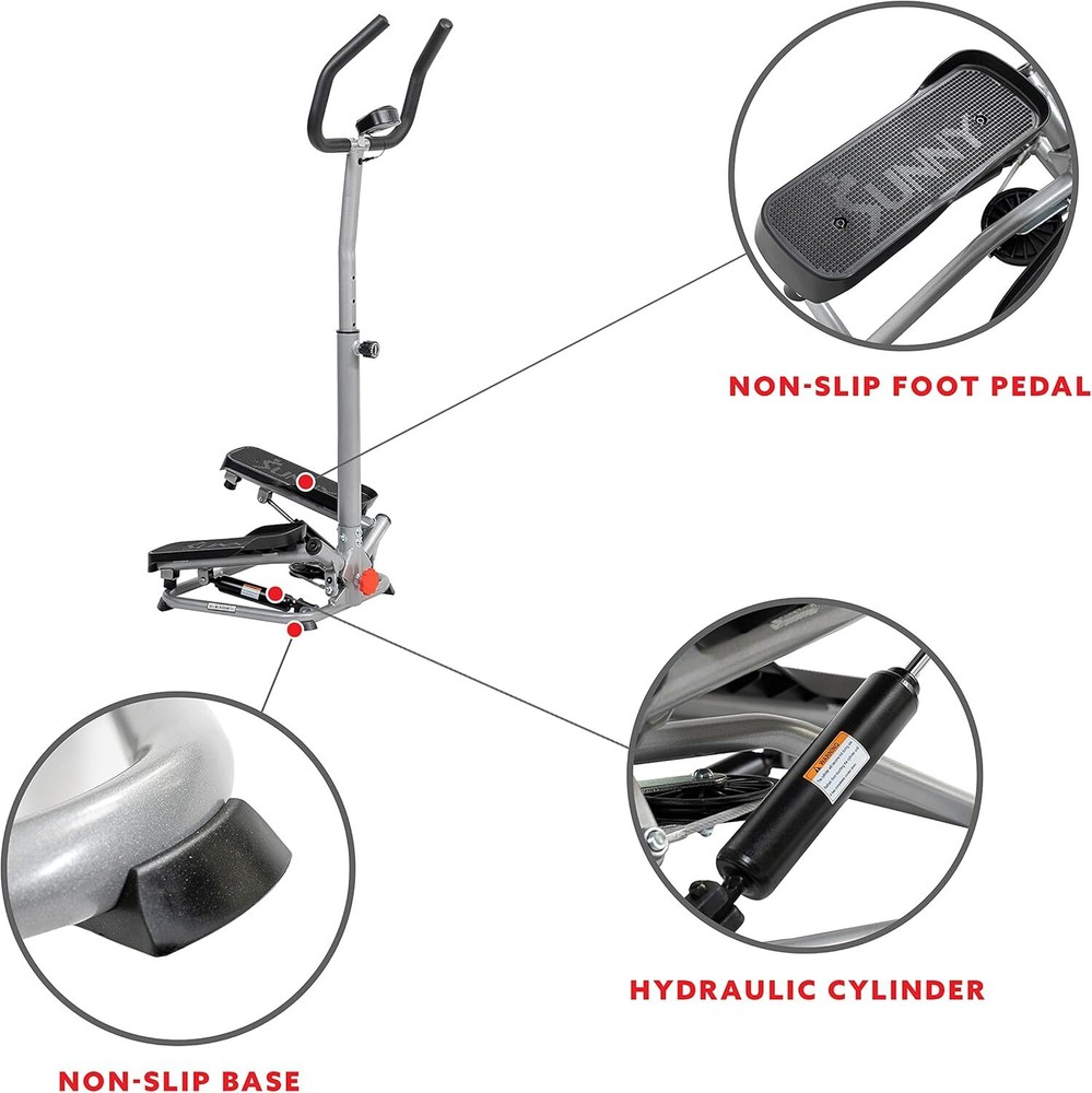 Sunny Health & Fitness Steppers for Exercise at Home Exercising Workout Cardio Climber Thigh Space Squat Twist Stepper Advanced Twisted Resistance Band Step with Optional Free SunnyFit App Connection Item Description About this item 【LOW-IMPACT】The Twist Stair Stepper low-impact workout experience, allowing users to tailor intensity levels, engage in effective cardio, target leg muscles, incorporate interval training. 【TWISTING STEPS】The lateral side-to-side action imparts a fluid step motion, engaging different muscles compared to conventional step machines, providing a comprehensive and dynamic workout experience. 【STURDY HANDLEBAR SUPPORT】The sturdy handlebar provides essential support and balance, allowing users to maintain proper posture and stability during their workouts, ensuring a safe and effective exercise experience. 【LCD MONITOR WITH COMPREHENSIVE METRICS】The integrated LCD monitor displays essential metrics including calories burned, step count, scan function, and total count, offering users real-time feedback on their progress. 【QUIET AND SMOOTH】Equipped with quiet and smooth hydraulics, ensuring a noise-free and seamless workout experience. This feature allows users to exercise without disturbing others, making it ideal for home use and distraction-free workouts. 【HEIGHT ADJUSTMENT & CUSTOMIZED INTENSITY】The Stepper offers adjustable step height, allowing users to customize the intensity of their workouts. By altering the step height, individuals can tailor the resistance levels to match their fitness goals. 【EASY ASSEMBLY AND STORAGE】Designed for effortless assembly, allowing users to set it up quickly and start their workouts without hassle. Its space-saving design ensures easy storage, making it convenient for users with limited space at home. 【STURDY FRAME FOR STABILITY】Robust and durable frame, providing exceptional stability and support during workouts. This sturdy construction ensures user safety, allowing for confident and intense exercise sessions. 【Sunny Health & Fitness Commitment】A top fitness brand for 20+ years, offers superior products and a dedication to excellence. Count on our committed customer service and enjoy peace of mind with a 1-year warranty on the structural frame. Show more › See more product details *Digital Monitor: Calories, count, time, total count, scan Give your glutes and thighs a noticeable lift with the Sunny Health & Fitness Twist Stair Stepper Machine with Handlebar - SF-S020027. The adjustable handlebar and stabilizer ring will keep you balanced as you take your fitness to the next level. Stay on top of your workout goals by using the integrated digital monitor. The space-efficient design lets you turn your living room into your own home gym in an instant for an effective and convenient fitness experience. The convenient digital monitor displays: count, time, calories, total count and scan. Switch up your routine between steep climbs or quick high intensity shallow steps. The higher the steps, the more resistance is generated. Height modified handlebar allows for quick, easy, and simple adjustments. The stabilizing ring at the foundation of the stepper provides a solid and unshakeable base with which to push your step and climbing workouts to the limit. The lateral side-to-side action imparts a more fluid step motion and works out different muscles than conventional step machines. The non-slip handlebars help you keep a steady grip and maintain balance while stepping. Designed to maximize space efficiency while providing a reliable and convenient machine for home fitness. Expert engineering and quality materials enables the total body advanced step machine to feature a max user weight of 250 LB. Payment We accept payment only through PAYPAL Shipping We ship products worldwide through standard express courier service, it will reach within 7 to 10 days to abroad buyers, we ship the product after recieved clear payment and give full information about shipment to the buyer Return We accept product return within 7 to 21 days from delivery date but product should be in original position and not in damaged condition,the return shipping charges will be buyer responsibility