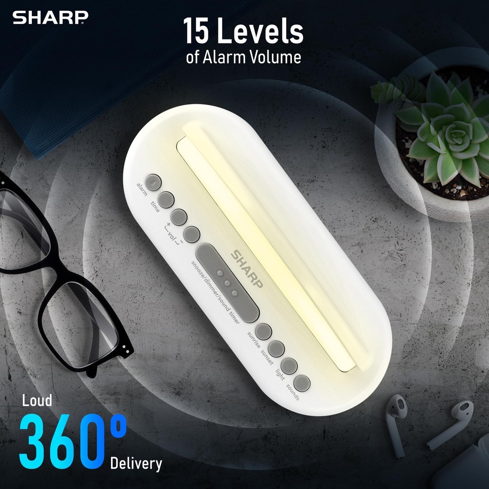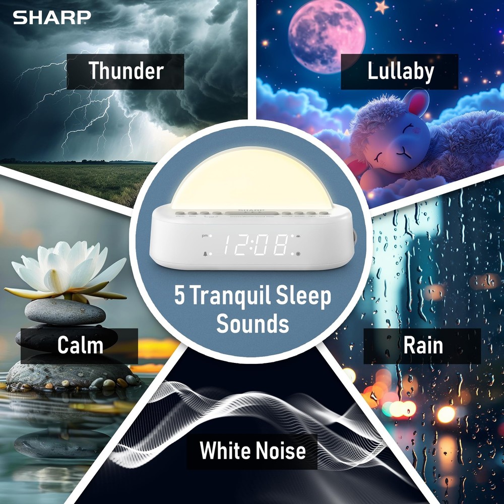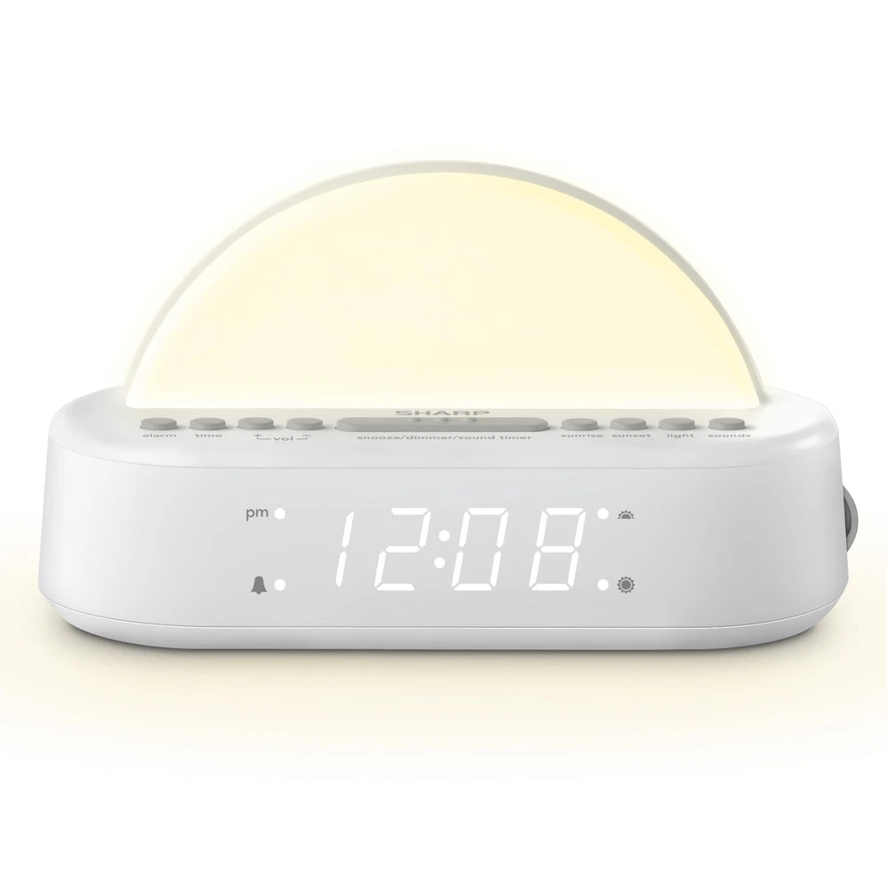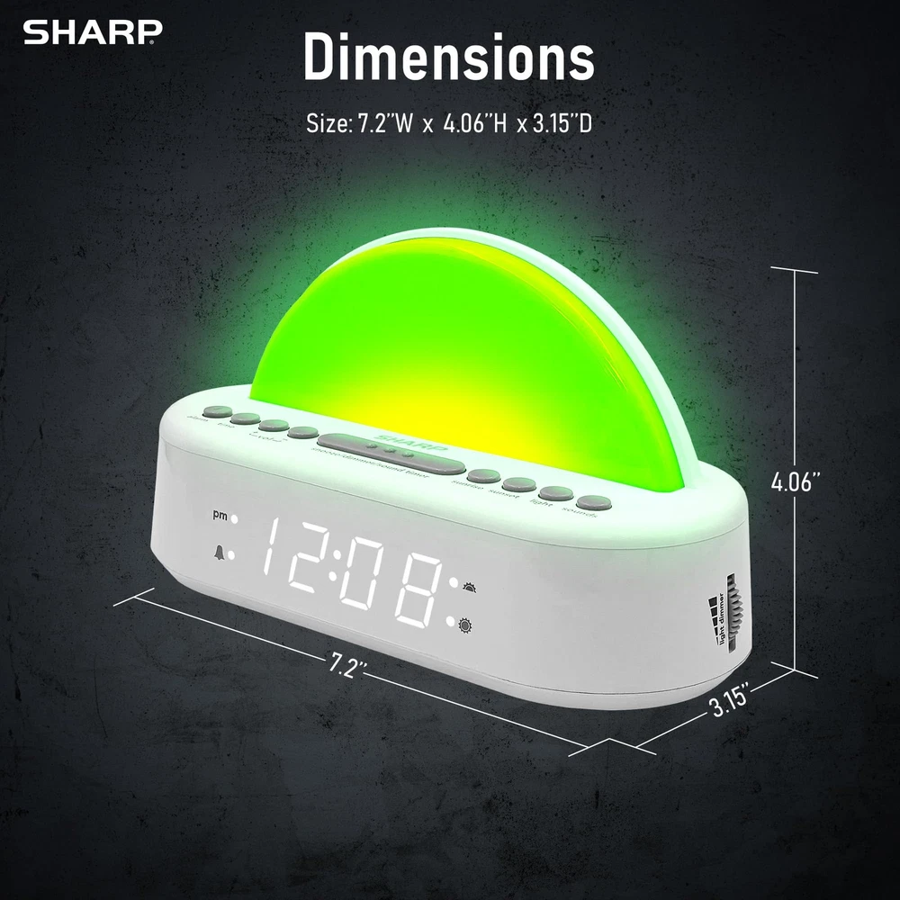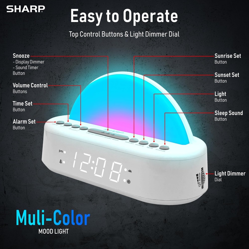 Introducing the Wake-Up Alarm Clock, your ultimate companion for deep, restful sleep. This innovative device features a Sunrise Wake-Up Light and a soothing Sunset light to help you drift off gently. With mood lighting that offers multiple colors, you can create the perfect atmosphere for relaxation. Plus, a handy timer allows the lights to dim gradually as you fall asleep, ensuring a serene environment. Enjoy five tranquil sleep sounds played through a crystal-clear speaker, perfect for heavy sleepers and anyone seeking to restore their rest. The intuitive dimmers let you control the clock display and light diffuser easily, while the battery backup ensures that your time and alarm settings remain safe during power interruptions. When the power is restored, the display lights up automatically, so you never lose track of time. Designed for modern lifestyles, this smart wake-up light fits perfectly on your nightstand and is portable enough for travel. Whether you’re a busy teen, a new parent with a baby, or just someone who loves a natural daylight routine, this clock has you covered. With dimensions of 7.09" x 4.06" x 3.15", it’s compact yet effective, and its aesthetic design complements any bedroom decor. Dive into a world of white noise and natural sounds, and wake up feeling refreshed and rejuvenated. Experience the magic of a sunrise with our alarm clock that mimics sunsets for the ultimate sleep aid. Don't miss out on this modern daylight solution—your path to better sleep awaits! Easy to Use Alarm Clock with 0.7” White LED Digit Time Display in base has Display Dimmer Control with 4 Levels of Brightness: 100%, 50%, 5%, OFF. The perfect digital alarm clock for bedroom with sunrise function and relaxing sleep sounds. This stylish alarm clock also has a 9 Minute Snooze - Get a few more minutes of sleep with built in snooze function! Wakeup to the Sunrise Light 30, 60 or 90 Minutes Before Your Alarm Time. Chose the duration of the perfect amount of time to wake you up and the light will gradually increase the level of brightness. Multicolor Mood Light with 8 Color Modes: Warm White, Yellow, Red, Green, Blue, Blue & Magenta Mix, Green & Yellow Mix, Rainbow. Mood Light Dimmer Control has 5 Levels of Brightness: 100%, 75%, 50%, 25%, 5% - Fall Asleep to the Sunset Light or Mood Light for 30, 60 or 90 Minutes Before Your Desired Bedtime 5 Tranquil Sleep Sounds: Calm, Rain, Thunder, White Noise, Lullaby - Sleep Sound Time for 30, 60 or 90 Minutes. Set to your desired level of sound with 15 levels of sound to create the perfect relaxing environment for your room. ELECTRIC POWERED with “NO WORRY” BATTERY BACKUP: Plug into standard household wall outlet (This alarm clock is compatible with 110V/120V power outlets) to power the clock. Battery Backup (Requires 2 x AAA batteries (not included)) This clock is electric operated; The battery backup is used for storing the time and alarm settings if the power is interrupted. During battery backup the clock’s display will not be lit. Once the power is restored the display will re-light.