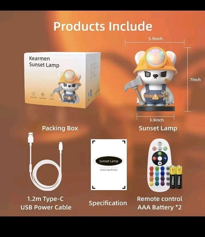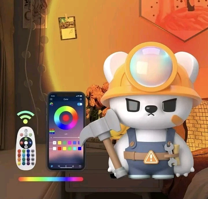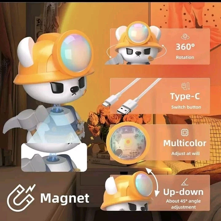FedEx 2day air, arrive in 2 days, freeshipping Add a touch of modern style to your indoor space with this Sunset Lamp Projector. The lamp features a cute cartoon bear design, perfect for adults and children alike, and a semi-glossy finish. It comes with a remote control app for easy operation and a sensor light for convenient use. The lamp is corded and USB-powered, with a white cord color that matches the overall theme of stars and sky. This night light is perfect for use in the bedroom or living room, and it features LED lighting technology for an energy star rating of A+++. The lamp has a range of settings, including three different options, and it is ideal for anyone who loves the character family of .Hack//. The Sunset Lamp Projector is a must-have for anyone who wants to add a unique and stylish touch to their home decor.