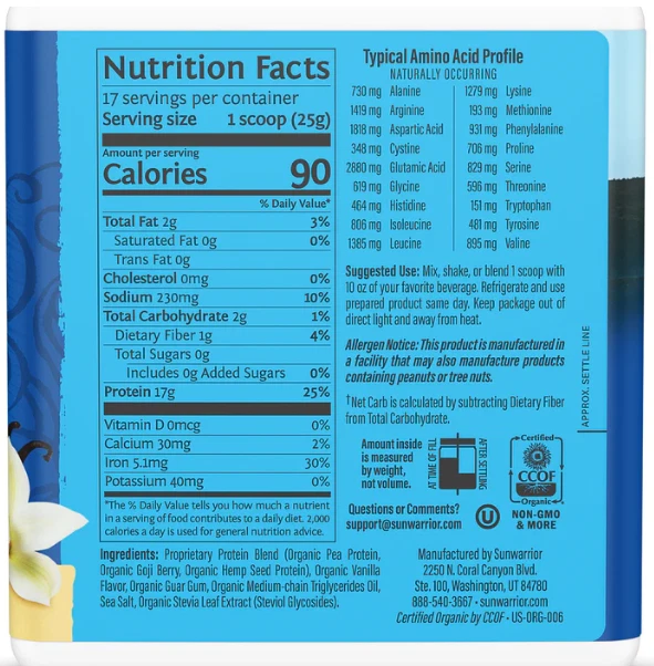 Warrior Blend Organic High Performance • KETO Friendly Sunwarrior's Warrior Blend Protein Powder is a top-quality plant-based protein supplement designed to fuel the body with clean and sustainable protein. The great-tasting formula boasts a powerful blend of organic pea protein, hemp protein, and goji berry powder, providing a well-rounded supplement to support muscle recovery and growth. Medium-chain triglycerides from coconut work synergistically with the other ingredients to create a unique vegan protein exceptionally rich in amino acids and BCAAs. Warrior Blend incorporates only organic, non-GMO ingredients, ensuring consumers receive a pure and potent product free from harmful additives. This vegan protein powder is easily digestible and free from common allergens such as gluten, soy, and dairy, making it an excellent option for those with dietary restrictions or sensitivities. Whether added to smoothies, shakes, or simply mixed with water, Warrior Blend offers a convenient and delicious way to support overall health and wellness.