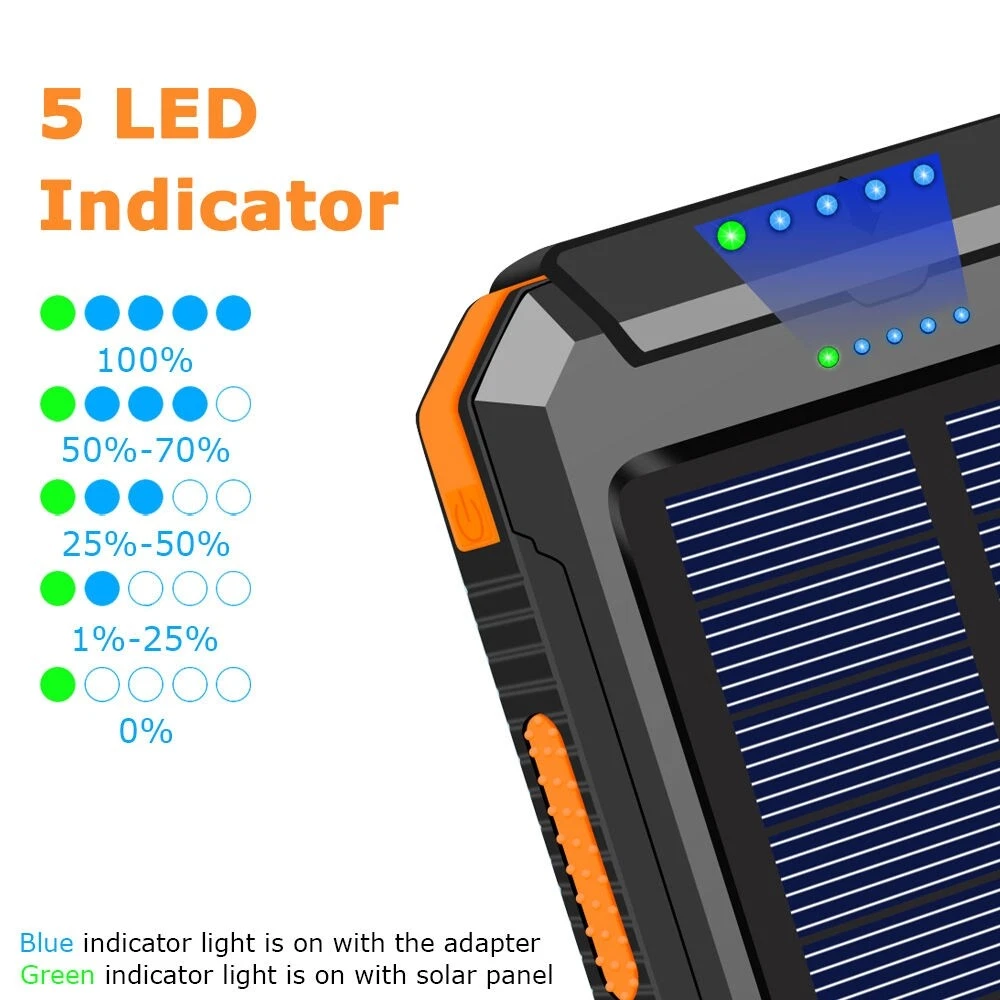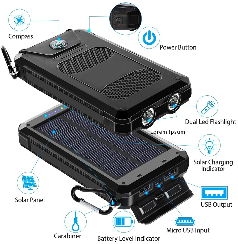 Material:ABS + SiliconePower Capacity:10000000mAhCustom Bundle:YesManufacturer Warranty:Yesgtin13:dose not applyItem Weight:280g / 9.87ozBundle Description:1 x Solar Power Charger 1 x USB Charger CableType:Solar Power ChargerItem Length:14cm / 5.51inchItem Height:2cm / 0.78inchTheme:ModernDesign/Finish:Hybrid, Metallic, RuggedBrand:UnbrandedFeatures:Anti-Fingerprint, Anti-Scratch, Case Friendly, Heavy Duty, Non-Slip, Reusable, Rugged, Shockproof, Solar Charger, Storage Compartment, Tinted, Water-Resistant, With Lighting, with Compass, With Dual LightsCable Length:1 ftWireless Charging Standard:USBNumber of Ports:3Items Included:Charging Cable, Solar Power BankCompatible Model:UniversalItem Width:7.8cm /3.07inchVoltage:5 VConnectivity:Dual USB, Micro USB, Solar Power, USBMPN:Does Not ApplyEAN:dose not applyCompatible Brand:Universal, For Apple, For Google, For HTC, For Lenovo, For LG, For Motorola, For Nokia, For OnePlus, For OPPO, For Samsung, For Sony, For Xiaomi, For ZTEUPC:dose not apply
