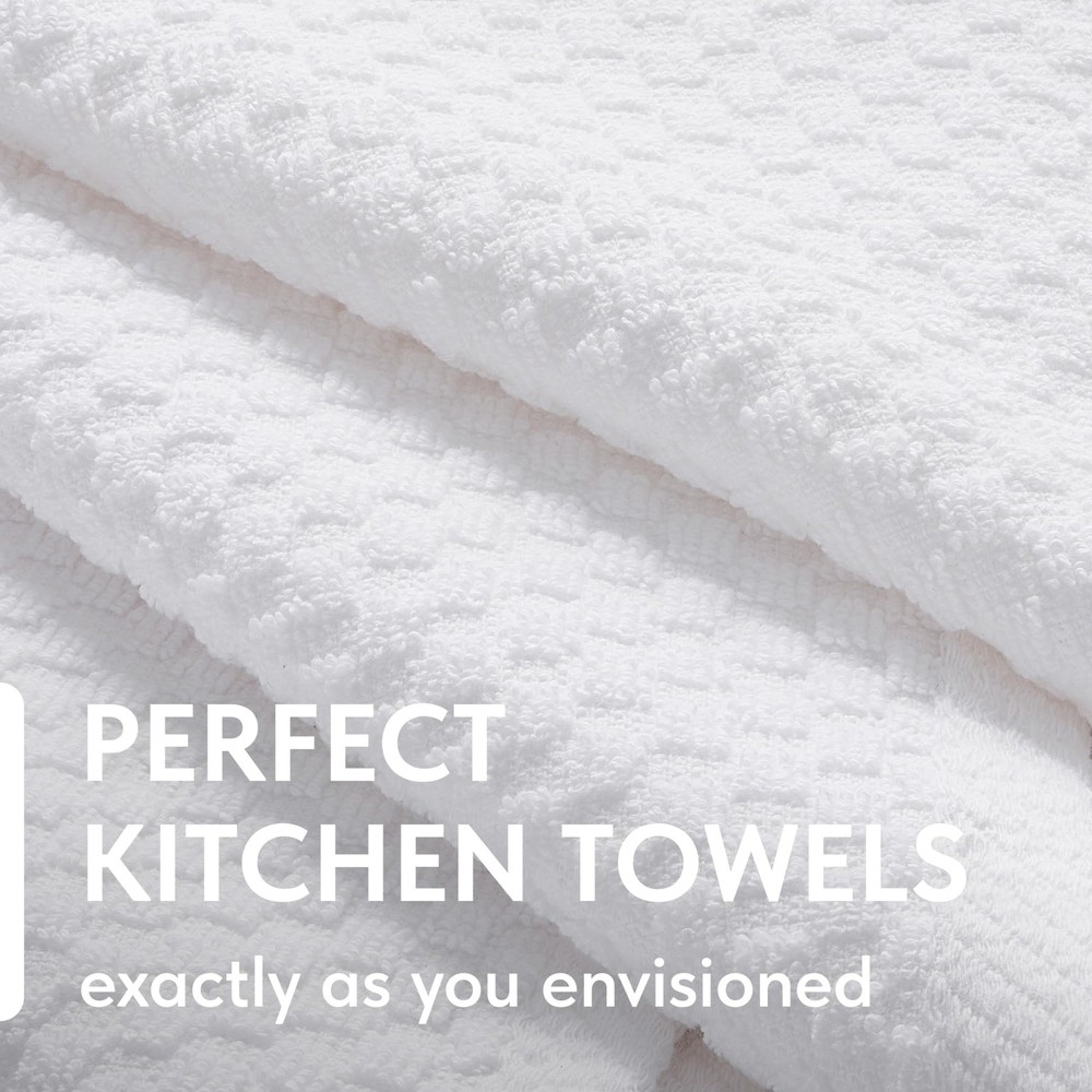 These Kitchen Dish Hand Towels are made of 100% cotton dobby weave, making them strong and durable, perfect for your everyday cleaning needs. The towels are designed with a 410GSM absorbent terry cloth, making them excellent at cleaning up spills and messes in the kitchen and entire house. They are gentle on dishes and other kitchenware, ensuring that they won't scratch or damage your delicate items. They're great for drying dishes, glasses, and pots quickly to keep your kitchen tidy. Use them for wiping hands, drying dishes, or general cleaning tasks, readily handles any stain or spill, and is a reusable towel durable enough to endure numerous uses and washings. These towels are machine-washable and and safe to dry, wash before first use, do not use bleach or fabric softeners, tumble dry low, dry promptly for optimum results to avoid smell, do not iron. With their beautiful design and soft texture, these Kitchen Dish Hand Towels are a must-have for any home cook or cleaning enthusiast. Pack: 12 towels; Size: 15 x 26 inches; Material: 100% cotton dobby weave, terry towels. With our White Classic complimentary 2-year extended warranty, you can indulge in luxury that lasts. UNMATCHED QUALITY: Our white dish towels are designed with outstanding craftsmanship and made from premium dobby weave 100% cotton ensuring they withstand years of frequent use and washing without losing their plush feel and absorbency EXCEPTIONAL LIQUID ABSORPTION: Featuring superior absorbency, these cotton kitchen hand towels splendidly soak up liquids, making them the ideal choice for quick clean-ups, drying dishes, and tackling spills with unparalleled efficiency OPTIMIZED KITCHEN SIZE: Measuring 15 x 26 inches, our dish towels for drying dishes offer the ideal balance between size and functionality, making them versatile enough for drying, cleaning, and cooking tasks alike TIMELESS CLASSIC: Boasting a timeless aesthetic appeal, these dish drying towels are crafted to complement any kitchen decor, enhancing the overall look of your cooking space while offering functionality CARE INSTRUCTIONS: Cotton dish towels for kitchen drying are machine washable and safe to dry. It is recommended to wash them before the first use. Do not use bleach or fabric softeners. Tumble dry on low, and for best results, dry immediately. Do not iron