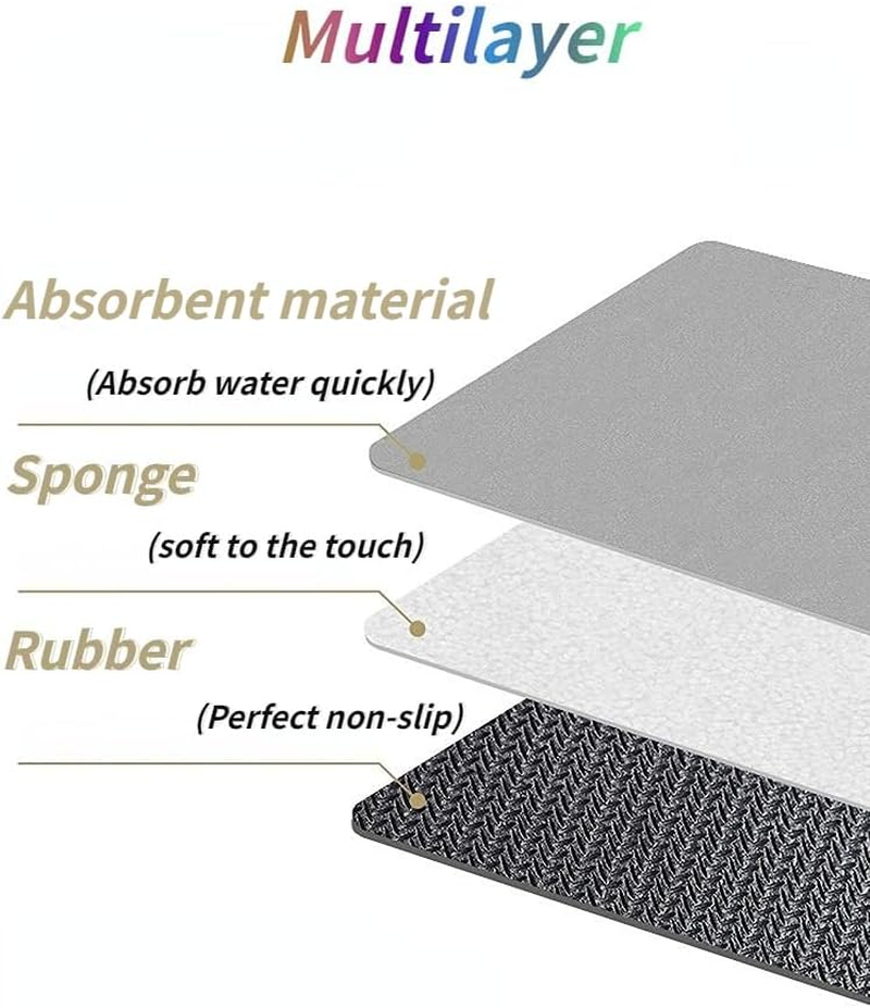 Product Description Super Absorbent Bath Mat Ultra-thin design & anti-slip material It is thin and can be easily placed in any tight place and ensures good water absorption. The bottom is designed with rubber anti-slip material, which can prevent slipping and loosening. Multiple Uses It can be used for bathroom mats, shower mats, kitchen mats, home mats, pet mats, sink mats, living room mats, outdoor mats, etc. Can be used anywhere you want It also can use for dogs or cats mat. 3 seconds dry - Super Absorbent Using Absorbent material, it can quickly absorb water, and it can absorb water within ten seconds, and the bathroom mat becomes dry automatically. Excellent Anti-slip The bottom is designed with rubber anti-slip material, which can prevent slipping and loosening, has great adsorption force, and is more safe and comfortable.