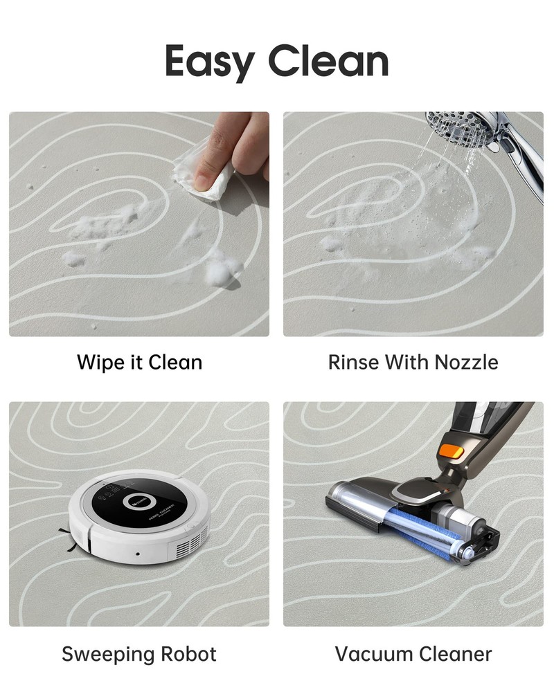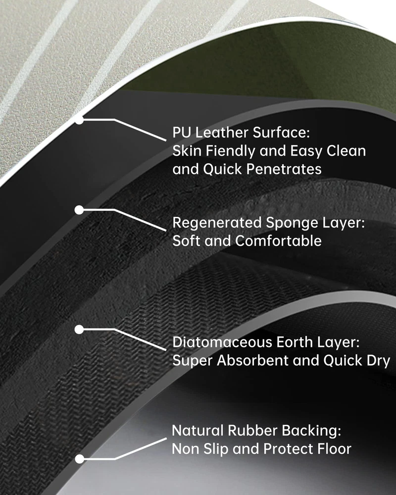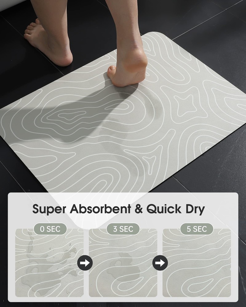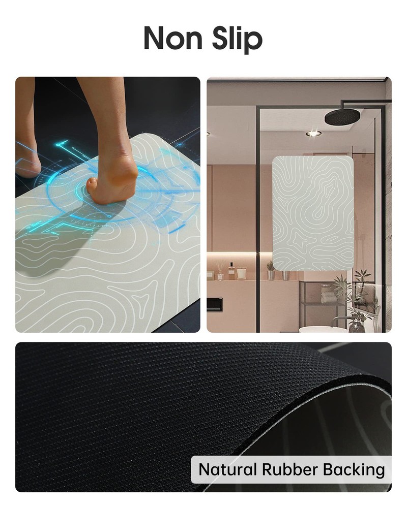 【Super Water Absorption & Quick Dry】This is a bath mats made of PU leather and diatomaceous earth. The PU leather surface has super many holes, which can make the water on the bath rug penetrate into the diatomaceous earth layer quickly, so the surface is always dry and not wet. Diatomaceous earth has super absorbing and evaporating water, making the bath rugs quick dry. 【Easy Clean & Easy Care】The bathroom rugs smooth PU leather surface will not be stained with hair, debris, dust, dirt, garbage like plush, chenille, cotton cloth, memory foam rugs. reducing the difficulty and frequency of cleaning. Easy to Clean, just use wet paper and cloth to scrub or shower nozzle to wash or sweeping robot or vacuum cleaner. After cleaning, it can be put on the floor or pasted on the wall to dry. When not in use, it can be rolled up for storage without taking up space. 【Super Non Slip & Safe】The bathroom mat bottom made non slip and waterproof natural rubber backing. It has strong adsorption and grip, especially on wet ground. It is not easy to move and slide, improving safety and stability. Provide a safer bathroom environment to effectively avoid the risk of children and the elderly slipping. It can also prevent water from penetrating into the bottom of the back cushion and protect the ground. 【Comfortable & Durable】This bathroom mats is made of soft material and has a comfortable feeling of cushioning pressure. The PU leather surface can be skin friendly and highly wear resistant. It does not contain superfine fiber material and will not fall off, pilling, wear, fade, stain, deform, tear. It is more durable than traditional fiber bath mats and is very suitable for long term use. 【Wide Use】This bath mats for bathroom is applicable to bathroom, shower mat, kitchen mat, laundry mat, bathtub mat, under sink mat, bedroom mat, restroom mat, indoor door mat, under door mat, table mat, pet feeding mat, kids bath mat, etc. The design of minimalist art patterns can be used as bathroom decor, room decor,home decor.