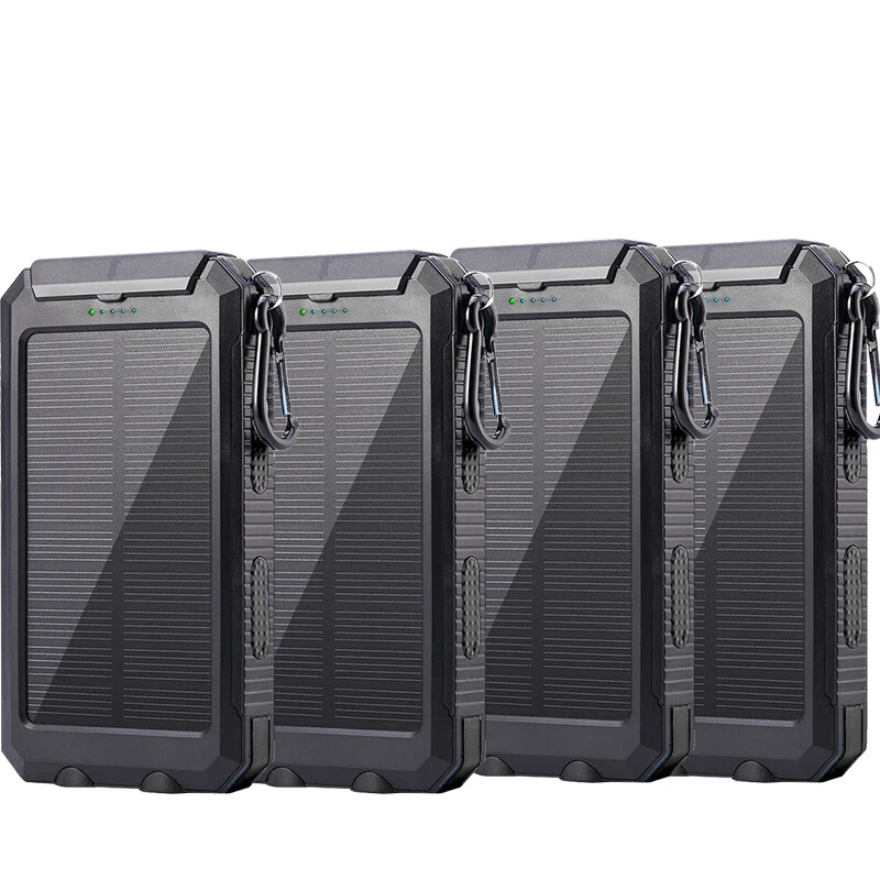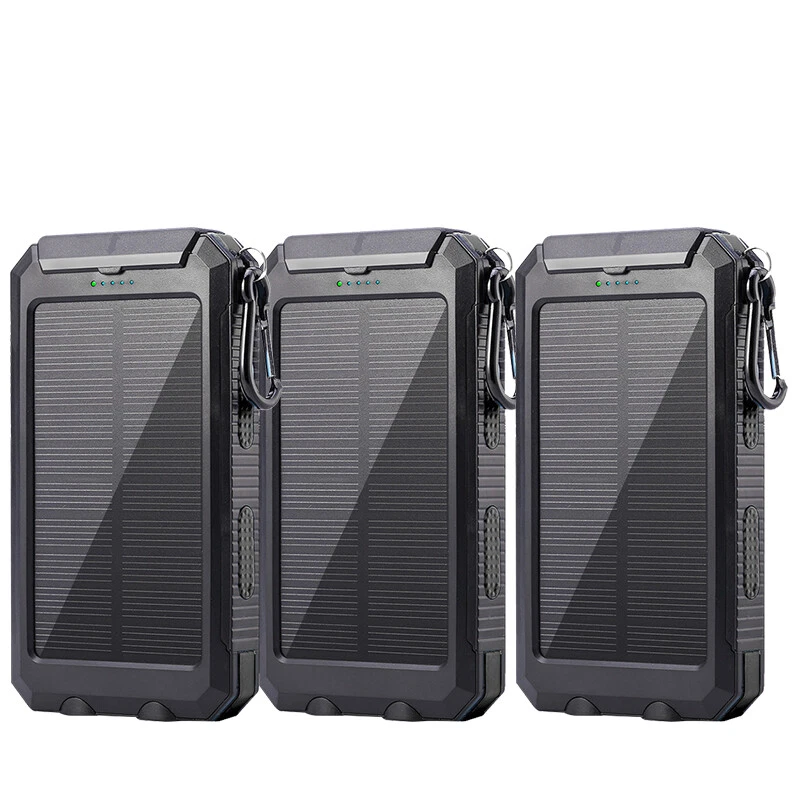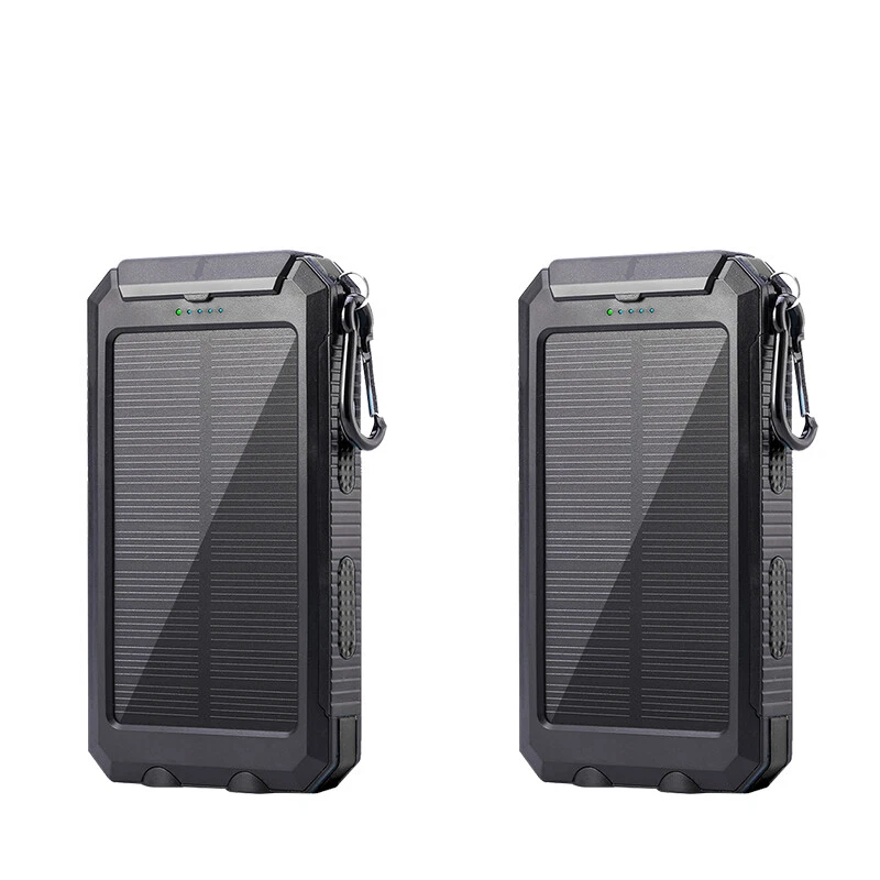 Specification Material: silicone/ flame retardant material Size: 163*82*20mm Li-polymer battery Input: DC 5V/1A Output 1: DC 5V/1A Output 2: DC 5V/2.1A About solar function: The sun will charge this charger to 100% but due to current technology and limited size of the solar panels and the Solar Insolation in your area, it could take 8-21 days for a full 0-100% charge. Kindly note: 1. In order to fully activate the battery, please charge it via outlet or computer for 10 hours at least at the first 2-3 uses. 2. The energy transformation from solar to electricity is rather slow and the solar charging speed is subject to sunlight intensity and panel conversion rate. In daily life, we highly recommend charge it via wall outlet. 3. Fully charging by outlet takes approximately 10 hours. Do not charge it all day nor over voltage. 4. For safety, DO NOT leave the power bank charging in car in case of high temperature and avoid crashing. Do not make charge while charging itself. 5. 20,000mAh is a theoretical capacity from the company.You can charge 3-5 times(depending on your devices conversion rate) at one go. Package 1/2/3/4x Solar Power Bank 1/2/3/4x Buckle 1/2/3/4x Charging cable Note: 10000000 mah is a theoretical capacity from the company.You can charge 3-6 times(depending on your phones conversion rate) at one go.we guarantee 3-4 times of charging capability.