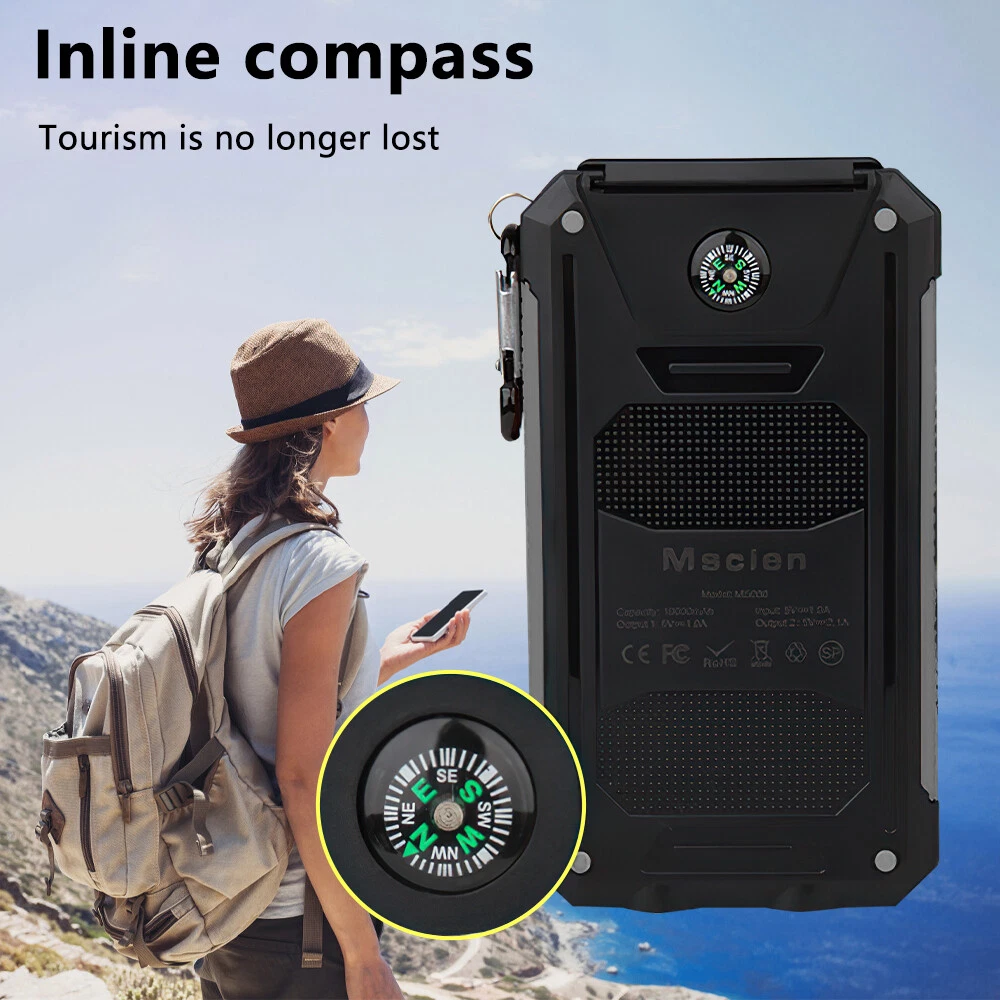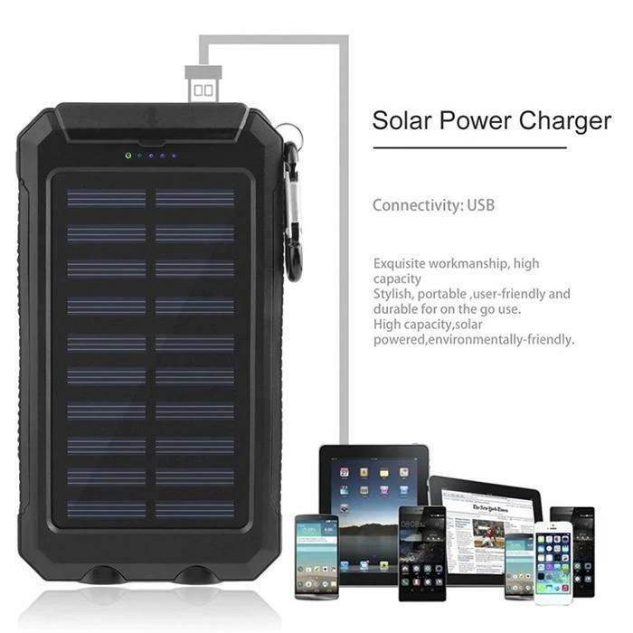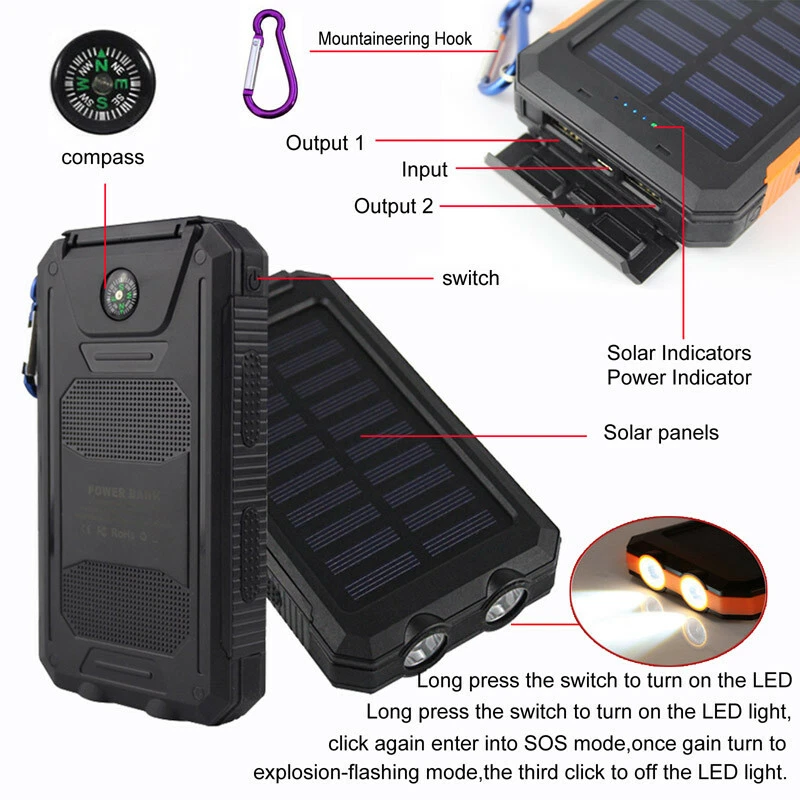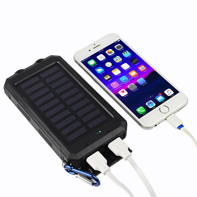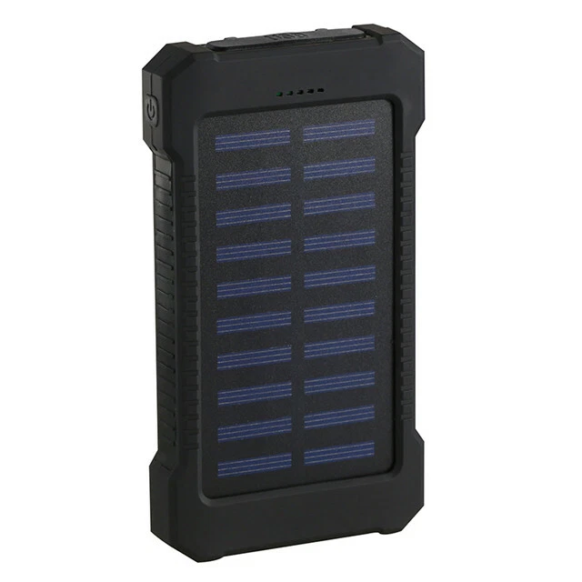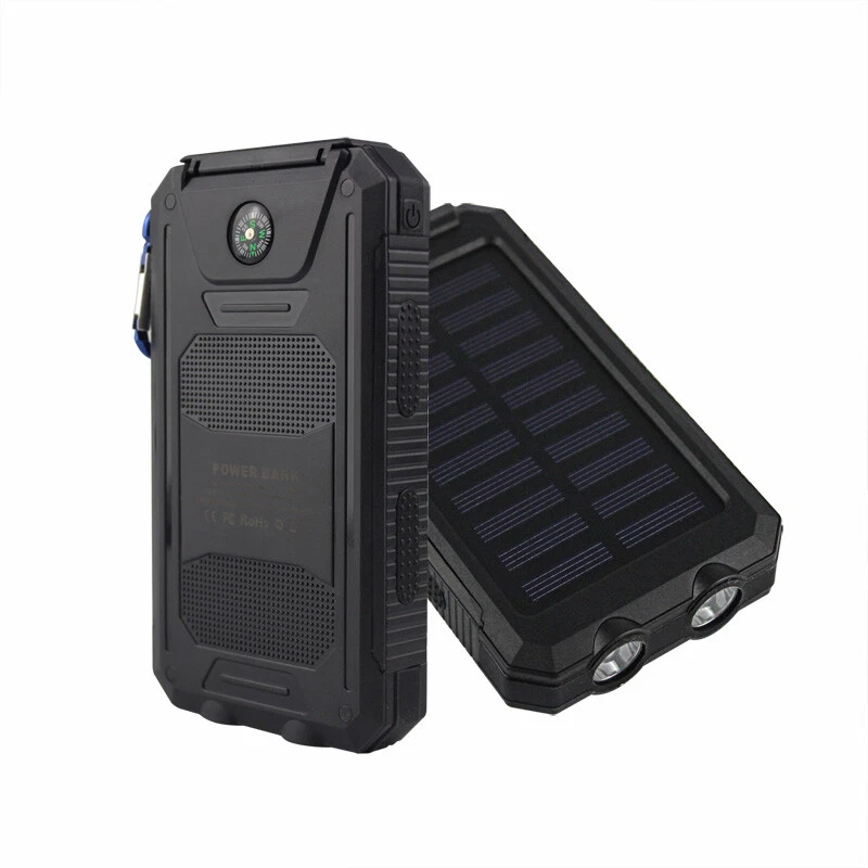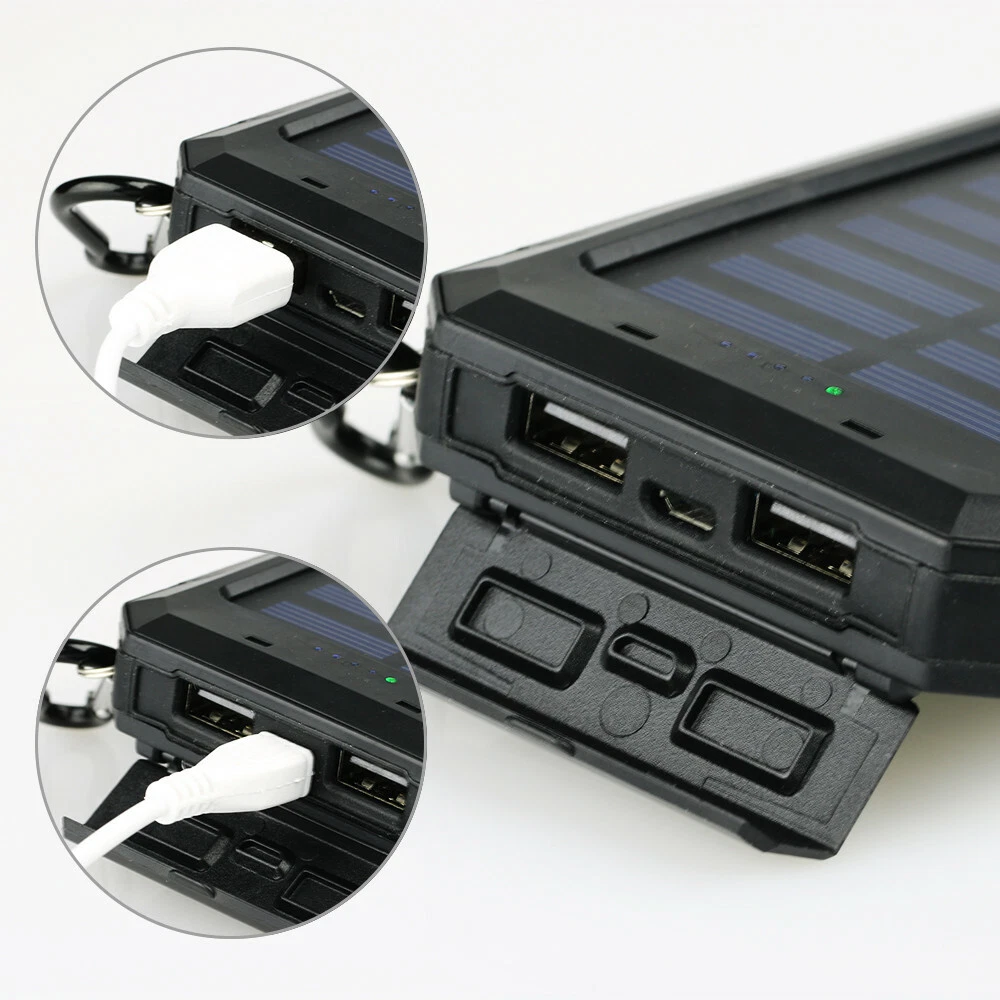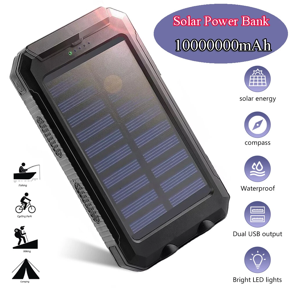Connectivity: Dual USB, Micro-USB MPN: Does Not Apply Voltage: 5V Design/Finish: Slim Compatible Model: Universal Features: Waterproof, Solar Charger Number of Ports: 2 Power Capacity: 1000000mAh Additional features: Multi-U output solar energy with LED flashlight Cable Length: NA Material: Plastic Color: Black Wireless Charging Standard: NA Compatible Brand: Universal Mounting Type: NA Brand: Unbranded Size: 140 x 77 x 22mm Type: Power Bank Type of battery: Lithium polymer battery