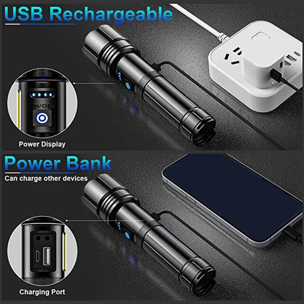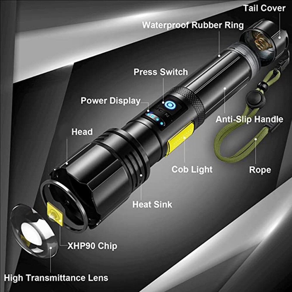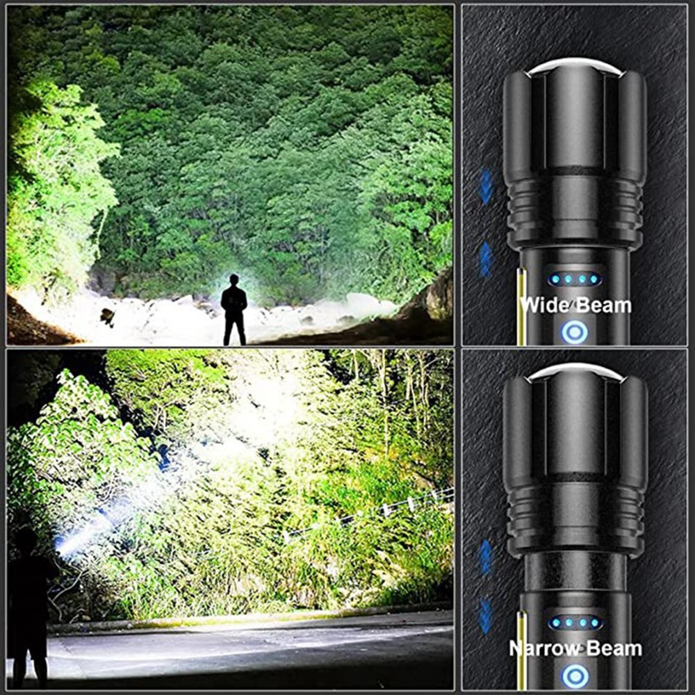Rechargeable Flashlight, 2 x 150000 High Lumen Super Bright Flashlights, 76231 150000 LUMEN FLASHLIGHT. 150000 lumen rechargeable flashlight is a powerful handheld flashlight with 7 light modes. The LED flashlight can light up MAX 1650 ft, and then the service life is more than 120,000 hours. Suitable for camping, hiking, night running, fishing, climbing, hunting, and other outdoor activities. 7 LIGHT MODES. LED flashlight has 3 main light modes:(high, medium, strobe) and 4 sidelights modes (high, medium, red light, red flashing light). Quickly press the on/off button twice to switch to the sidelights modes, one Key Turn off design can be directly turned off in any mode via long-press button 2s, no need to turn through all modes. Suitable for Hiking, camping, and hunting, it also can be used as a work light or warning light in an emergency. USB RECHARGEABLE & POWER BANK. Rechargeable flashlight equipped with large capacity rechargeable BATTERY, It can be continuously illuminated for 12 hours when fully . Also has a power output function, so you can use it as a mobile power supply to charge your device through the cable. In addition, the led flashlight power display light lets you know the power status of the handheld flashlights in real time. ADJUSTABLE FLASHLIGHT. This LED flashlight can switch the light mode by retracting the lamp . Can switch the lighting that you need light to adapt to different environments. IPX6 WATERPROOF & HIGH-QUALITY MATERIALS. Equipped with IPX6 waterproof technology, it is easy to use even in heavy rain or days. The body made of the powerful flashlight is made of high-quality aviation aluminum alloy, has impact resistance and is . size: 17 x 4.5 x 3cm Material: aluminum alloy colour: black Package Contents: 2 x strong flashlight 2 x charging cable 1 x Battery 1 x english manual