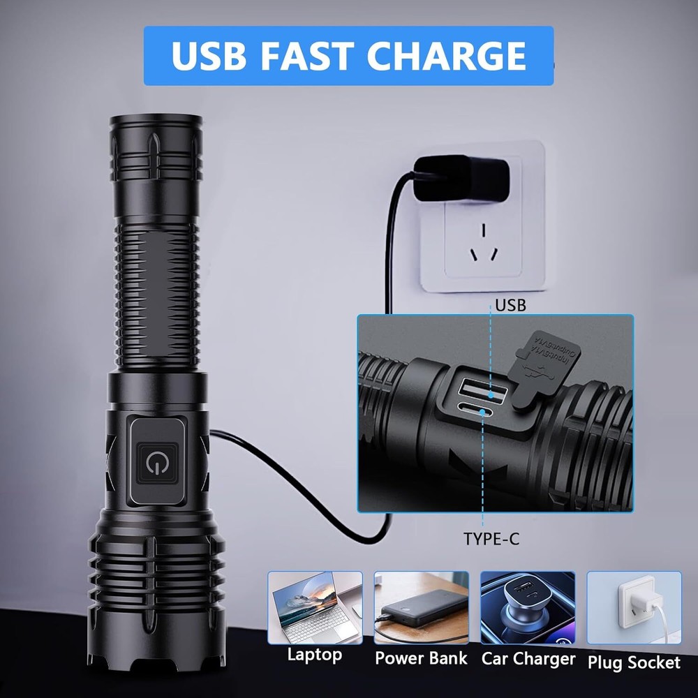 Flashlights High Lumens Rechargeable - 990000 Lumen Led Black Product Details Special Feature: Long Throw Flashlights High Lumens, Adjustable Focus LED Rechargeable Flashlight, Adjustable Light Modes, Rechargeable Flashlights, High Powered Flashlight Long Throw Flashlights High Lumens, Adjustable Focus LED Rechargeable Flashlight, Adjustable Light Modes, Rechargeable Flashlights, High Powered FlashlightLong Throw Flashlights High Lumens, Adjustable Focus LED Rechargeable Flashlight, Adjustable Light Modes, Rechargeable Flashlights, High Powered Flashlight See more Color: Black Power Source: Battery Powered Light Source Type: LED Rechargeable Flashlights Material: Aluminum 【Powerful flashlights & Brightest flashlight】:Rechargeable flashlights high lumens Built-in advanced super bright LED chip, with a powerful 990000 lumens output, its beam can pass through dust and fog well, especially suitable for foggy and rainy days with low visibility. It can easily illuminate light up a room up to 2000 square feet with ease. We can even focus on objects up to 1500 feet away, about the length of 3 football fields! A good led rechargeable flashlight suit is also makes the perfect gift for friends and family 【Upgraded Fast Charging】 This USB flashlight is equipped with 2 charging ports, a USB-C port for charging and a standard USB port for discharging, which can be used as a power bank in an emergency. When driving, you can connect the car charger to charge it. The rechargable flashlight can be charged and discharged more than 50000 times. 【Waterproof Flashlights】Led flashlight is made of aviation grade aluminium alloy. The solid body means excellent shock resistance, and even if run over by a truck it still works! Built-in high-stength sealing rubber waterproof ring, suitable for rain, snow or other bad weather. Waterproof, non-slip, and compact design make it a pocket flashlight for all outdoor activities, camping, hiking, fishing, and a powerful emergency flashlights 【5 Modes & Adjustable Focus】: This high powered flashlight has 5 modes: High/Medium/Low/Strobe/SOS. The smooth current conversion system can also better protect the flashlights chip, thus prolonging the service life. We can stretch the head to change the focal length and beam size, it has more powerful long throw in spotlight and wider field of view in floodlight 【Package 】 You will get: 1X rechargeable led flashlight, 1X USB universal charger, 1X USB charging cable, 1X storage box. You will be amazed by the brightness, quality, lifespan and performance of the led flashlight rechargeable