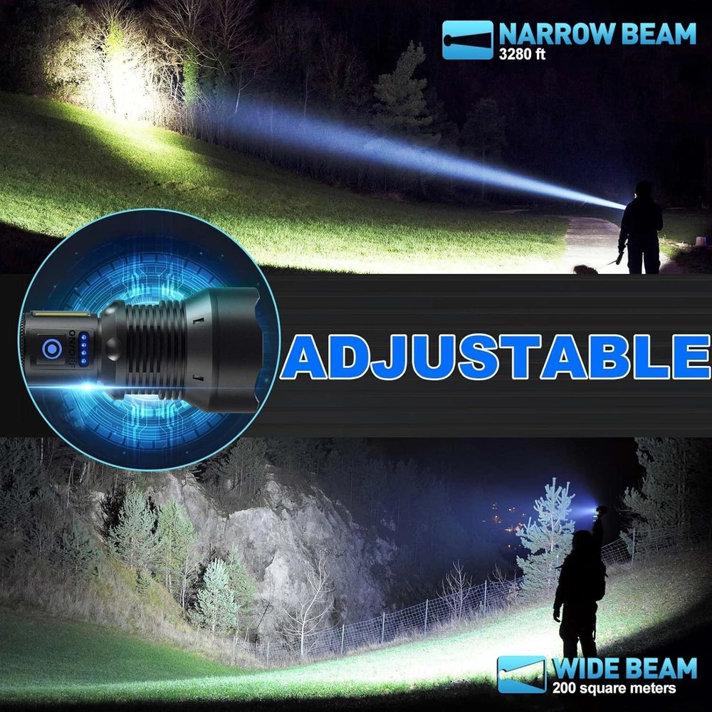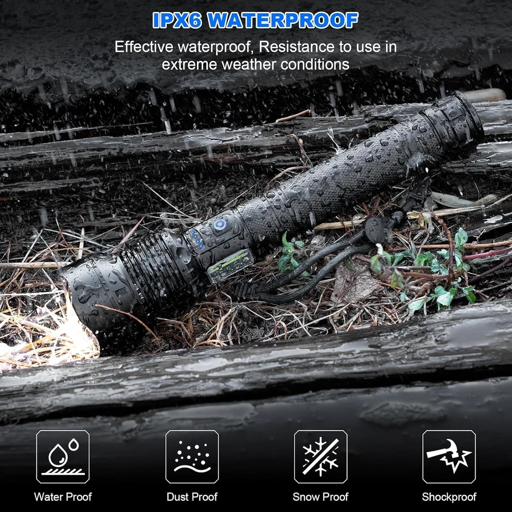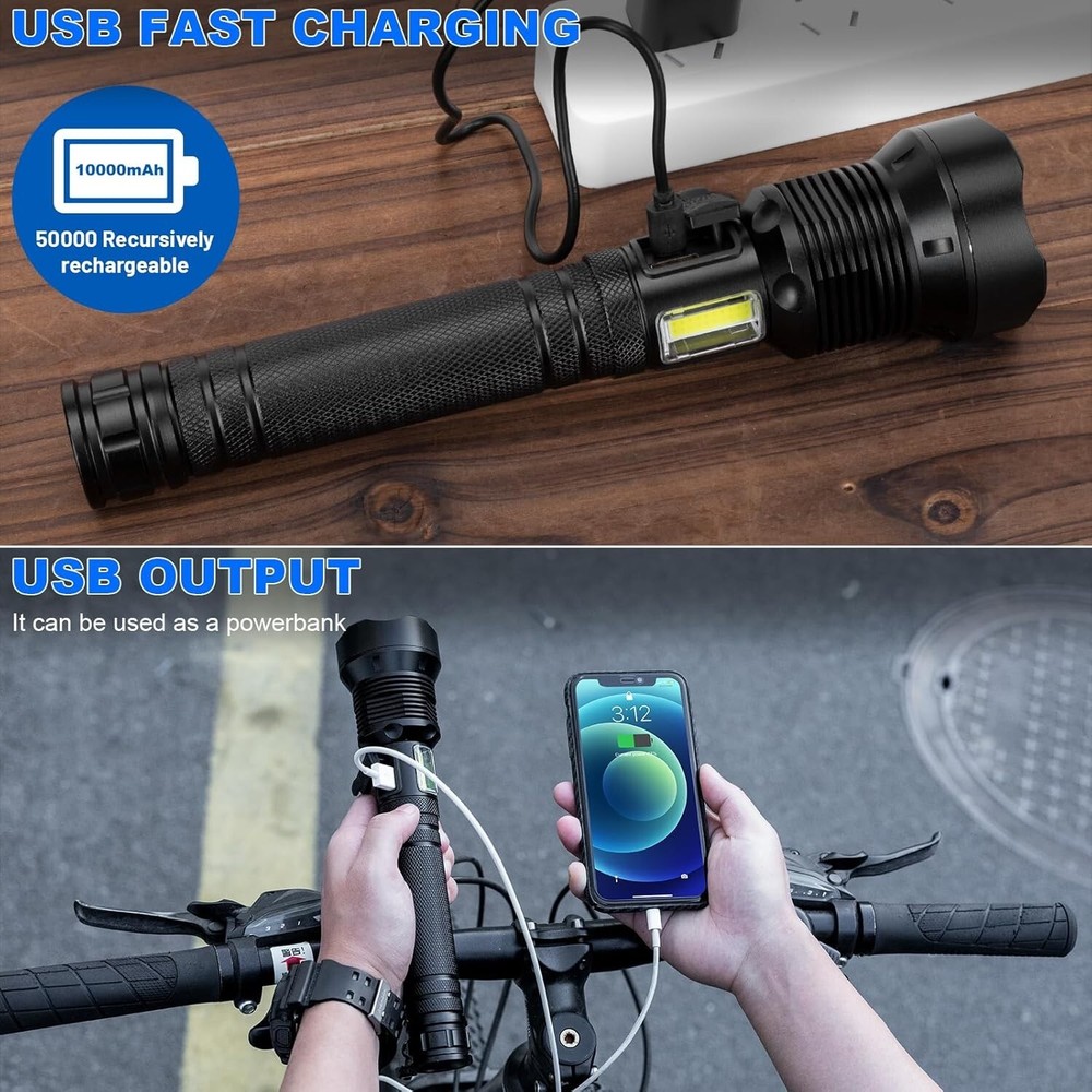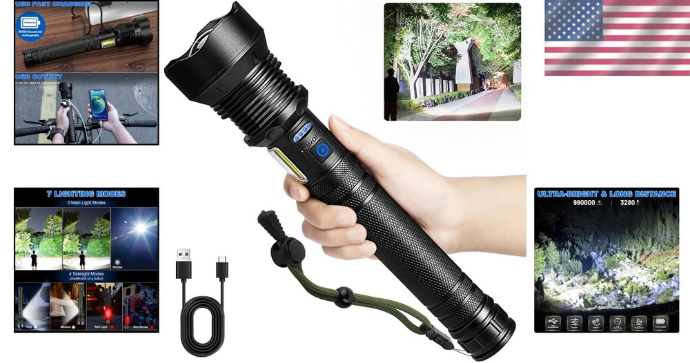 Super Bright 990,000 Lumens LED Flashlight - 7 Modes, Waterproof, Rechargeable ‹ › ‹ › ‹ › ‹ › ‹ › ‹ › ‹ › ‹ › ‹ › Super Bright 990,000 Lumens LED Flashlight Total Illumination: Equipped with upgraded LED wick, max output of 990,000 lumens . Wide Beam Projection: Illuminates spaces within 3280 feet , making it perfect for any situation. Rechargeable and Long-lasting: Powered by a 10,000 mAh battery , lasts 8-12 hours on a single charge. Multi-functional: Acts as a backup power source for phones and devices via USB output. 7 Lighting Modes: Features 3 main light modes (High, Medium, Strobe) and 4 COB work light modes (High, Medium, Red Light, Red Strobe). Adjustable Light Distance: Switch between wide and long-range lighting for optimal vision defense. Reliable Waterproof Design: Rated IPX6 , suitable for extreme weather conditions but should not be submerged in water. Compact & Portable: Made of aircraft-grade aluminum alloy, lightweight and durable for easy carry with lanyard. Experience Unmatched Brightness! Step into the light with the 990,000 Lumens LED Flashlight. Whether you're camping under a starlit sky, navigating through an emergency, or simply indulging in the outdoors, this flashlight provides the ultimate illumination experience. With features such as adjustable lighting distance and multiple modes, you'll be equipped for any situation. Enhanced Safety & Convenience Feel at ease knowing you have a reliable light source at your fingertips. Not only does this rechargeable flashlight beautifully light up your surroundings, but its robust design withstands the elements, making it your steadfast companion on every adventure. Why Choose This Flashlight? Don't settle for dim alternatives. With superior brightness and durability combined with the convenience of rechargeable power, this flashlight stands out as a must-have tool. Enjoy peace of mind, knowing you are well-prepared for whatever life throws your way. Elevate your outdoor experience – add the Super Bright 990,000 Lumens LED Flashlight to your gear today! Shipping Free & Fast Shipping - We offer free shipping to most of the USA with a normal delivery time of 3-7 days. However, due to the current situation, additional delivery time (up to 3 weeks) may be required for some items. Alternative Carriers - We may use alternative carriers (e.g. USPS, FedEx, UPS, etc.) to ensure your package arrives safely and on time. Due to the use of multiple carriers, we are unable to provide a tracking number automatically. Handling Time - Orders are processed and shipped within 1-2 business days of receiving cleared payment. Shipping Restrictions - Shipping to Alaska, Hawaii, Puerto Rico, Guam, and other US territories may incur shipping charges or delivery restrictions. Please contact us before ordering, or your order can be refunded/cancelled. State Restrictions - There may be restrictions based on your state of purchase. For example, certain items may not be shipped to California due to state regulations. Contact for Tracking Updates - If you require tracking updates or have any concerns about the delivery of your order, please feel free to contact us, and we will be happy to assist you. Return Please see our eBay Return Policy. Thank you. Payment We accept all major credit cards, PayPal, and Apple Pay for your convenience. Your payment information is secure and encrypted to ensure a safe and seamless transaction. Please complete your payment within 3 days of purchase to avoid any delays in shipping. Feedback Your feedback is extremely important to us. We strive to provide the best products and customer service possible. If you are satisfied with your purchase, please take a moment to leave us a positive review. If you have any concerns or issues with your order, please contact us before leaving negative feedback. We are committed to resolving any problems and ensuring your satisfaction. Contact Us If you have any questions or concerns, please feel free to reach out to our customer support team. You can contact us through the eBay messaging system. We are available Monday to Friday, 9:00 am to 5:00 pm EST, and we will do our best to respond to your inquiry within 24 hours. Thank you for supporting our small family business! UPC: Not Set Voltage: 5V Item Height: Not Set Item Length: Not Set Item Weight: 1.37 pounds Item Width: Not Set Model: Not Set Lumens: 990000 Number of LEDs: 1 Unit Quantity: 1 Material: Aluminum,Rubber Features: Batteries Included,Handheld,Rechargeable,Waterproof Brand: Unbranded Type: Flashlight Lighting Technology: LED Power Source: Battery Operating Range: 3280 feet MPN: Not Set Battery Technology: NiCad Number of Batteries: 1 Color: Black Country/Region of Manufacture: Not Set Operating Time: 8-12 Hours IP Rating: IPX6 Number of Lights: 1-3 Unit Type: Unit Personalize: Not Set