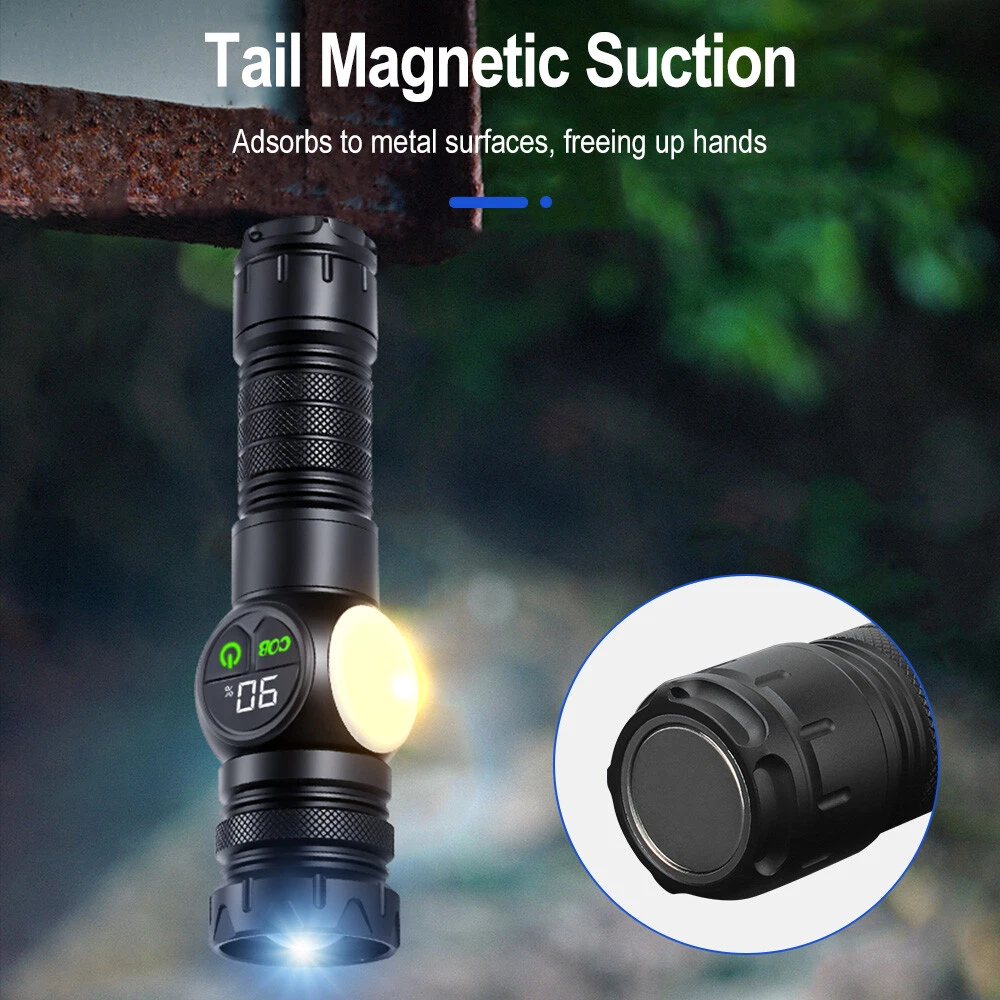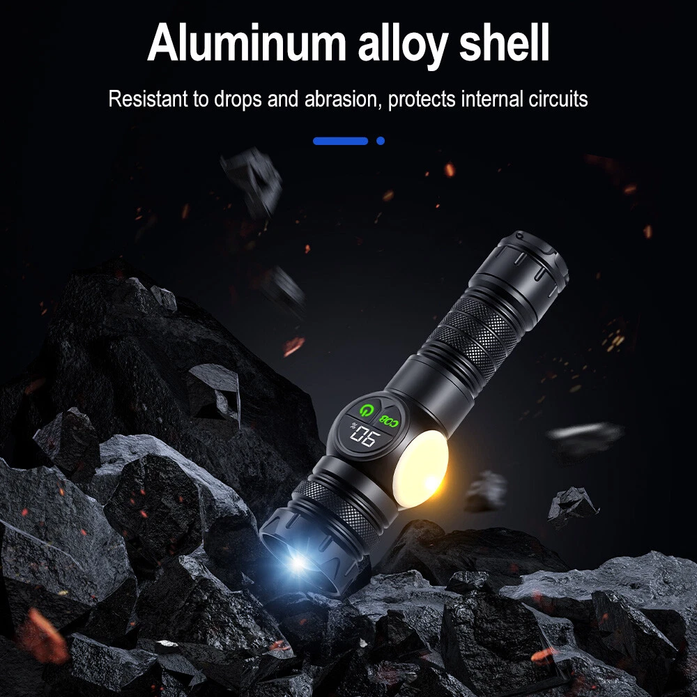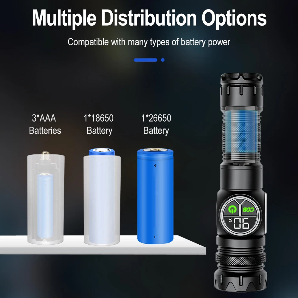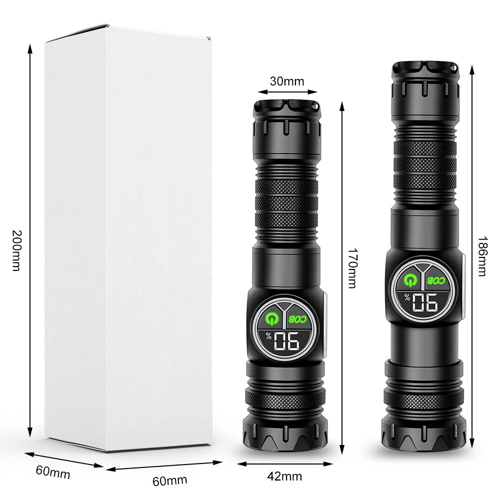 Product Description: Material: High-quality aviation-grade aluminum alloy material + convex lens lens, anti-rust and anti-fall, long service life. Process: The surface is hard oxidized, wear-resistant, not scratched, and feels good. Design: The strong magnetic design at the tail of the flashlight can be adsorbed to any iron object, freeing hands. Charging Method: Smart USB charging, compatible with a variety of charging methods, can be used in computers, vehicles, charging plugs, etc., and can also be used as a mobile power source for emergency charging of electronic products when necessary. Use Battery: The internal wiring of this product adopts a high-efficiency booster circuit to maximize the use of the battery. You can use 1 3.7V rechargeable battery, or you can use 3 AAA batteries, you can choose according to your preference. Power Display: LED power display the power consumption jumps and decreases in turn, the LED flashes when charging, and the LED is fully on when fully charged. Lighting Method: Level 5 main light: super bright, strong light, medium, SOS, strobe 4-level COB light: white light strong light / white light weak light / red light strong light / red light flashing Any gear, long press to turn off Suitable for: Hiking, camping, self-defense, teaching, searching, hunting, daily carry, night riding, caving, night fishing, patrol and various outdoor activities. Specification: Colour: Black Lamp beads: LED+COB LED Power: 20W Lumen: 10000LM Charging method: Type-C charging Use battery: 3*AAA battery(NOT included) /1x 3.7V Battery(included) Zoom mode: telescopic zoom Maximum range: 200-500 meters Waterproof grade: IPX4 Size: 6.69*1.65*1.37 inch Gross weight: 217g Type of Packaging: 1* flashlight 1* charging cable 1* battery compartment 1* anti-lost rope 1* battery