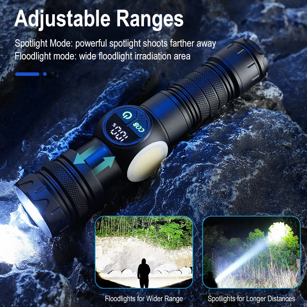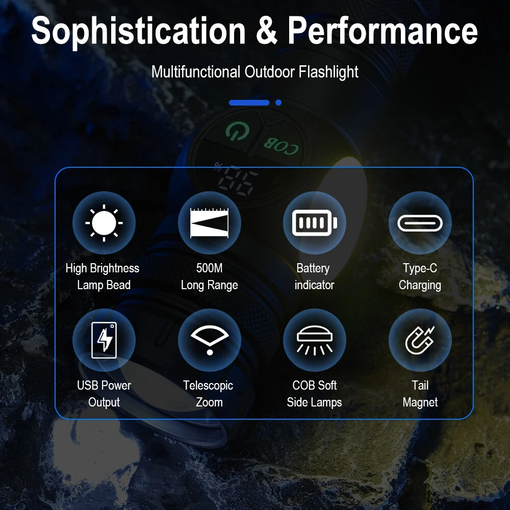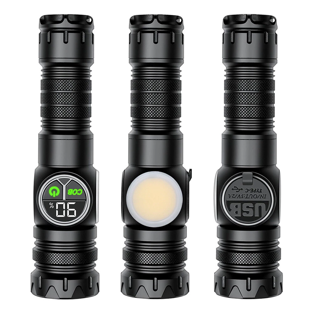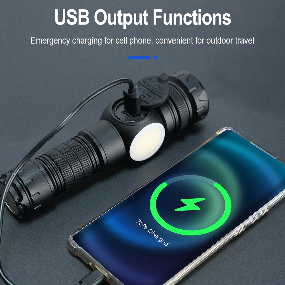 Product Description: Material: High-quality aviation-grade aluminum alloy material + convex lens lens, anti-rust and anti-fall, long service life. Process: The surface is hard oxidized, wear-resistant, not scratched, and feels good. Design: The strong magnetic design at the tail of the flashlight can be adsorbed to any iron object, freeing hands. Charging Method: Smart USB charging, compatible with a variety of charging methods, can be used in computers, vehicles, charging plugs, etc., and can also be used as a mobile power source for emergency charging of electronic products when necessary. Use Battery: The internal wiring of this product adopts a high-efficiency booster circuit to maximize the use of the battery. You can use 1 3.7V rechargeable battery, or you can use 3 AAA batteries, you can choose according to your preference. Power Display: LED power display the power consumption jumps and decreases in turn, the LED flashes when charging, and the LED is fully on when fully charged. Lighting Method: Level 5 main light: super bright, strong light, medium, SOS, strobe 4-level COB light: white light strong light / white light weak light / red light strong light / red light flashing Any gear, long press to turn off Suitable for: Hiking, camping, self-defense, teaching, searching, hunting, daily carry, night riding, caving, night fishing, patrol and various outdoor activities. Specification: Colour: Black Lamp beads: LED+COB LED Power: 20W Lumen: 10000LM Charging method: Type-C charging Use battery: 3*AAA battery(NOT included) /1x 3.7V Battery(included) Zoom mode: telescopic zoom Maximum range: 200-500 meters Waterproof grade: IPX4 Size: 6.69*1.65*1.37 inch Gross weight: 217g Type of Packaging: 1* flashlight 1* charging cable 1* battery compartment 1* anti-lost rope 1* battery