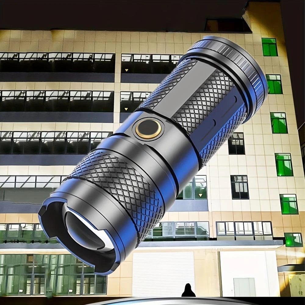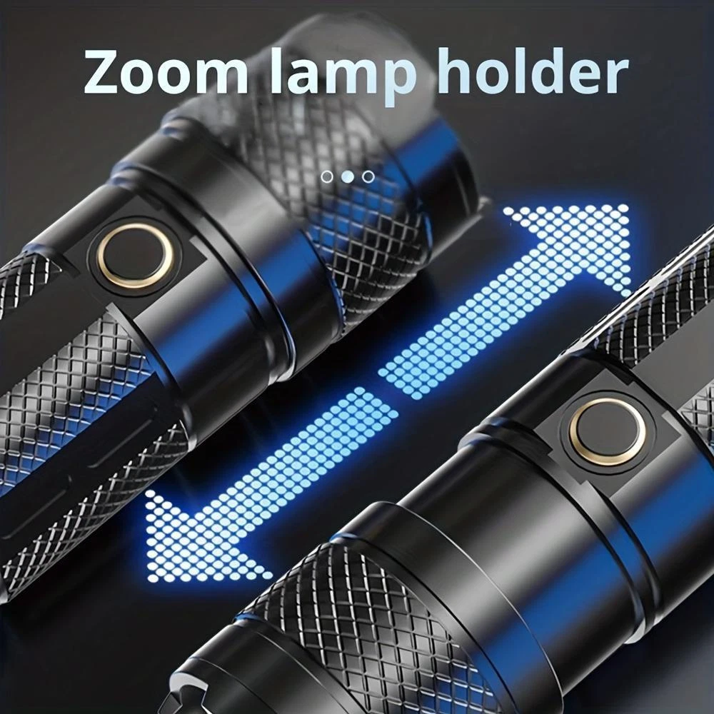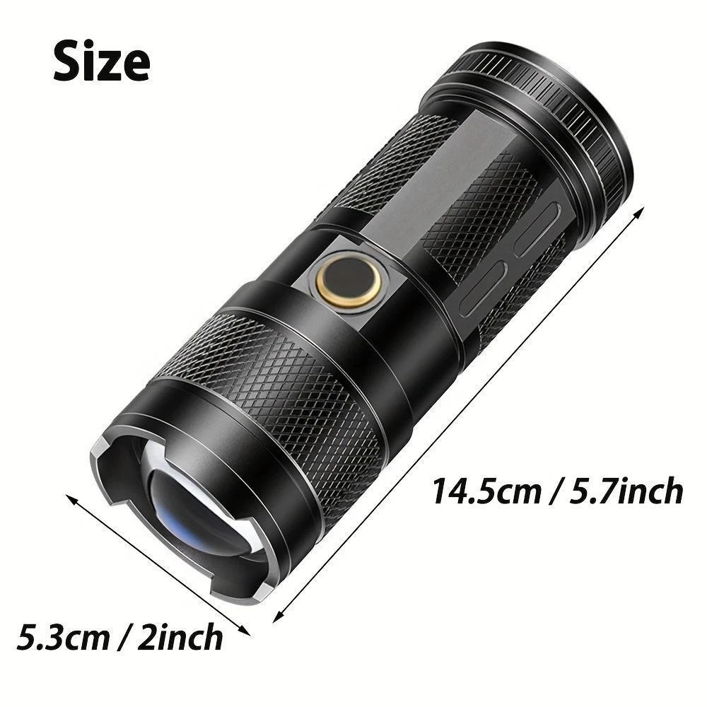 Product Description: 1. high brightness spotlight core, new zoom, high beam without grille, tail soft lighting, power outage can be used in emergency. 2. five-stage light change: strong light - medium light - low light - burst flash - SOS distress. 3. Free switching, infinitely telescopic zoom, contraction of the light that is floodlighting. 4. Tail light adopts 6 SMD chip lamp beads, translucent frosted lampshade luminescence is soft and not blinding, suitable for emergency reading and writing in case of power failure. 5.Type-c fast charging design, fast charging, long service life. 6.Lotus style attack lamp head, quickly break glass, can easily break car glass in emergency. 7.Life-grade waterproof, strong isolation of dust, dirt and water damage. Product Specifications: Light source colour: white light Gear: strong light / medium light / low light / burst flash / SOS. Control mode: intelligent one button switch Charging method: Type-c fast charging Size:145mm x 53mm Waterproof function:IPX3 Focus Mode:Telescopic focusing Material:ABS Lighting time:5-12 hours Package Includes: 1*Flashlight