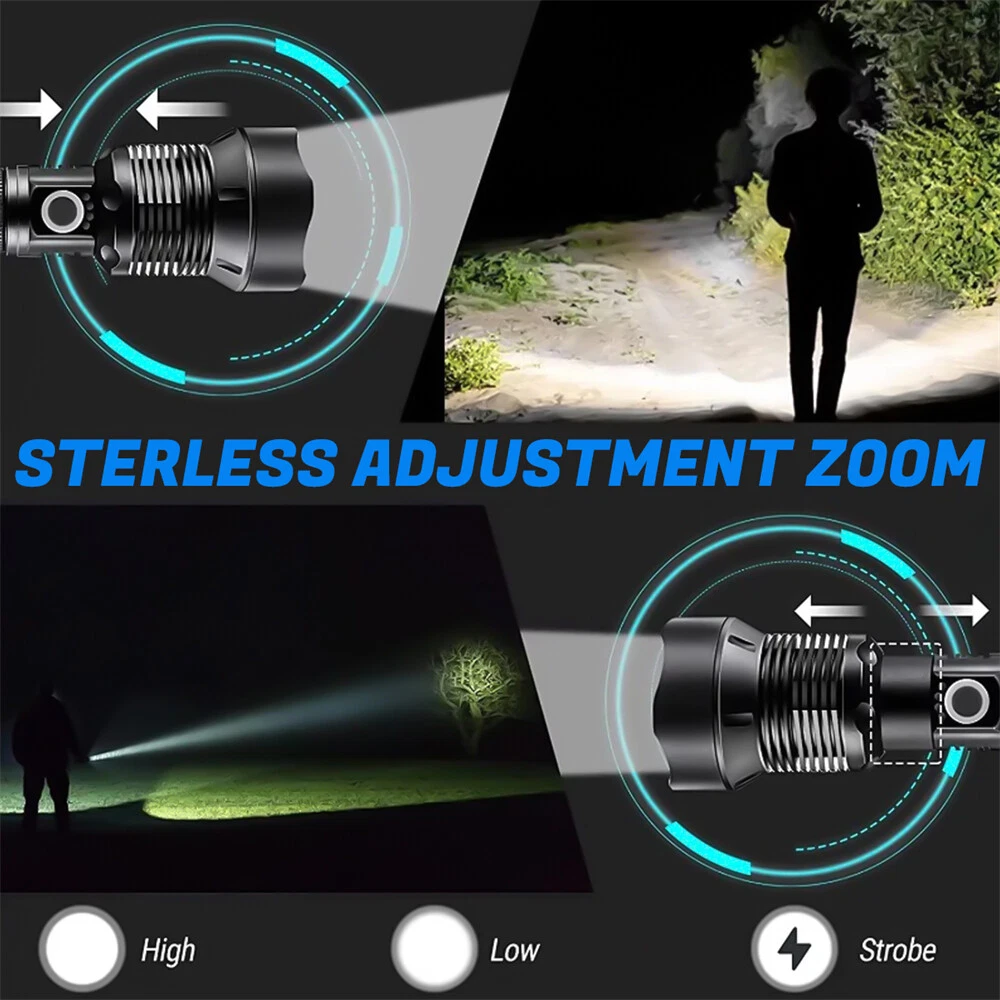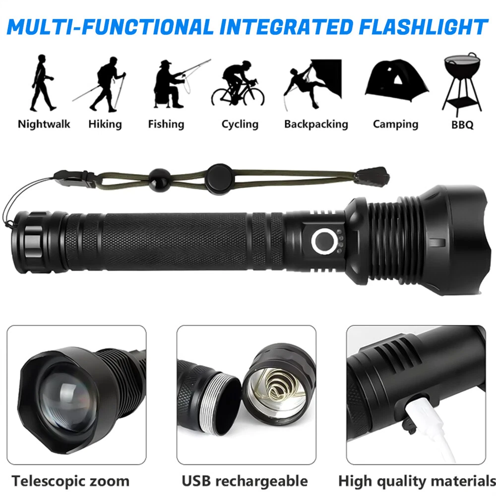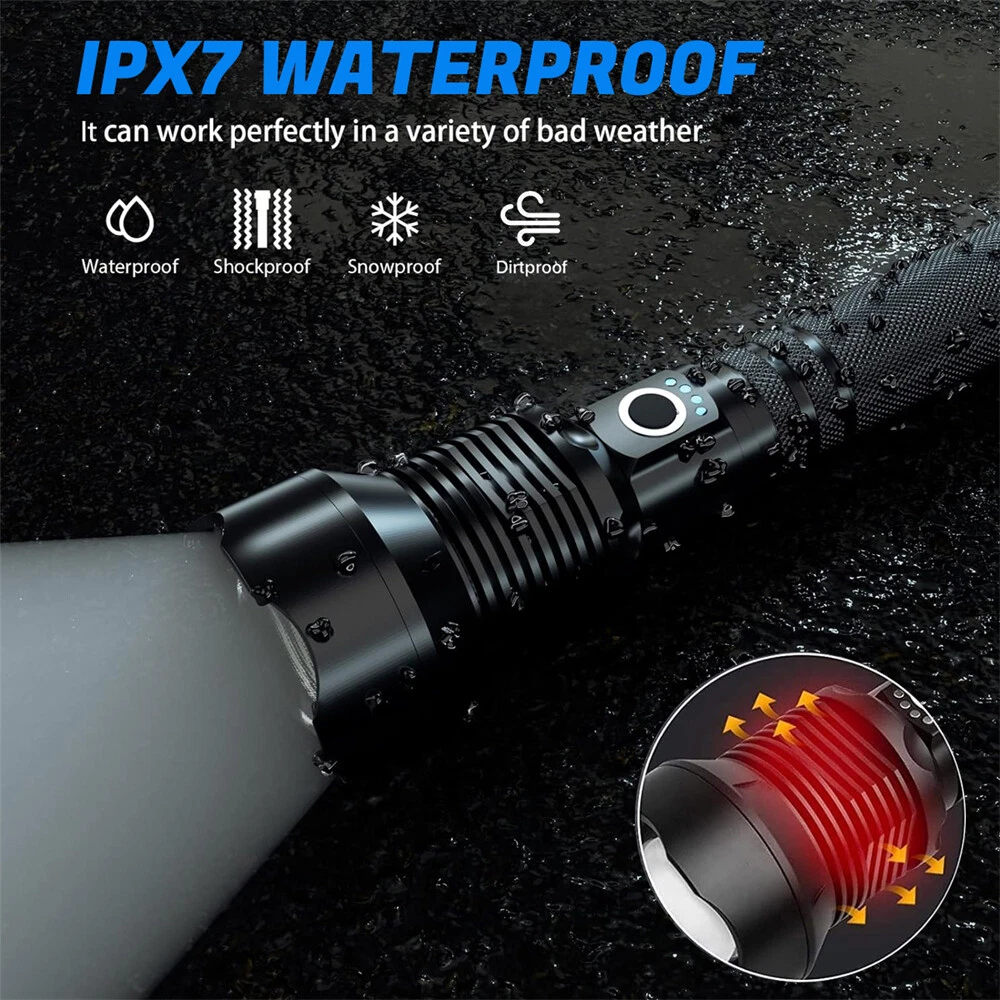 【Better & Brighter】 Hold the long and wide flashlights body in your hand and experience the comfort of holding it. Brightest flashlight can generates an ultra-high output up to 9,000,000 lumens, sweeps bright light over the length of about two football fields and reaches nearly 1093 yard/3280 feet. 【5 Modes】 High lumen flashlight with 5 modes: low brightness,medium brightness,high brightness,strode brightness and sos function, you can switch at will, adapt to different environments of lighting. 【Rechargeable Flashlight & Power Display】 Conveniently powered for rechargeable Βattery. Built in Mrico input port, allows you charging the flashlight conveniently. In addition, rechargeable flashlight have a power display function, so that you can see the power at a glance. 【IP65 Waterproof Material】 Non-slip and IP65 waterproof led flashlight are suitable for outdoor environment and adverse weather conditions. Made of aluminum alloy, protect your heavy duty flashlights from scratched, corrosion, rust, and break. 【Worry-Free After-Sales Sevices】 Try it and you will love it. If you are not satisfied with our product, please feel free to contact our excellent customer support team. Package Contains: 1 x Flashlight 2 x 26650 Battery 1 x USB Cable
