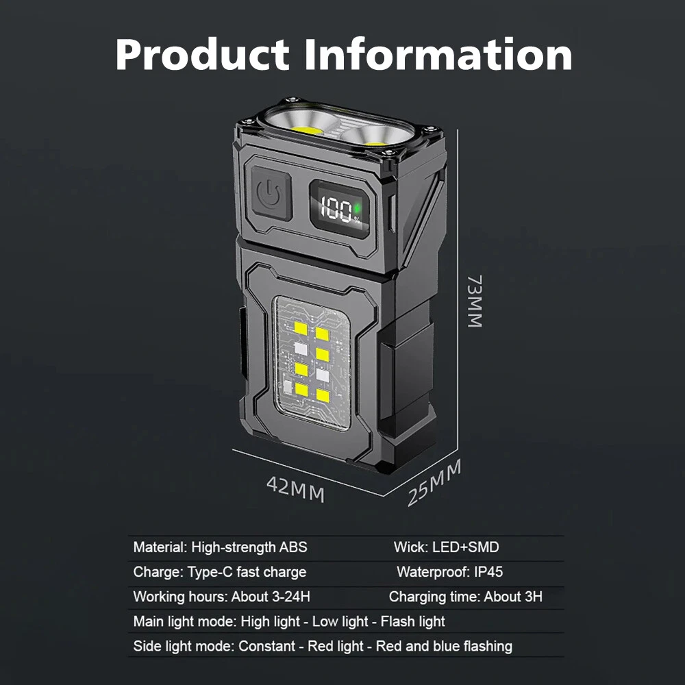 Picture Gallery Description Features: Multi functional lighting: This flashlight can not only serve as a car inspection light, but also as a work light, suitable for various occasions such as home maintenance, outdoor exploration, and nighttime walking. Its versatile design allows you to obtain the necessary lighting in different environments, reducing the number of tools you carry and improving usability. Portable Mini Design: The lightweight size (suitable for carrying in pockets, backpacks, or toolboxes) and light weight make this flashlight perfect for carrying around. Whether for daily use or travel, it can easily adapt, ensuring that you can quickly access it when needed and meet your lighting needs anytime, anywhere. Fast charging and long battery life: Equipped with Type-C USB charging interface, compatible with various modern device charging cables, making charging more convenient and fast. Built in 800mAh polymer battery, supports long-term use, ensuring that you will not lose lighting due to low battery in critical moments, suitable for long-term outdoor activities or emergency situations. Waterproof and durable: Adopting IPX4 waterproof design, it ensures normal use even in rainy or humid environments, suitable for outdoor exploration, camping and other activities. The high-strength shell is impact resistant and can withstand accidental drops and impacts, ensuring the long-term stability of the flashlight and reducing the need for maintenance and replacement. Intelligent lighting mode: Equipped with advanced LED COB technology, it provides 8 different lighting modes, including strong light, soft light, flashing, etc., to meet the lighting needs of different occasions. The intelligent battery level indicator function allows you to keep track of the remaining battery level at any time, avoiding accidents during use. At the same time, it can automatically adjust the brightness according to the ambient light, improving the user experience. Specifications: Net weight of the product: around 80 grams Product wick: LED+COB Charging method: Type-C fast charging Battery display: 100% -75% -50% -25% Battery capacity: Built in 800Mah lithium battery Waterproof grade: IPX4 Product size: 81 * 45 * 26mm Product Material: ABS+Aluminum Alloy Features: Strong magnet at the bottom/back pen clip/rotatable Package List: 1 x flashlight 1 x USB charging cable 1 x Instruction manual Shipping Policy Payment Policy Return Policy Shipping Policy 1. We only ship to confirmed PayPal addresses. 2. Economy Shipping, with no tracking number. Standard Shipping, with tracking number. Express (Expedited) Shipping, with tracking number. 3. Economy shipping needs 2-5 weeks to arrive mostly. In rare case, it can take up to 6-8 weeks. It depends on your location and local postal service, as well as the weather condition along the shipping. 4. If you need a faster delivery time, you could choose Express (Expedited) Shipping. If you need a tracking number, you could choose Standard Shipping. Payment Policy We accept PayPal only. We only ship item to your PayPal verified address. Please pay attention that import duties, taxes and charges are not included in the item price or shipping charges. These charges are the buyer's responsibility. Please check with your country's customs office to determine what these additional costs will be prior to bidding/buying. Return Policy 1. We offer 60 day money back or replacement guarantee. In addition, it allows customers to return new and unused products in their original factory condition for any reason within 60 days from the date of purchase. 2. Although we test each item and they are packed professionally, few item (less than 0.1%) might be damaged during the shipping. Please feel free to contact us within 4 days after you receive your package about replacement. 3. If you don't receive items over 35 days, please make sure to contact us before leaving any neutral or negative feedback. We'll try our best to help you solve the problem. If we authorized the return, customers will get an email with instructions for returning the item. Email will be replied within 24 hours on Chinese business hours. On Jan 13, 2025 at 22:08:52 PST, seller added the following information:
