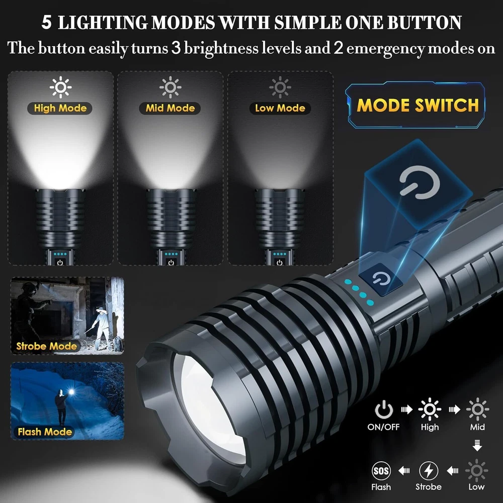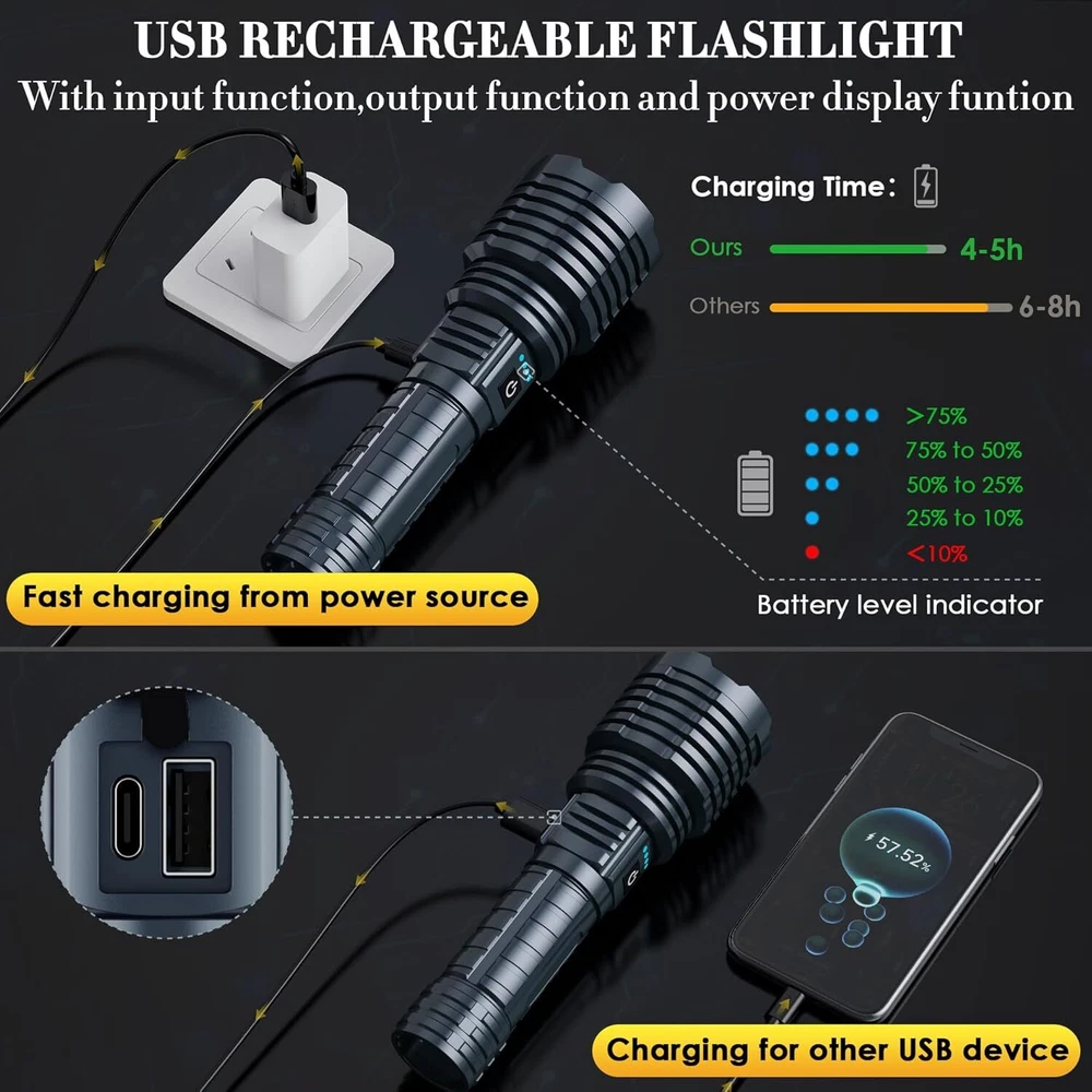 Product Description Super Bright Rechargeable Flashlights 2400000 High Lumen, Powerful LED Flashlight, IPX7 Waterproof Floodlight & Spotlight Flashlight 2-in-1 W/5 Modes for Camping, Emergency, Search & Rescue 【2023 Brightest Flashlight EVER】 led flashlight is powered by New Upgraded XHP160-A8 LED, the maximum output power is up to 2400000 high lumens, 60 times brighter than ordinary LED flashlights high lumens. And the maximum illumination distance can reach 2000 meters (5000 feet), could illuminate a wide area of 5000 square feet easily. 【USB Rechargeable Flashlights 】: This rechargeable flashlight is built-in Fast Charging Technology as well as Output Function, allows you charging the flashlight from a power bank, computer, car charger, wall charger, etc.conveniently.While the USB output port allows the flashlights to be used as a backup mobile power source for your phone and other devices. 【Long-lasting Flashlights with Power Reminder】Including one 5000mAh battery, the flashlights high lumens rechargeable usually takes 4.5 hours to fully charge. It can be used for 31 hours for a long time after a single charge.In addition, the led flashlight rechargeable has a power display function, Blue indicates high power or full charged and red indicates it's in charging or needs to be charged. 【5 Modes Floodlight + Spotlight Flashlights】:Our high lumen flashlight has 5 lighting mode and simple one buttons(independent function button & switch button). With a convex lens, we could Push the head in for floodlight flahslight and Pull the head out for spotlight flashlight. 【Powerful Handle Flashlights Waterproof】The camping flashlight is made of aviation-grade aluminum alloy, and the thick texture is reassuring, protect your heavy duty flashlights from scratched, corrosion, rust, and break. The whole body structure provides excellent heat dissipation. About Us We are a reputable seller with many years of experience selling on eBay. Our goal is to provide high-quality products and excellent customer service. Shipping Items will be shipped within 1-3 business days when we received payment. (Orders are not processed on weekends & holidays) Tracking information will be sent once item is shipped. Delivery time depends on destination and other factors Item is shipped to ebay address. Leaving correct address can minimize delay. For international shipping and shipping to Guam, Hawaii and Alaska, Please contact us before placing the order. International buyers please note: Import duties, taxes and charges are not included in the item price or shipping charges. These charges are buyer’s responsibility. We will try our best to reduce the risk of the custom duties. Local pick-up is unavailable at the moment. Contact Us We reply any email messages within 1 business / working days(off-duty at weekend). If you do not get a response from us, then please check your junk or spam mailbox. Our Business hours: Mon-Fri 9:00-18:00, UTC/GMT +8 hours. Please contact us either by clicking "contact seller" in the "purchase history" section or simply click "ask a question" at the bottom of this page. If you are unsatisfied with our item or service, please contact us before leaving any feedback. We are committed to resolve all issues in a friendly and satisfactory manner.