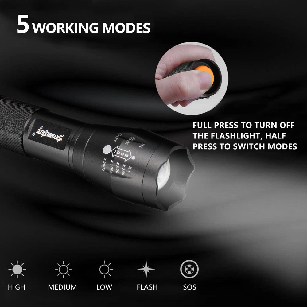 Home Payment Return Policy About us Contact us Details Super Bright Small LED Torch LED Flashlight Mini Working Flashlights Zoom 2000LM ‼️‼️【Note】 Batteries not included, please feel free to contact us if any need. Features: 1. [SUPER BRIGHT WITH 5 MODES] : The super bright flashlight LED uses advanced LED beads, emits bright light up to 2000 lumens and reaches nearly 656ft, it can easily light up an entire room! Adjustable/zoomable focus with 5 modes: High- Medium- Low- Strobe- SOS (for Emergency). 2. [WATERPROOF]: The small LED flashlight can be used in any weather. The aluminum alloy body has no rust issue. The flashlight high lumens super bright waterproof can be daily used, like troubleshooting, biking, hiking, camping, walking dog, or for emergency, survival, etc... 3. [ADJUSTABLE FOCUS]: Our handheld flashlights tactical torch utilize the latest durable LED chip, provides super bright light beam. Easy-controlled head-pulling zoom and easy mode-switch by light taps of button. Adjustable focus for use in different situations it ideal for use around the house 4. [PREMIUM QUALITY & LONG-LASTING]: Our flashlight super bright is made of high quality aluminum alloy, this super bright LED Flashlight is solid and sturdy, the edge designed is sharp and strong, can easily break the windows in case there's a car accident. Specification: Type of flashlight: Super Bright LED Flashlight Small LED Type: LED Output Power (max): 10W Power by: 1x 3.7v Li-ion Rechargeable Battery (Not included) Size: 4.80 x 1.06 x0.95 inches Material: Aluminum Weight: 2.5 ounce Function: Zoomable Light Mode: High/Medium/Low/Strobe/SOS Warm Tips: 1. Before use, please remove the the plastic packaging film of the battery. 2. Please take out the battery if you won't use for a long time to avoid battery leakage. 3. Please do not submerged handheld super bright zoomable LED flashlight underwater as it doesn't 100% waterproof. 4. Please select a lower setting when the LED flashlight super bright torch zoomable is hot as it is typical for high powered led flashlight and will not cause damage to the handheld flashlight. 5. Don't directly illuminate the eyes. Note:Please find us in first time when you find the parcel Broken/Scratch/Function Error/Miss Parts/Unwork/has not arrived etc, we always have more details and solutions, even duty for your order. Package includes: 1x Super Bright LED Flashlight Small (not included battery) Shipping Policy Payment Method Returns Policy Shipping Policy Payment Method This is the description of Payment Method. Do not dismiss your dream. To be without dream is to be without hope. To be without hope is to be without purpose. Do not run through your life so fast that you forget not only where you have been, but also where you are going. Life is not race, but a journey to be savored each step of the way. Returns Policy This is the description of Returns Policy. Do not dismiss your dream. To be without dream is to be without hope. To be without hope is to be without purpose. Do not run through your life so fast that you forget not only where you have been, but also where you are going. Life is not race, but a journey to be savored each step of the way. Store Categories Store Categories Battery and Charger Led Flashlight Led Headlamp Laser Pointer Pen Other Home Payment Shopping About Us Contact Us Copyright©2018 datacaciques Tokeyla Home Payment Return Policy About us Contact us Details Super Bright Small LED Torch LED Flashlight Mini Working Flashlights Zoom 2000LM ‼️‼️【Note】 Batteries not included, please feel free to contact us if any need. Features: 1. [SUPER BRIGHT WITH 5 MODES] : The super bright flashlight LED uses advanced LED beads, emits bright light up to 2000 lumens and reaches nearly 656ft, it can easily light up an entire room! Adjustable/zoomable focus with 5 modes: High- Medium- Low- Strobe- SOS (for Emergency). 2. [WATERPROOF]: The small LED flashlight can be used in any weather. The aluminum alloy body has no rust issue. The flashlight high lumens super bright waterproof can be daily used, like troubleshooting, biking, hiking, camping, walking dog, or for emergency, survival, etc... 3. [ADJUSTABLE FOCUS]: Our handheld flashlights tactical torch utilize the latest durable LED chip, provides super bright light beam. Easy-controlled head-pulling zoom and easy mode-switch by light taps of button. Adjustable focus for use in different situations it ideal for use around the house 4. [PREMIUM QUALITY & LONG-LASTING]: Our flashlight super bright is made of high quality aluminum alloy, this super bright LED Flashlight is solid and sturdy, the edge designed is sharp and strong, can easily break the windows in case there's a car accident. Specification: Type of flashlight: Super Bright LED Flashlight Small LED Type: LED Output Power (max): 10W Power by: 1x 3.7v Li-ion Rechargeable Battery (Not included) Size: 4.80 x 1.06 x0.95 inches Material: Aluminum Weight: 2.5 ounce Function: Zoomable Light Mode: High/Medium/Low/Strobe/SOS Warm Tips: 1. Before use, please remove the the plastic packaging film of the battery. 2. Please take out the battery if you won't use for a long time to avoid battery leakage. 3. Please do not submerged handheld super bright zoomable LED flashlight underwater as it doesn't 100% waterproof. 4. Please select a lower setting when the LED flashlight super bright torch zoomable is hot as it is typical for high powered led flashlight and will not cause damage to the handheld flashlight. 5. Don't directly illuminate the eyes. Note:Please find us in first time when you find the parcel Broken/Scratch/Function Error/Miss Parts/Unwork/has not arrived etc, we always have more details and solutions, even duty for your order. Package includes: 1x Super Bright LED Flashlight Small (not included battery) Shipping Policy Payment Method Returns Policy Feedback About US Shipping Policy Products would be shipped from Local US warehouse. Usually takes 2-5 days