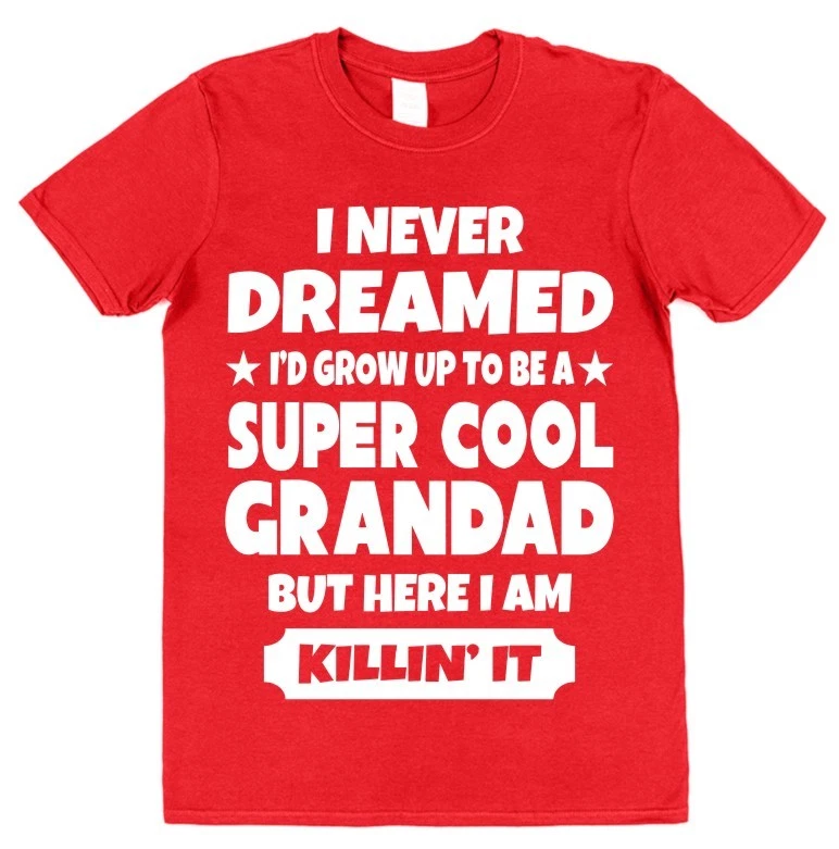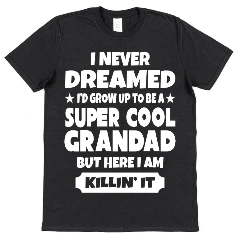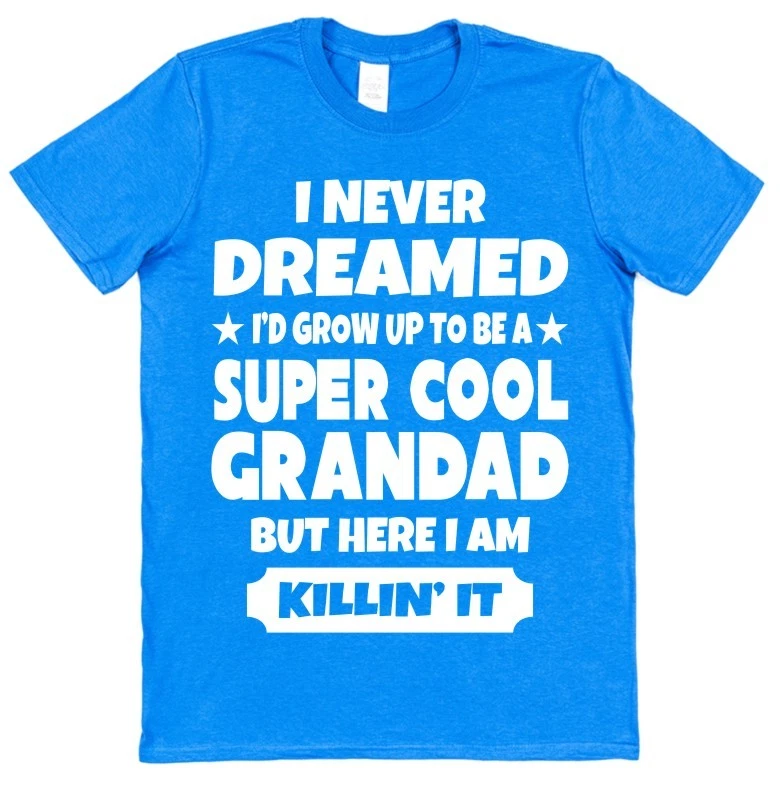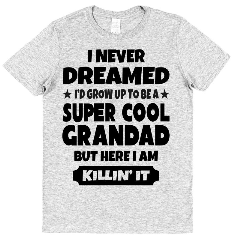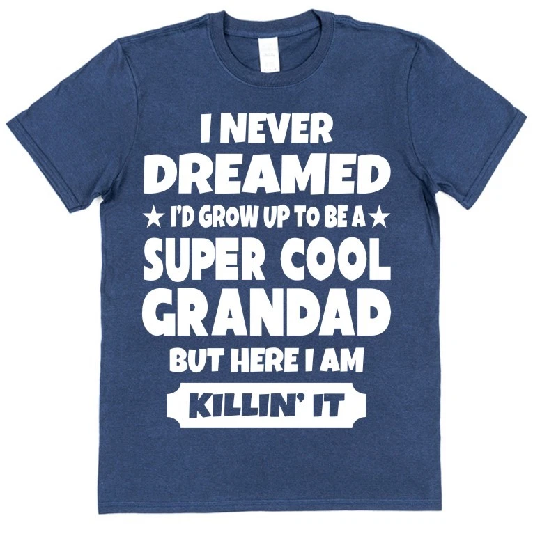 'I Never Dreamed I'd Grow Up To Be A Super Cool Grandad But Here I Am Killin It' T-shirt regular fit comfortable men's. Brand new 100% Cotton. Makes an ideal present for Grandpa on Father's Day, at Christmas, on his birthday or just because he's the best Grandad in the world and you're the best Grandson or Granddaughter! Buy this Tee for a memorable present and take the stress out of buying a grandad gift. Click My Clobber T-Shirts are 100% cotton so are comfortable and breathable. They've been made to last with re-enforced seams to eliminate separation and double stitched hem and sleeves for durability. This T-shirt was designed and printed in the UK. We specialise in high quality T-shirt printing and provide a comfortable product that will last and last. Funny Men’s Joke T-shirt. Great gift idea for Grandads. Grab one as a present for a super cool Grandfather at Christmas, on Father's Day, a top for their retirement or to wear for any occasion. Sizes Width is measured across garment 1cm down from armholes. Length is measured from highest point of shoulder to bottom edge of garment. Small - Width 46cm, Length 71cm (To fit 34''-36'') Medium - Width 51cm, Length 74cm (To fit 38''-40'') Large - Width 56cm, Length 76cm (To fit 42''-44'') XL - Width 61cm, Length 79cm (To fit 46''-48'') 2XL - Width 66cm, Length 81cm (To fit 50''-52'') 3XL - Width 71cm, Length 84cm (To fit 54''-56'') Please contact us if you have any questions or if you can't find what you're looking for. We always do our best to help.