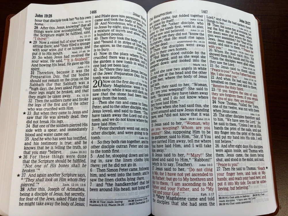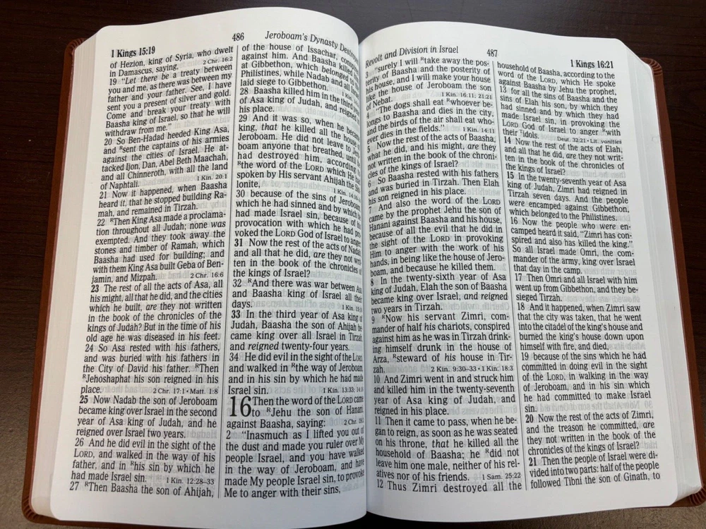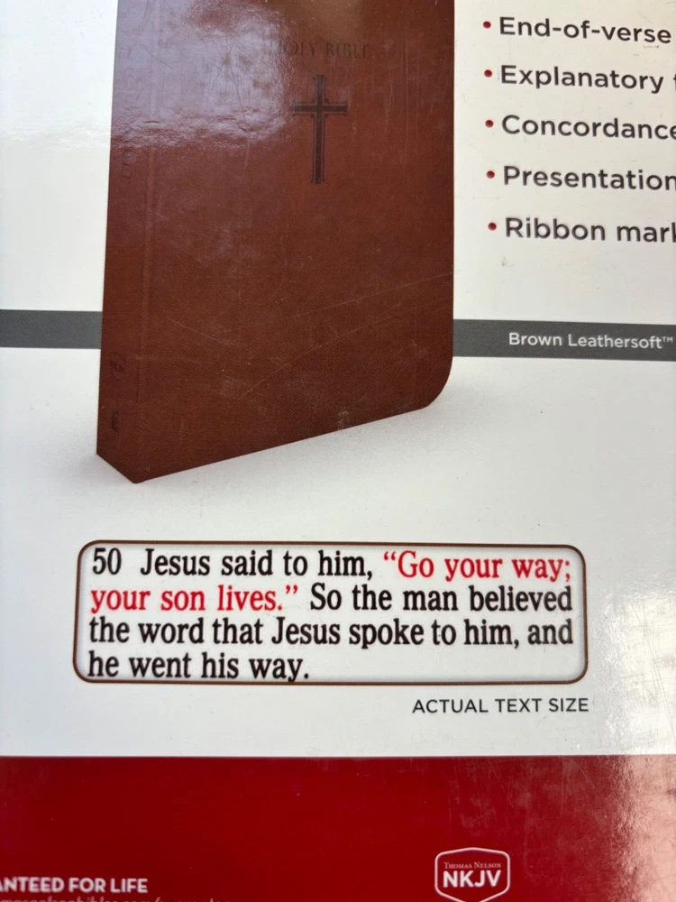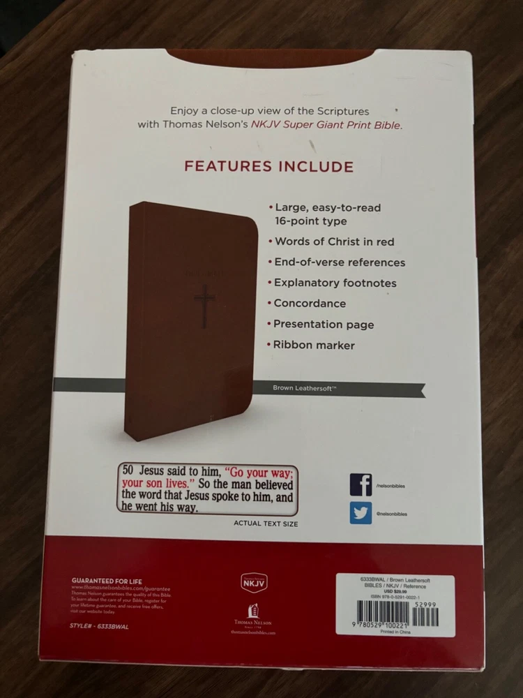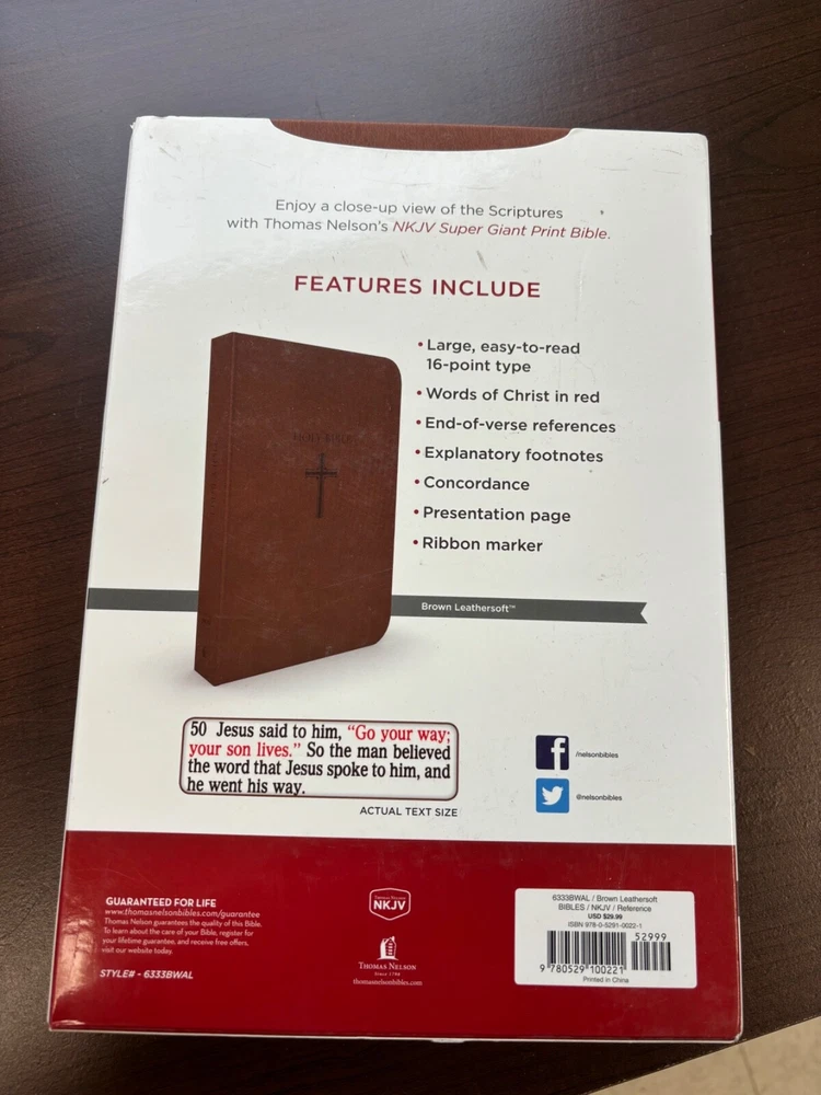 NKJV Super Giant Print Bible Brand NEW! Enjoy a close-up view of the Scriptures with Thomas Nelson's NKJV Super Giant Print Bible. Multiple new copies available - discounts for multi copy purchases! Large, easy to read 16-point type Words of Christ in red End-of-verse references Explanatory footnotes Concordance Presentation page Ribbon marker Brown Leathersoft Lay Flat Thomas Nelson publishing