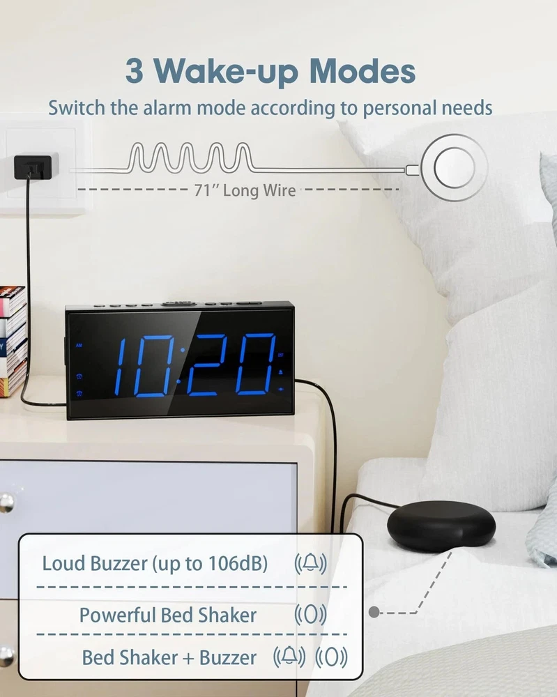 100% Money Back Guarantee if you are not satisfied with your purchase! ___________________ Description: โฐใ€Wake by ๐—ฆ๐˜๐—ฟ๐—ผ๐—ป๐—ด ๐—•๐—ฒ๐—ฑ ๐—ฆ๐—ต๐—ฎ๐—ธ๐—ฒ๐—ฟ & ๐—Ÿ๐—ผ๐˜‚๐—ฑ ๐—•๐˜‚๐˜‡๐˜‡๐—ฒ๐—ฟใ€‘- Differ from regular alarm sound clock, our ๐—น๐—ผ๐˜‚๐—ฑ ๐—ฎ๐—น๐—ฎ๐—ฟ๐—บ ๐—ฐ๐—น๐—ผ๐—ฐ๐—ธ comes with 3 innovative alarm methods: loud buzzer, super bed shaker or both sound and shaker, actually make it easier to wake you up from deep sleep. Simply press the โ€œBUZZ/VIBโ€ button to choose your favorite wake-up modes for maximum impact. The bed shaker alarm clock is also a perfect option for heavy sleepers, hearing impaired, deaf or hearing loss. ๐Ÿ”Šใ€Strong Wired Vibration Shaker & Adjustable Volumeใ€‘- The ๐˜ƒ๐—ถ๐—ฏ๐—ฟ๐—ฎ๐˜๐—ถ๐—ป๐—ด ๐—ฎ๐—น๐—ฎ๐—ฟ๐—บ ๐—ฐ๐—น๐—ผ๐—ฐ๐—ธ features with 71โ€ wired bed shaker which is long enough to be placed under the mattress. It can produce a strong vibration to shake you awake without disturbing others. The alarm sound volume is 4-level adjustable to meet your different needs. Combing the highest volume level and powerful bed shaker, you can be reliably waken up on time even for heavy sleeper. ๐Ÿ˜ดใ€Dual Alarm Clock & Big Snooze Functionใ€‘-The ๐—ฑ๐˜‚๐—ฎ๐—น ๐—ฎ๐—น๐—ฎ๐—ฟ๐—บ ๐—ฐ๐—น๐—ผ๐—ฐ๐—ธ allows you to set two separated alarms easily especially handy for couples or roommates who keep different schedules. When the alarm goes off, lightly touch the big snooze button to turn off temporarily and get extra 9 minutes sleep before alerting you again. You can also press the โ€œALARM PAUSEโ€ or โ€œALARM OFFโ€ to turn off the alarm for 24hours or permanently respectively. ๐Ÿ”…ใ€7.5โ€™โ€™ Large Display & 5 levels Brightness Dimmerใ€‘-With 7.5โ€™โ€™ big LED display, the numbers on the ๐—ฏ๐—ฒ๐—ฑ ๐˜€๐—ต๐—ฎ๐—ธ๐—ฒ๐—ฟ ๐—ฎ๐—น๐—ฎ๐—ฟ๐—บ ๐—ฐ๐—น๐—ผ๐—ฐ๐—ธ are ultra-clear to see from a long distance or across the bedroom even without glasses. 5 level adjustable screen brightness help you avoid high-intensity light while you are asleep or easily view the time in the daytime. ๐Ÿ”‹ใ€Electric Powered with Battery Backupใ€‘- All functions of the ๐—ฏ๐—ฒ๐—ฑ๐—ฟ๐—ผ๐—ผ๐—บ ๐—ฎ๐—น๐—ฎ๐—ฟ๐—บ ๐—ฐ๐—น๐—ผ๐—ฐ๐—ธ work under AC power (input power 100-240V), 2pcs AAA backup batteries (NOT Included) are only used to memorize time and alarm settings when encountering power outage. During the backup battery, the screen will go blank but the alarm will still be triggered. ๐Ÿ“ฑใ€USB Charger Port Design & 12/24H Formatใ€‘- The ๐—ฎ๐—น๐—ฎ๐—ฟ๐—บ ๐—ฐ๐—น๐—ผ๐—ฐ๐—ธ ๐˜„๐—ถ๐˜๐—ต ๐—จ๐—ฆ๐—• ๐—ฐ๐—ต๐—ฎ๐—ฟ๐—ด๐—ฒ๐—ฟ port (5V/1A) provides the convenience for charging your phone or other device safely while you sleep. The 12/24H format and DST function are also available by pressing the corresponding buttons. ๐ŸŽใ€Easy to Operate & Wide Applicationใ€‘- With the intuitive setting buttons, the ๐—ฎ๐—น๐—ฎ๐—ฟ๐—บ ๐—ฐ๐—น๐—ผ๐—ฐ๐—ธ ๐—ณ๐—ผ๐—ฟ ๐—ต๐—ฒ๐—ฎ๐˜ƒ๐˜† ๐˜€๐—น๐—ฒ๐—ฒ๐—ฝ๐—ฒ๐—ฟ is easy to use even for kids or elders. Updated features such as vibration, dual alarm, dimmer, USB charging port and modern design, the digital alarm clock can be as a perfect choice for your family, friends, kids. ________________________ 100% Money Back Guarantee: We offer 30 Day Money Back Guarantee from the day you purchased if youโ€™re not satisfied with your product. If you have any questions about our products, please contact us as soon as possible. Customer satisfaction is our absolute priority. Shipping: We are always working hard to ensure your package arrives as soon as possible. Please understand that some factors like weather, high postal traffic, and the performance of shipping companies are outside of our control. We offer free shipping to the lower 48 states and ship within 3 business days of payment, usually sooner. We do not accept P.O. Boxes. Please provide a physical address. You will be notified via eBay messages as soon as your items ship. Delivery: We will ship out the item in 2-3 working day after receiving the payment. Usually the delivery takes 2-5 business days. If you don't receive the items after 10 days, please feel free to contact us. You will get a replacement or a full refund. Please DO NOT open a return request or leave negative feedback without asking for help . Returns (Get Free Return Label): We offer a 30-Day Return Policy on defective/wrong items or items which you are not completely satisfied with. You have the option for a full-refund or an exchange of the item. No need to buy eBay return label. Contact us via eBay messages and get free return label. Returned items must be in all of the original packaging and include