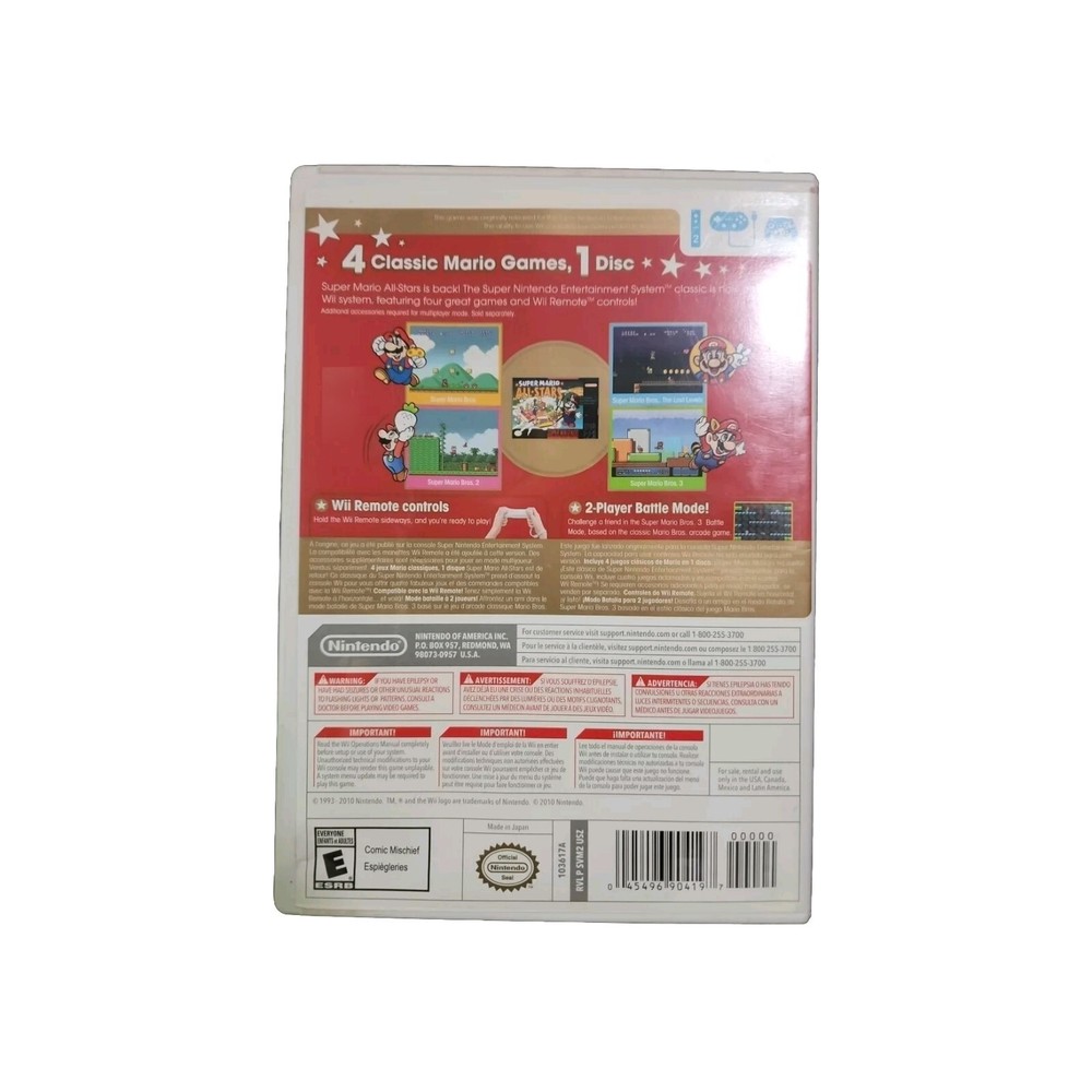 Region Code:NTSC-U/C (US/Canada)MPN:RVLPSVM2Publisher:NintendoGame Name:Super Mario All-StarsRating:E-EveryonePlatform:Nintendo Wiigtin13:0045496904197UPC:0045496904197Release Year:2011Genre:Platformer