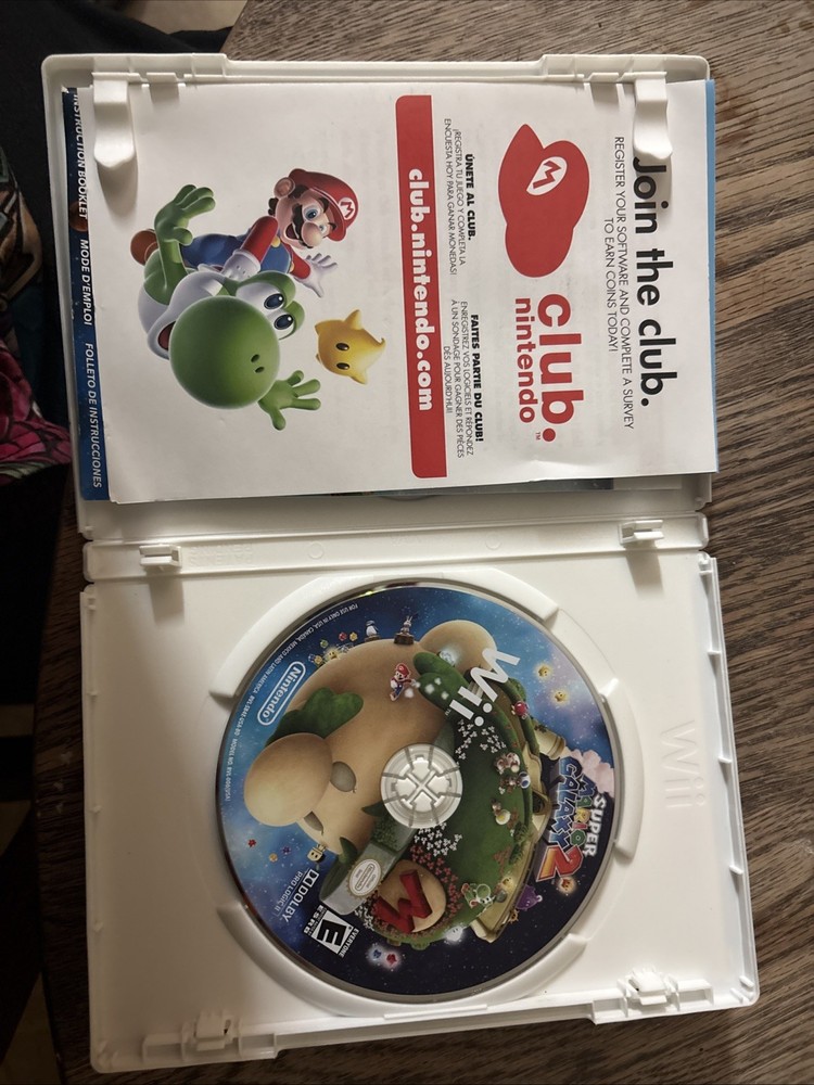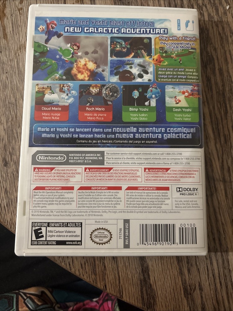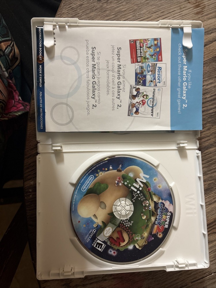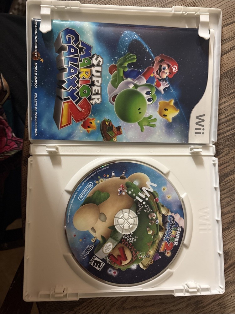 The product is Super Mario Galaxy 2 for the Nintendo Wii, released in 2010 by Nintendo. This platformer game is part of the popular Super Mario series and is rated E for Everyone. It includes the manual and supports multiplayer gameplay, making it a complete and enjoyable gaming experience for players of all ages. The game is in NTSC-U/C (US/Canada) region code, showcasing its original design and features for fans of the franchise.