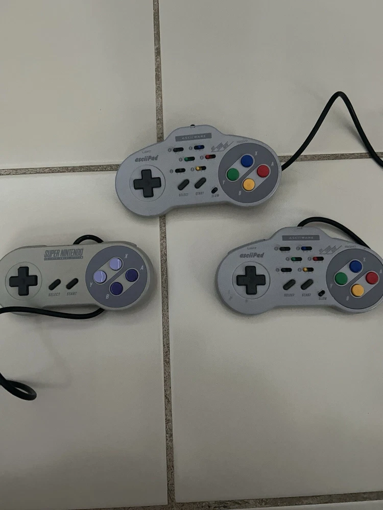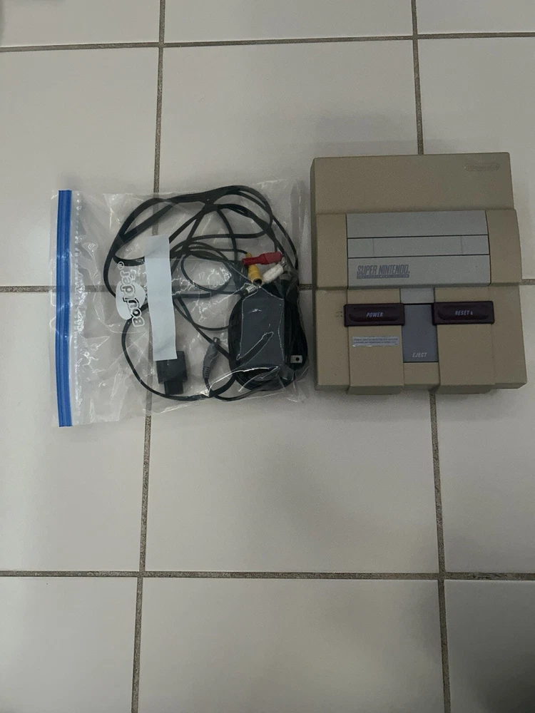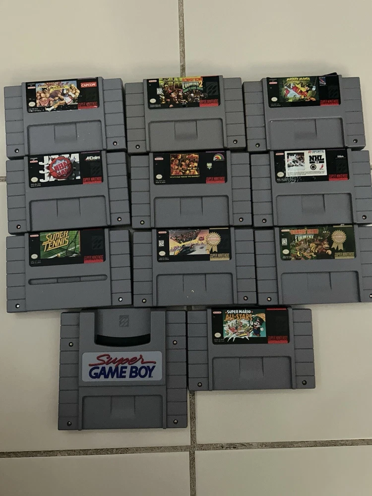 Super Nintendo Entertainment System SNES Console Bundle READ DESC Console is tested and working, very yellowed from fire retardant chemical in the casing. Comes with cables, 3 controllers and 11 Games INCLUDING super game boy ONE OF THE 2 ASCIIWARE CONTROLLERS DOESNT WORK PROPERLY