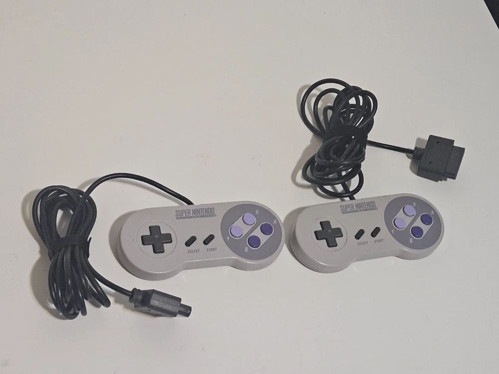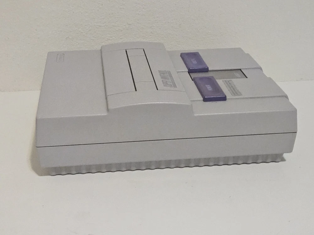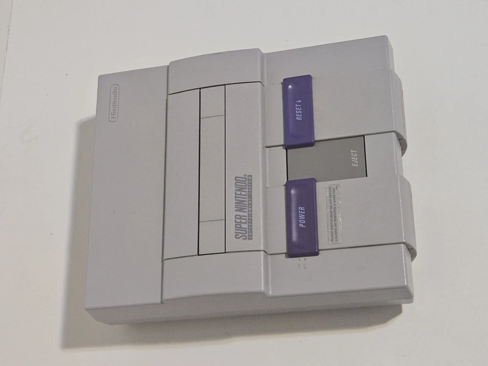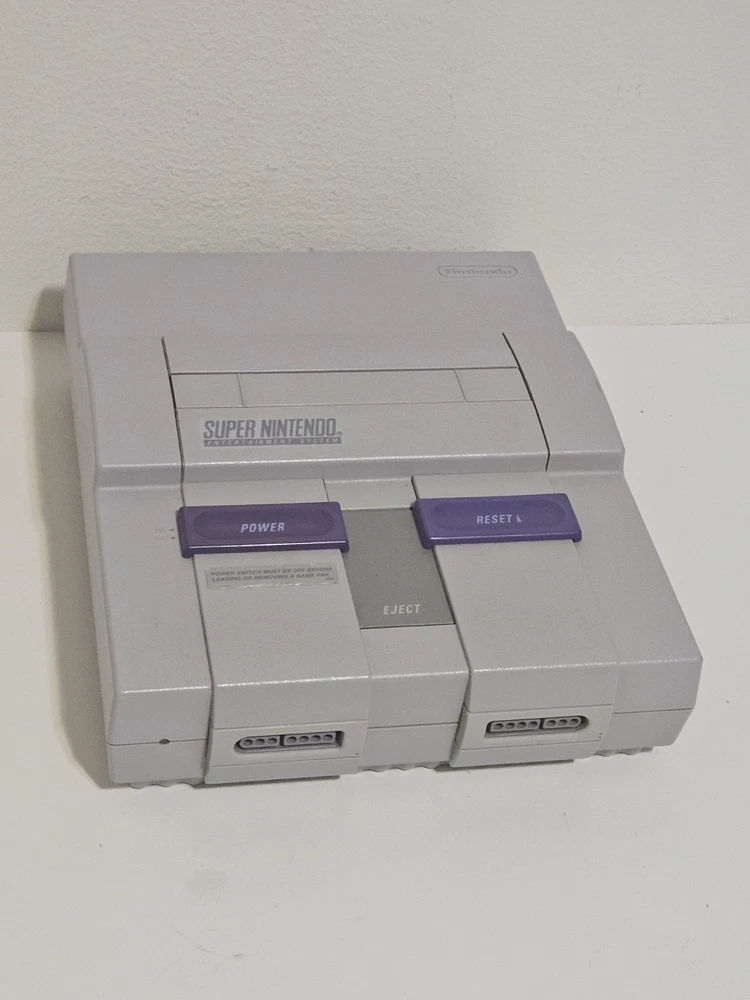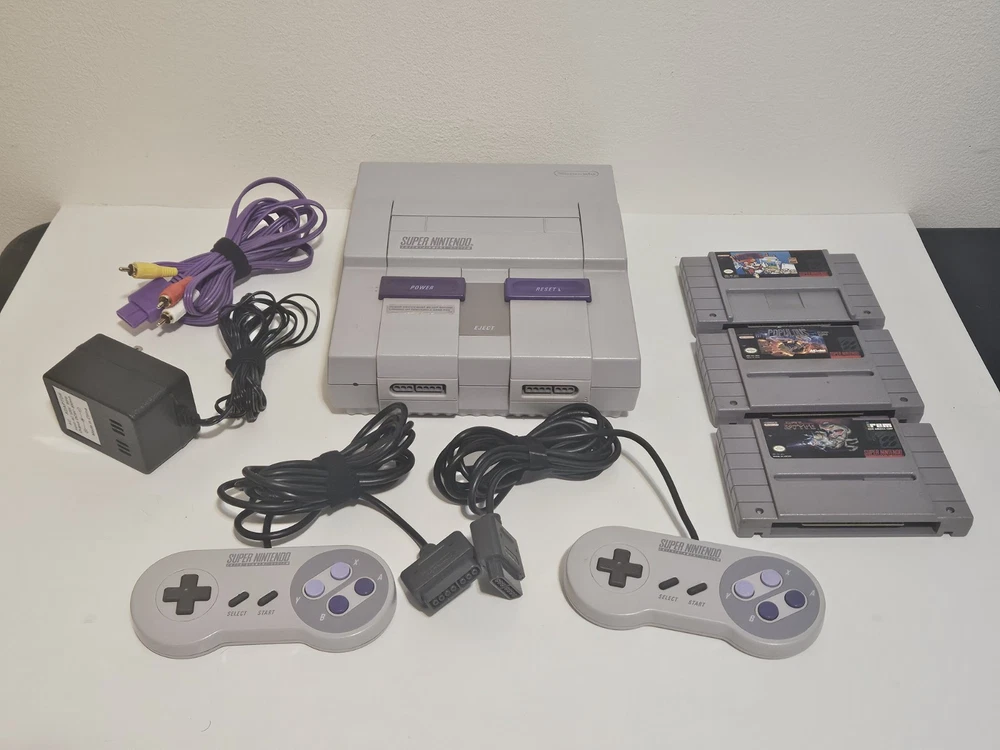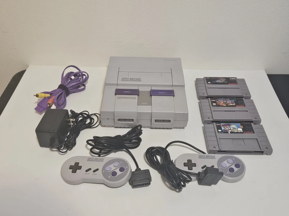 Super nintendo entertainment console bundle snes Model sns-001 control deck Comes with 3 games Mario paint Super R-type Populous 2 original super nintendo controllers models sns-005 Av audio video cable (matching purple) Multi connect power adapter Quality tested fully working Excellent condition (see photos for details)
