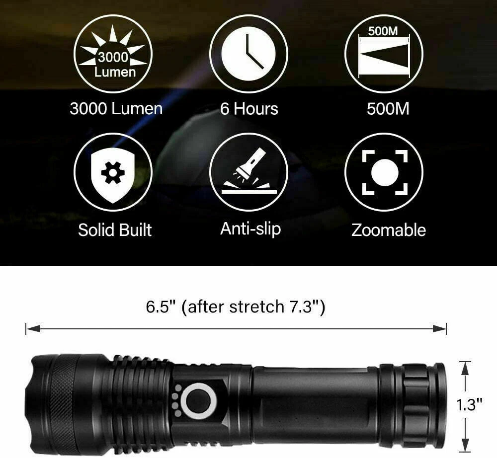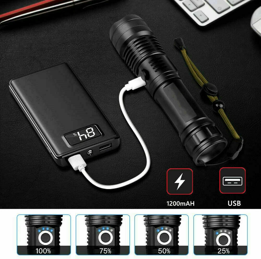 Product Description Powerful flashlightwith powerful rechargeable battery built into the flashlight!charges VIA USB cable!! Product Description 【Super Bright Flashlight】Our 1000 lumen tactical flashlight utilizes the durable XHP50 LED chip,provides poweful light,4 times brighter than flashlight. Max beam distance up to 500 meters (1640ft).With a lifetime up to 50,000 hours.Attention:You need get it fully charged before use.please make sure the battery "+" face the inside. 【Rechargeable Flashlight】With rechargeable battery,it can be charged by usb cable(included),low light modes for 6 hours use.Power indicator above the flashlight helps you to know the statu of the battery clearly. 【5 Modes Flashlight】Features with 5 different modes:High,Medium,Low,Strobe,SOS.Easy to change modes by pressing the switch button gently.Mini size fits in your hand or pocket,backpack, survival bag,or car glove compartment. 【Waterproof & Durable】IP65 Waterproof level protect it from splashing water from any angle.Suitable for outdoor environment and adverse weather conditions.Please do not submerge in water for a long time.This flashlight is made of aluminum alloy,skid-proof, abrasion resistance,which is a sturdy tool to hit something during emergency. 【Widely Application】Convenient to operate by one hand with lanyards and compact enough to carry to anywhere in your pocket.Ideal for dog walking,hunting, boating,power outages,patrolling,camping,hiking,emergency.Perfect gift for a father, husband, wife, or college student for any occasion.If you have any question,please feel free to contact us,we promise you a refund/replace anyway. Product Features Utilized upgrade 4 CORE LED with a lifespan of 500,000 hours. Made by military-grade aluminum alloy, premium solid built body. Can be charged via a car/wall adapter, computer or power bank. IP65 waterproof for extreme conditions indoors or outdoors 5 Light Modes: High/Mid/Low/Strobe/SOS With power indicator light