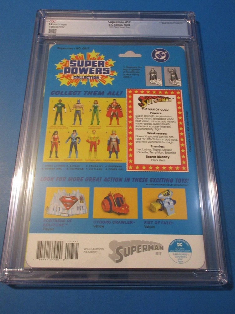 This auction is for Superman #17 variant in CGC 9.8 with a brand new case condition. This week we are selling a great collection with Captain America, Spawn, Spider-man, Eternals,Fantastic Four, Iron Man, Hulk, Batman,Avengers, X-men and many CGC books and many other 1st appearance key issues. You are sure to find something you are looking for this week. Bonus Offer! Win 2 or more auctions and earn an extra bonus comic plus an additional upgraded bonus when you win 10 auctions . Our Shipping rates are: USA: Free for single comics with no limit, multiple comic lots have a charge and additional combined lots are half price. Canada: 13 Dollars for the 1st comic and 1.50 each after that. International: 15 dollars for the 1st comic and 1.50 each after that. CGC books are 9.99 for the 1st and 5 each after that in the USA, 18 bucks and 9 combined for Canada and 27 bucks and 13.50 combined for international. Feel free to ask questions. I guarantee superfast Domestic shipping! ...to open their eyes...that they may receive forgiveness of sins and a place among those who are sanctified by faith in me. Acts 26:18