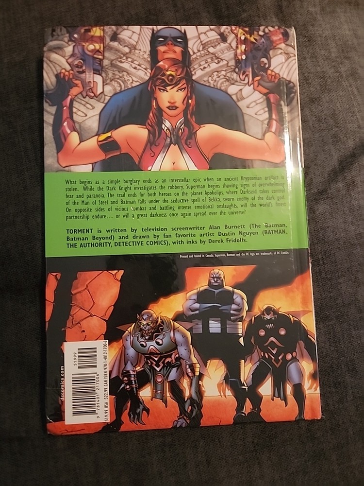 "Superman / Batman: Torment" is a comic book published by DC Comics in June 2008, set in the Modern Age era of US Comics. The story features a wide array of characters including Superman, Batman, Wonder Woman, Green Lantern, and many more iconic heroes and villains from the DC universe. The artwork is done by artists Randy Mayor, Derek Fridolfs, Dustin Nguyen, and written by Alan Burnett and Derek Fridolfs, promising an action-packed and thrilling superhero adventure for fans of the genre. This is brand new still in original shrink wrap