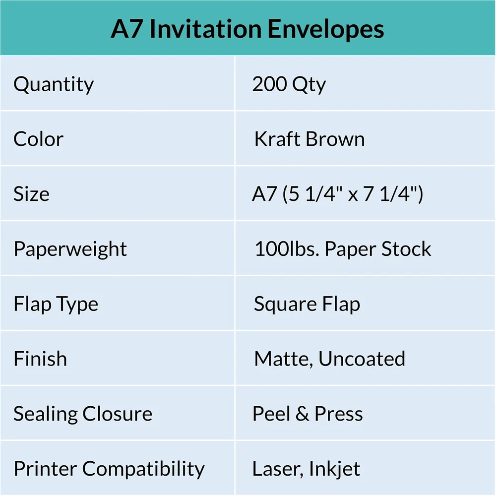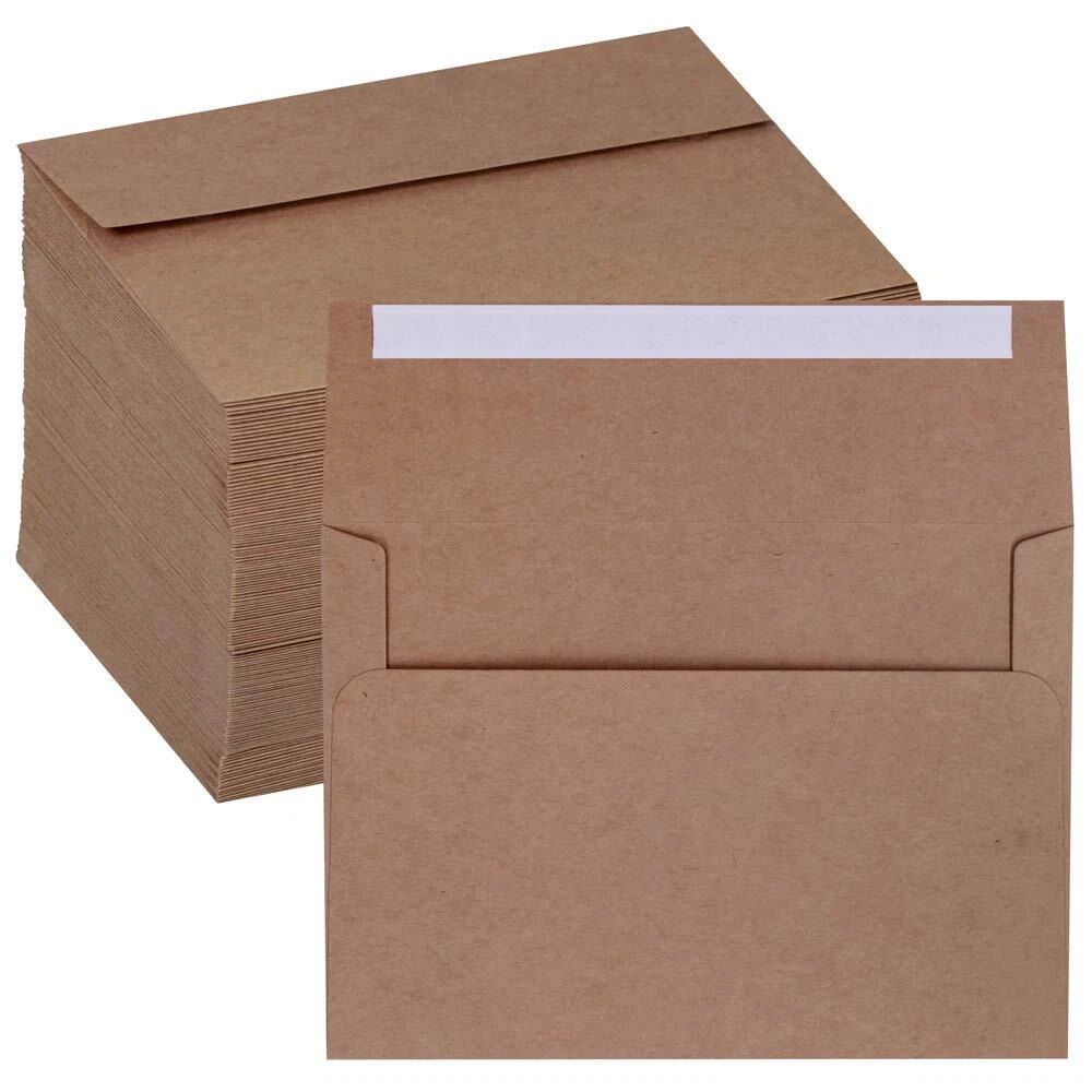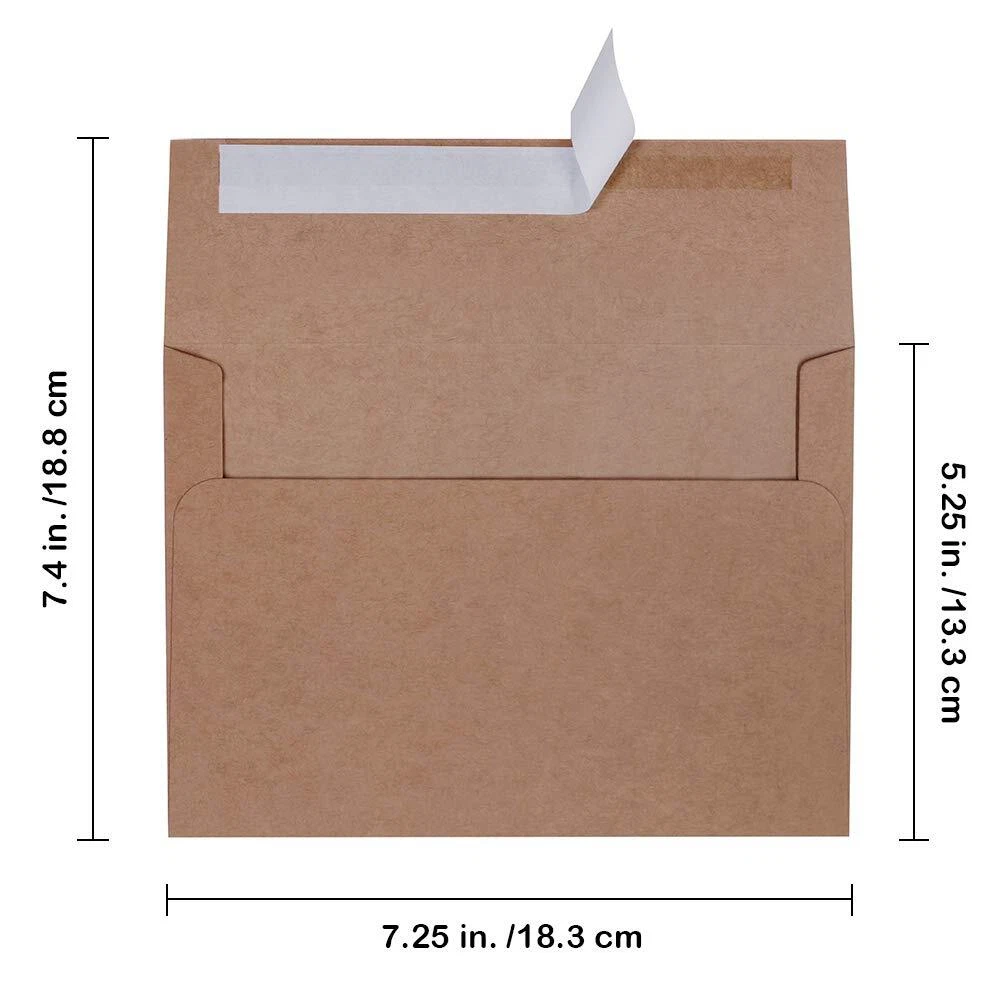 Quantity: Package includes 150 pcs Blank Self Sealing Kraft Paper A7 invitation Envelopes Business Envelopes Photo Envelopes Greeting Card Envelopes in brown. Dimensions: Each A7 invitation Envelopes business envelope measures 5.25" in length and 7.25" in width, perfect for holding 5" x 7" photos, invitations, short sweet message, thank you notes, gift cards, announcements, letters and more. The A7 envelopes also fit inside envelope sizes of A8, A9, A10. Color: The Blank Envelopes are in light brown, a classic color that can go well with any theme and can be used for all kinds of occasions. From rustic wedding, baby shower invitations to special holiday greetings, from simple and classy letters, to promotional mail for your business, these Kraft Envelopes can do it all! Material: The Invitation Envelopes are made of 95lb quality paper and will not easy to tear. Greeting card envelopes feature a classic square flap that has peel and stick adhesive for convenient use. These blank envelopes have a smooth matte surface for painting and decorating with colorful markers or tapes. Application With a simple, classic look, these Self Sealing A7 Kraft Envelopes are perfect for party invitations, wedding invitations, greetings cards, thank you notes, love letters, photos, message, announcements, holiday cards, regular personal mail, business cards, stationery, paper crafts, other personalized communications or anything else you fancy. Their versatility and practicality make these envelopes a great value, ideal for party, weddings, holidays, baby showers, birthdays and banquets. Quantity: Package includes 150 pcs Blank Self Sealing Kraft Paper A7 invitation Envelopes Peel & Seal Business Envelopes Photo Envelopes Greeting Card Envelopes in brown. Dimensions: A7 invitation Envelopes business envelopes measure 5.25" in length and 7.25" in width, perfect for holding 5" x 7" photos, invitations, short sweet message, thank you notes, gift cards, announcements, letters and more. The A7 envelopes also fit inside envelope sizes of A8, A9, A10. Color: The Blank A7 Envelopes are in light brown, a classic color that can go well with any theme and can be used for all kinds of occasions. From rustic wedding, baby shower invitations to special holiday greetings, from simple and classy letters, to promotional mail for your business, these Kraft Envelopes can do it all! Material: The A7 Invitation Envelopes are made of 95lb quality paper and will not easy to tear. Greeting card envelopes feature a classic square flap that has peel and stick adhesive for convenient use. These blank envelopes have a smooth matte surface for painting and decorating with colorful markers or tapes. With a simple, classic look, these Self Sealing A7 Kraft Envelopes are perfect for party invitations, wedding invitations, greetings cards, thank you notes, love letters, photos, message, announcements, holiday cards, regular personal mail, business cards, stationery, paper crafts, other personalized communications or anything else you fancy. Their versatility and practicality make these envelopes a great value, ideal for party, weddings, holidays, baby showers, birthdays and banquets.