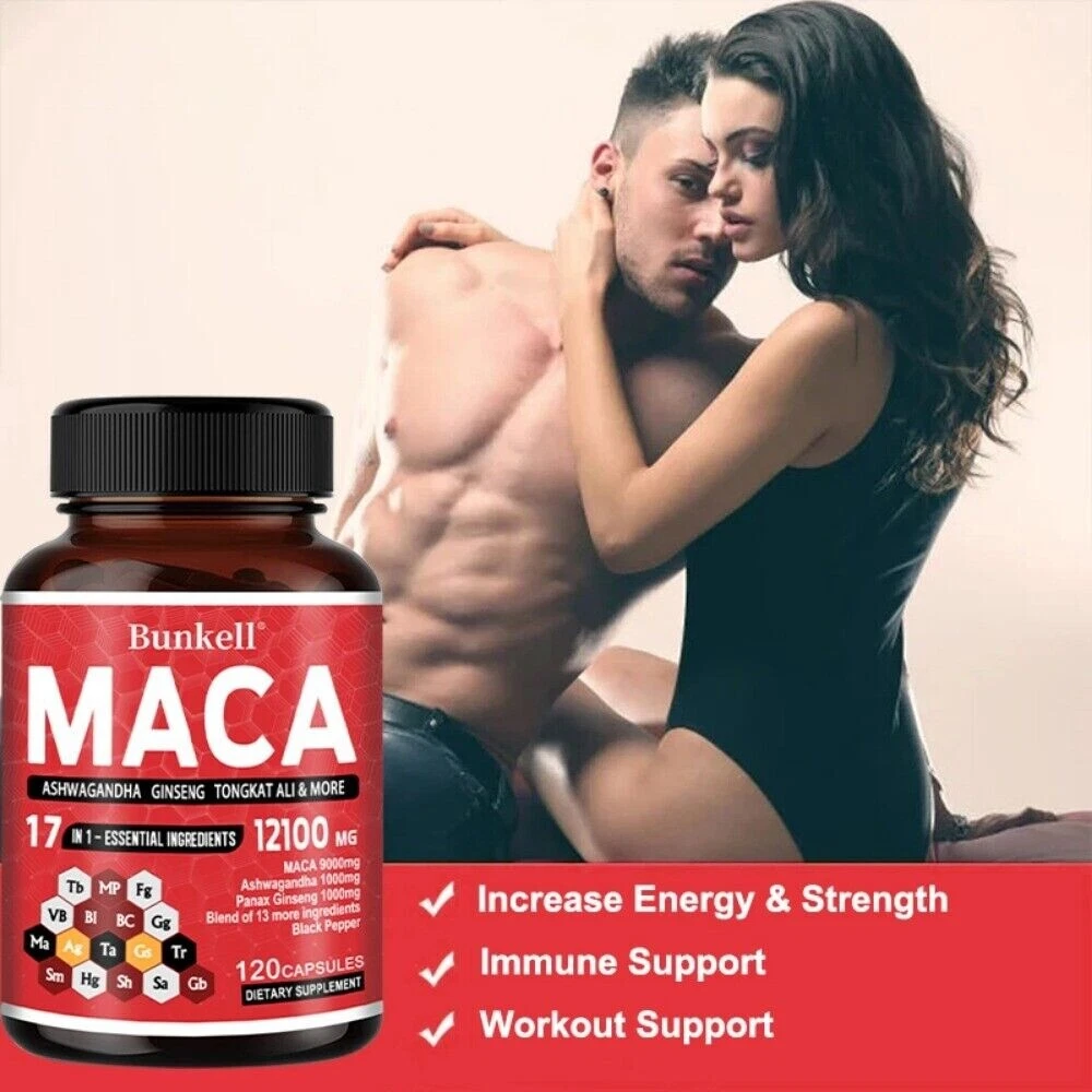 Description: Maca Root Supplement with Maca Root, Ashwagandha Root, Ginseng, Tribulus Terrestris, Shilajit and Black Pepper; improves well-being. 17-in-1 extract formula supports strength, muscle mass, energy production and immune system in men and women. All Bunkell supplements are made by cGMP, ISO and FDA registered manufacturers. Gluten-free, non-GMO, plant-based, keto-friendly, and vegan. American laboratory quality assurance. Maca-Ashwagandha herbal capsule blend supports balance through exercise and a healthy lifestyle. Learn about the benefits of Bunkell dietary supplements for safe and healthy living.