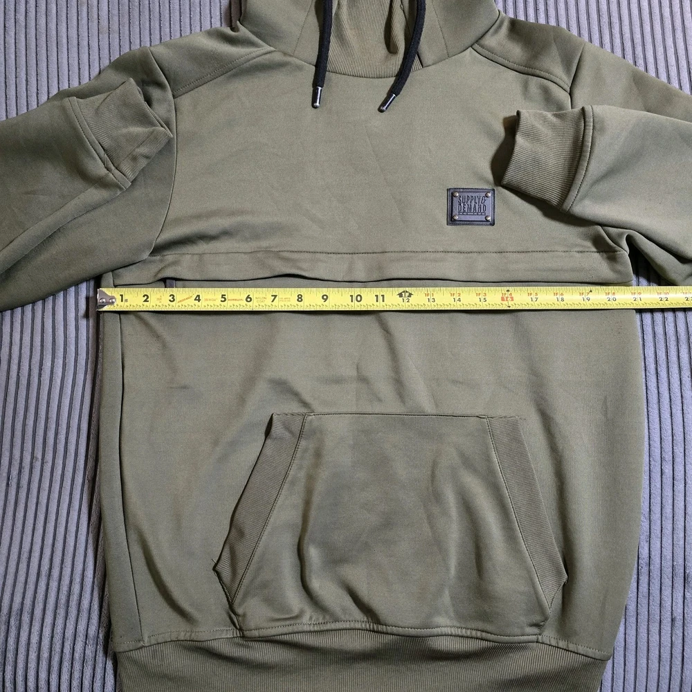 The Supply and Demand Hoodie is a sporty casual pullover specifically designed for outdoor activities, with a solid green color and long sleeves for added warmth. Made from a comfortable blend fabric, this hoodie features a high neck and logo accents, making it suitable for various seasons including winter, fall, and spring. With a regular fit and lightweight design, this hoodie is perfect for activities such as hiking, biking, and running, while also featuring convenient pockets for storing essentials. The versatile style and all-season versatility make it a practical and stylish addition to any outdoor enthusiast's wardrobe.