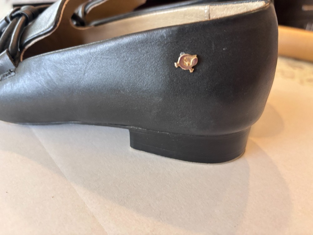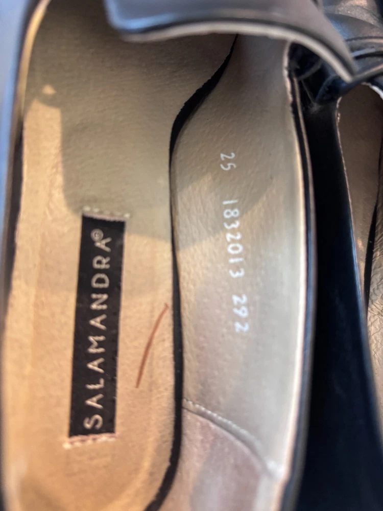 Heel Style: Wedge Outsole Material: Leather Vintage: Yes Upper Material: Leather, Suede Style: Loafers Pattern: Solid Type: Heel US Shoe Size: 8 Toe Shape: Round Toe Features: Lined Heel Height: Low (1-1.9 in) Lining Material: Leather Shoe Width: M Brand: Salamander Color: Black Customized: No Insole Material: Leather Closure: Slip On Department: Women