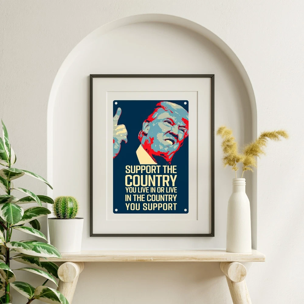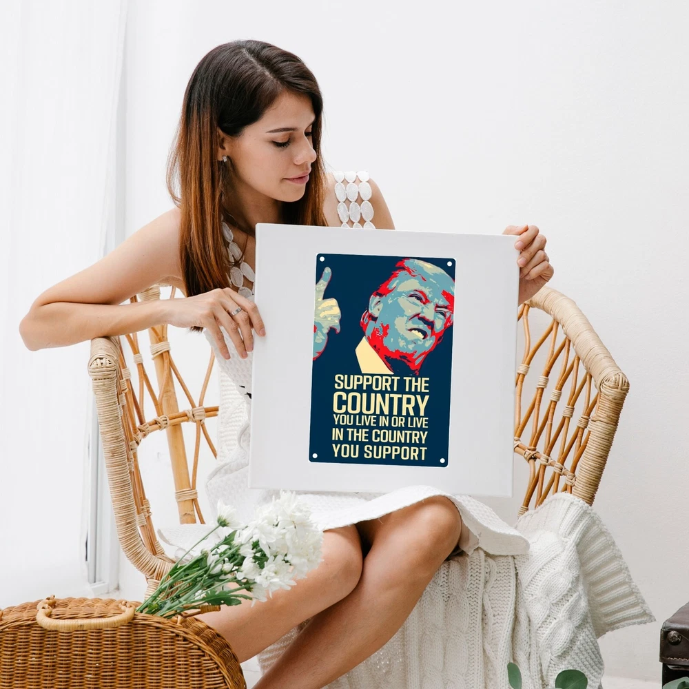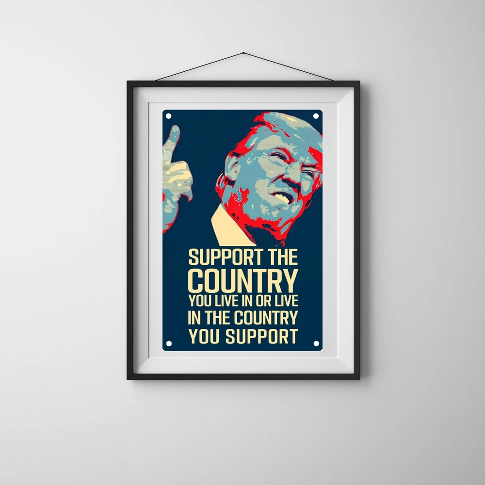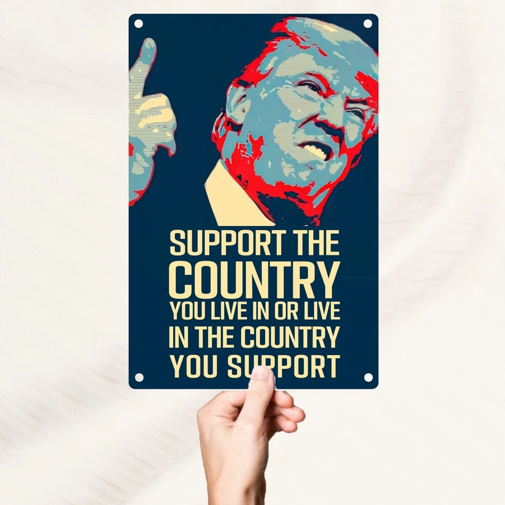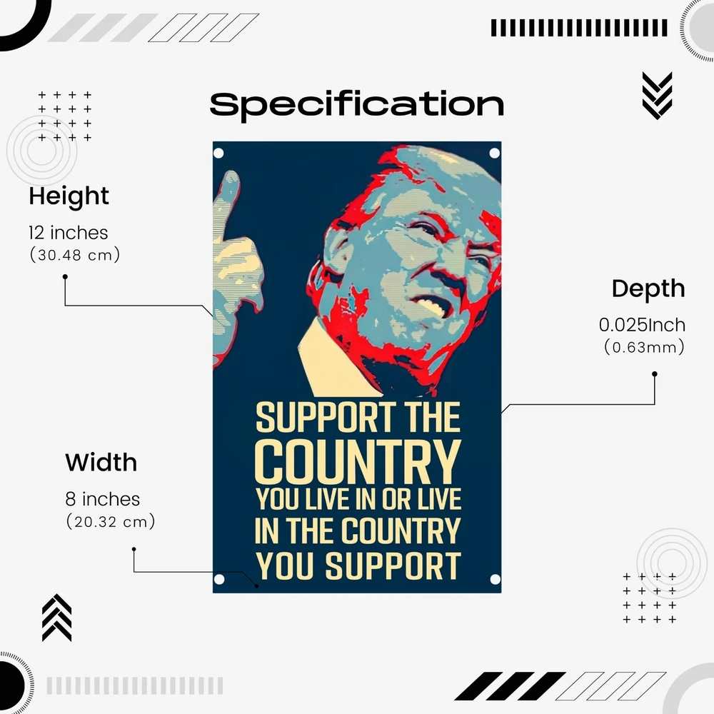 Trump sign - Support the Country you live in or live in the country you support - A sign speaks a thousand words, and provides a single gut punching and powerful patriotic statement. This sign is not just decor, it's a rallying cry that cuts to the core of what it means to be a proud citizen Perfect Gift Size - 12 x 8 inch, lightweight, metal wall decor, will reinvent your wall art, decorate your shelves, or become one of your greatest novelty display accessories. Simply Unique metal art Seamless setup meets superior longevity—our rust free, weather-resistant, durable large signs, wall art and vintage metal signs are a breeze to hang with pre-drilled 3/16 inch holes for screws or pins (not included) Quality for ages - sublimation pressed aluminum metal tin signs, non-fade, anti glare finish, using eco-friendly ink; each unique metal poster is made in the USA and inspected individually Dedicated customer service for any request, vintage decor design idea, funny sign aesthetics, cool metal wall art decor and general support. We like to talk to our customers in general, so don't hesitate to write Support The Country You Live In Or Live In The Country You Support - Metal Tin Sign For Front Porch Or Home Decor, Living Room, Rallies, Gifts Or Inspirational Wall Art, Rustproof, 12x8 Inch, Made In USA: A Powerful Patriotic Statement - This bold tin sign isn't just decor, it's a rallying cry that cuts to the core of what it means to be a proud citizen. With its uncompromising message, it demands loyalty to one's homeland or the courage to relocate allegiances. Brace yourself for a daily dose of truth that separates the faithful from the feckless. Features: - Size 8 x 12 inch, metal tin sign, Rectangular - Lightweight and versatile, fits bathroom, front door, bedroom, living room, porch - Non-fade, high quality sublimation metal posters - Pre-drilled 3/16 inch holes for screws or pins - Rust-proof laminated aluminum plates, weather-proof and water resistant - Individually inspected and made to order in the USA You May Want to Have This Sign before your Neighbor does... Unless you want to risk having to take its advice and move to the country they're clearly more supportive of! :-)