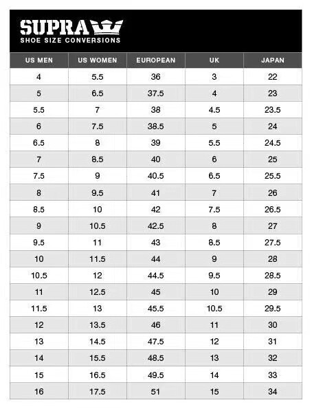 Supra is out of business. There will be no more shoes after they are sold. Don't miss them N ote *Please check the size chart for UK and EUR size * Replacement of non-quality problems, return and second shipping are paid by the buyer. *All pictures come to real items * I will keep showing updated info to buyers. *If your size and color out of store or not in my list,please let me know. I will check our warehouse. *Please note that this list will added color and size from time to time. * Because the computer display screens or other factors, the color and brightness of the picture will be slightly different with the real item. Important *Please contact the local post office immediately after the package delivery fails ( I will let you know about this) . Unclaimed packages will be destroyed. I cannot refund to the buyer after that. Please understand. *The drying bag and sachet in the package are not edible. Keep away from children. *Important * Import duties, taxes and charges are not included in the item price or shipping charges. These charges are the buyer's responsibility. Please check with your country's customs office to determine what these additional costs will be prior to bidding or buying. *Payment & Returns * We refund or exchange the item if it's damaged or lost. Please contact us by email before return the goods. Please attach the picture in the mail if the item damaged. please kindly return for full refund with all tags intact. Buyer pays return shipping. * About Feedback * No one can do perfect, but Please do not leave us negative and neutral feedback, do not leave us Low DSR if you find any problem about our goods or shipping time too long, just contact us, and we can help you. your feedback is very important to us. Thank you very much! *Contact us * Any questions please contact us first, most message are responded within 24 business hours.