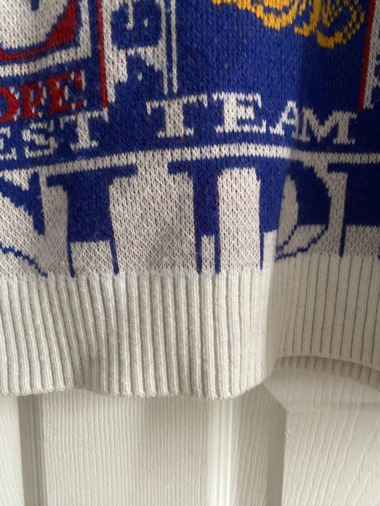 An intarsia-knitted cotton sweater (not a sweatshirt) featuring the word "SUPREME" in massive, oversized block letters that wrap around the chest, sleeves, and back. Condition 9/10 gently worn. Relaxed/Athletic "University" fit. The internal wash tag will list the Japanese support number 0570-057-300 . This is a hallmark of authentic Supreme items sourced from the Japanese market, where many of these sweaters are currently being sold by high-end vintage boutiques. Relaxed/Athletic "University" fit. Measurements for Large Size Chest Width (Pit-to-Pit ) 26" Body Length (Back Neck to Hem) 28" Sleeve Length (Center Back to Cuff) 35"