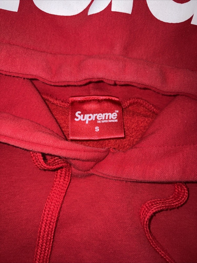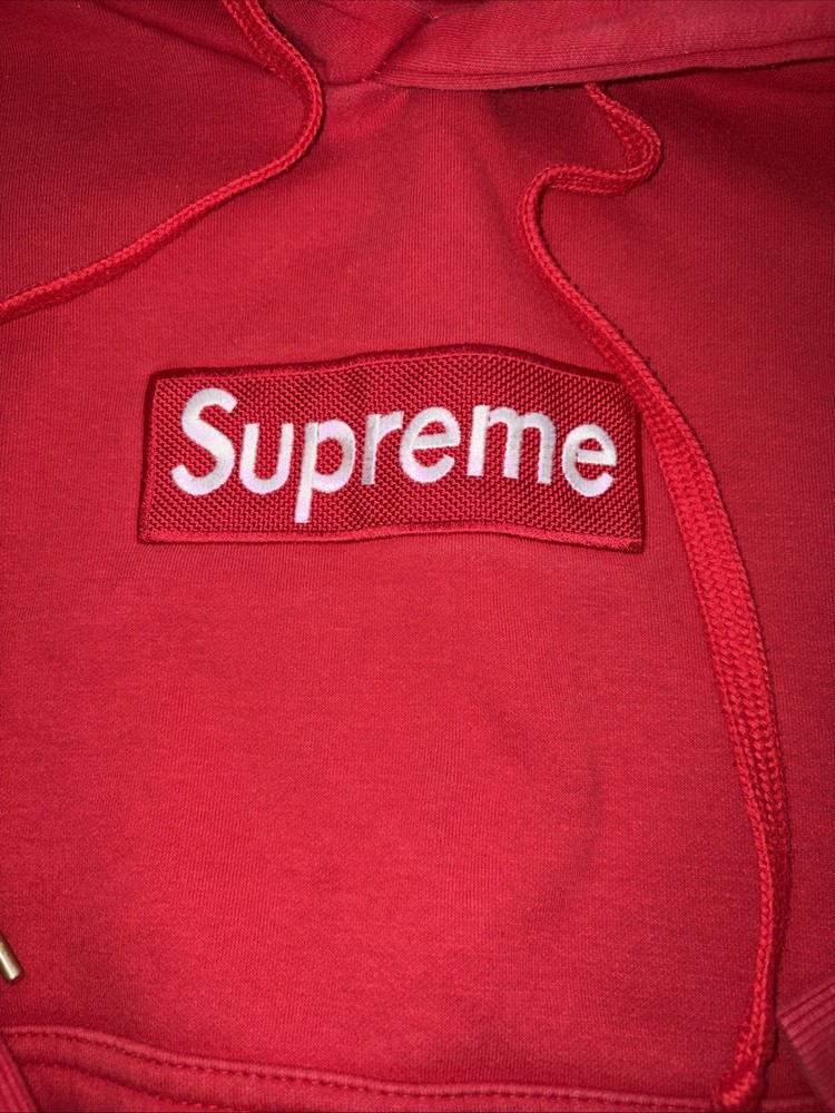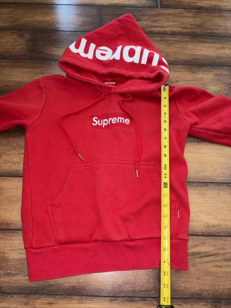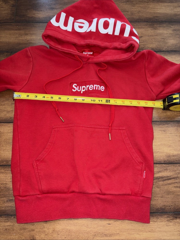 The Supreme Box Logo Hooded Sweatshirt in red, size small, is a stylish activewear piece suitable for both men and women. It features a unisex fit with a pullover style, perfect for those looking for comfort and style in one garment. The iconic Supreme branding adds a touch of streetwear flair to the overall look, making it a versatile addition to any wardrobe for casual or athletic occasions It says it’s a small, but it definitely is more like a youth extra large. You can see the measurements for the exact measurements.