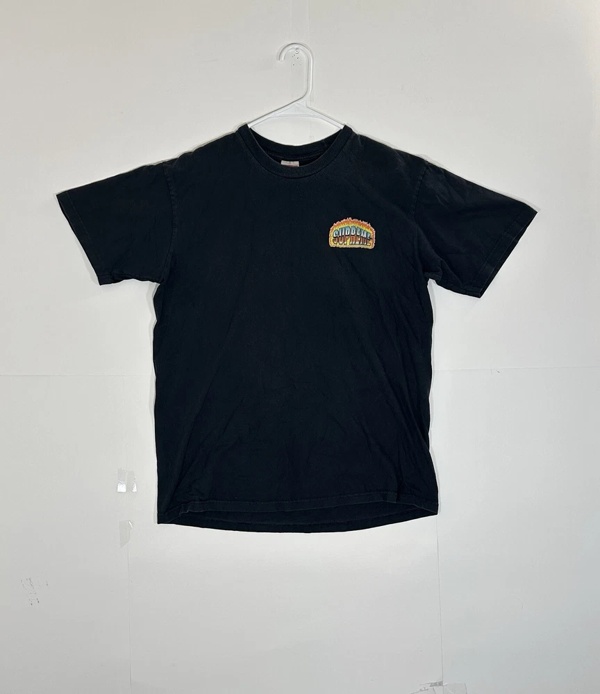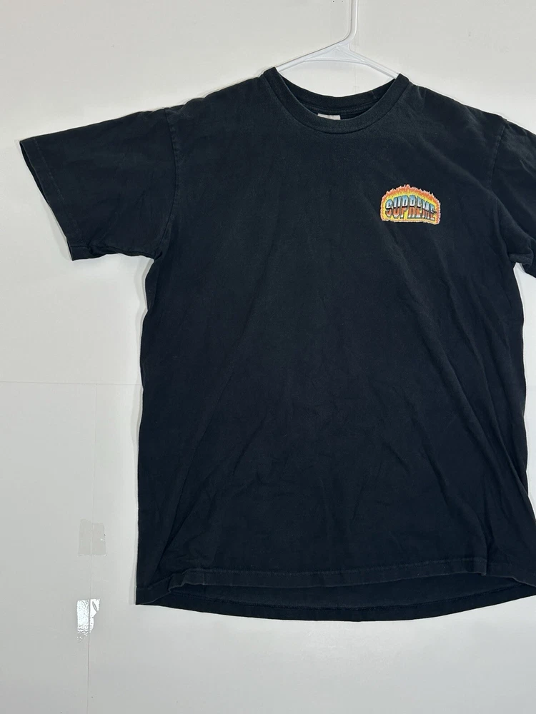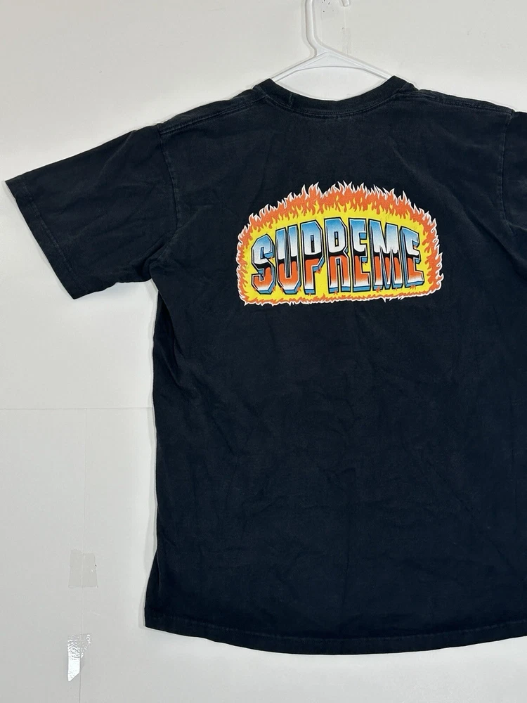 Supreme Chrome Fire Solid T-Shirt Black Men's Size Medium Skate Skateboarding USA Decent - to - pretty good condition overall - see ALL photos very closely Shirt has some discoloration/fade - light mild - to - moderate wear/tear overall throughout tee - some light marks throughout if anything - see ALL photos very closely for condition of tee Will ship with care