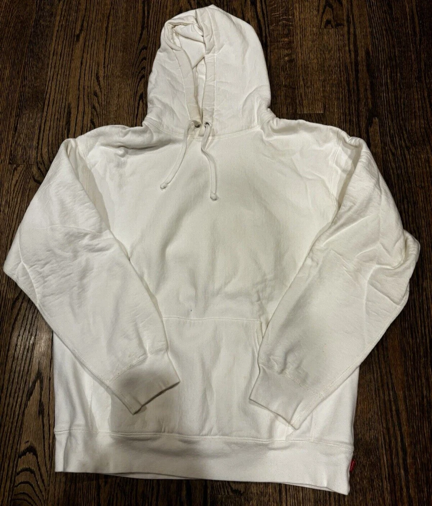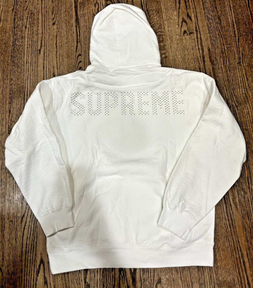 Elevate your streetwear game with this Supreme White Studded Logo Hooded Sweatshirt. Crafted from heavyweight cotton fleece, this sweatshirt features a drawstring closure and a crew neck. The long sleeve design and hood make it a perfect choice for winter, fall, and spring seasons. It comes in XL size with a regular fit, and is adorned with studded accents and the Supreme logo. This designer sweatshirt is ideal for gym and training, walking, and skateboarding. Get your hands on this solid patterned sweatshirt and add a touch of style to your wardrobe. Supreme is written across the back in gold studs, all of which are intact.