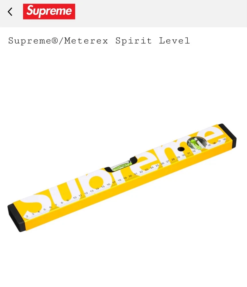 I habe in hand! Hmu with offers or questions!! It is 39cm - 15.75In .This Supreme Meterex Spirit Level in yellow is a rare find for any streetwear enthusiast. Crafted from 100% aluminum, this multifunctional accessory is perfect for those who want to add a touch of luxury to their daily routine. The logo accents and sleek design make it a must-have for any Supreme fan. This unisex level is perfect for both men and women who want to show off their love for designer and streetwear fashion. This spirit level is sure to make a statement. Don't miss out on the opportunity to add this Supreme Meterex Spirit Level to your collection.