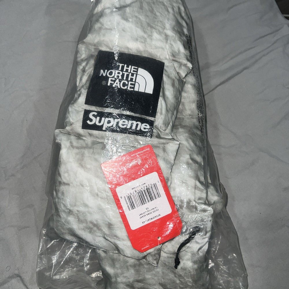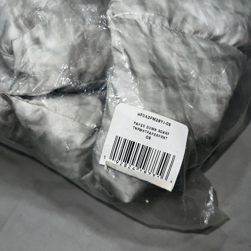 The product is a Supreme x North Face Crinkle Paper Print 700 Down Scarf, still in its original packaging. It is a gray polyester scarf featuring a unique crinkle paper print design in collaboration with North Face. The scarf is one size fits all and made with down fabric, providing warmth and comfort. This limited edition accessory is a stylish addition to any outfit, perfect for those looking to make a fashion statement with a touch of streetwear flair.