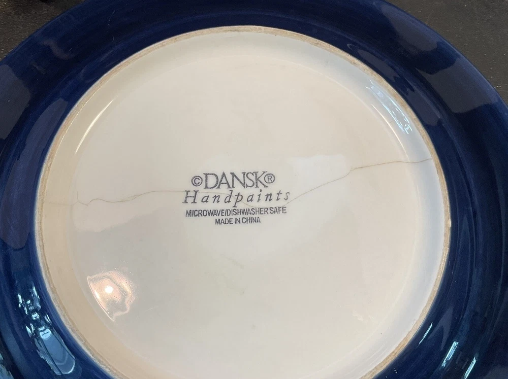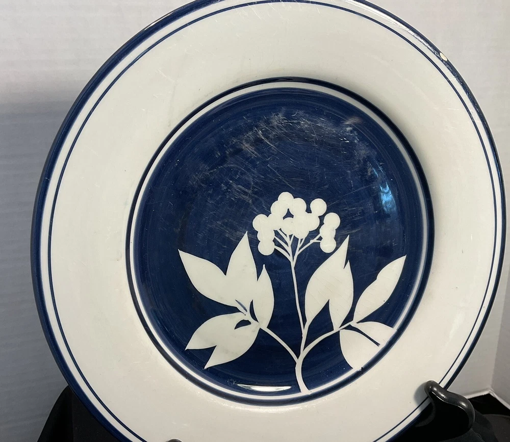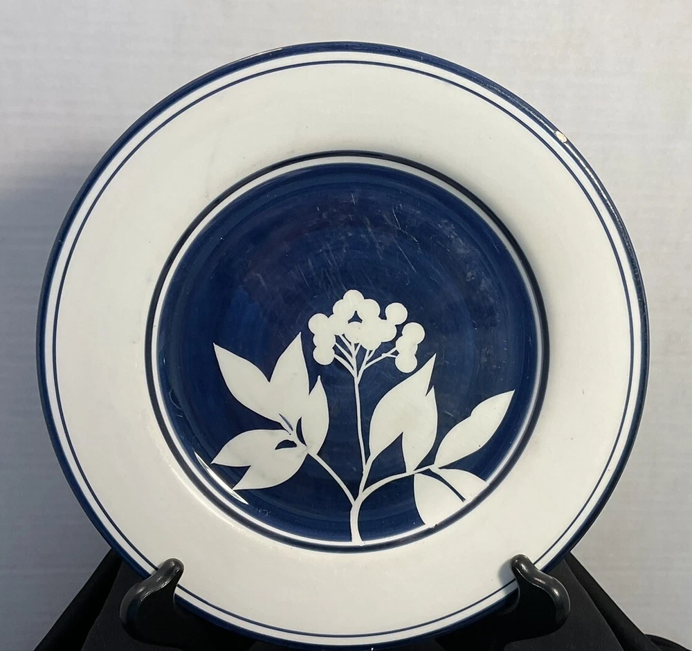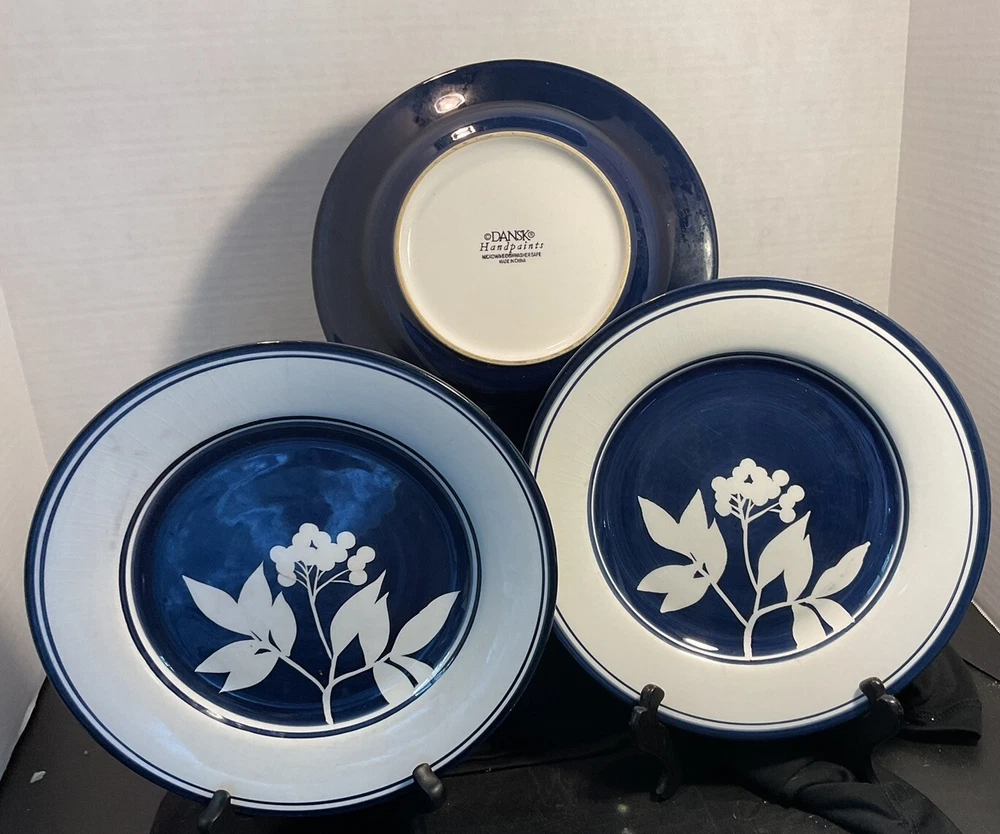 Add a touch of elegance to your dinnerware with this set of three luncheon plates from Dansk's Sureau collection. The plates feature a beautiful cobalt blue color with white leaves, adding a pop of color to your table setting. Measuring 9 inches in diameter and made of durable ceramic material, these plates are perfect for serving lunch or salad. The vintage backstamp and floral theme add to the charm of this set. The set includes three salad or luncheon plates, making it a great addition to your existing dinnerware collection. There is some wear on these plates. The surfaces have scratches from a knife possibly, there is some crazing, one chip on front edge of one plate and a surface crack on the back of one plate that does not go through to the front. Please examine photos closely. Price reflects wear.