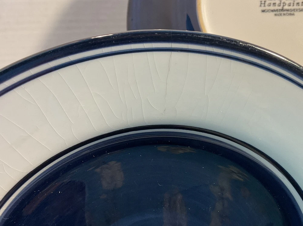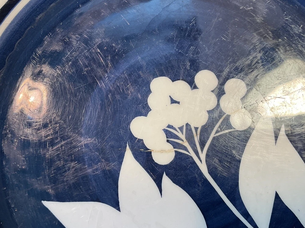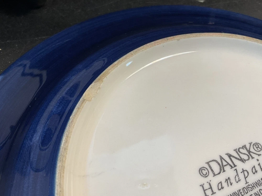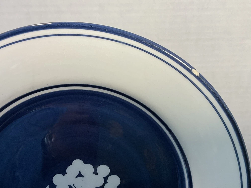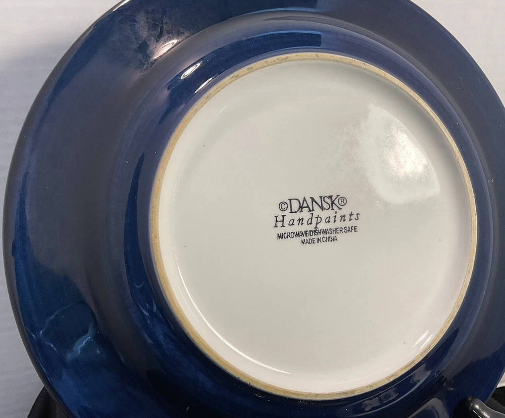 Add a touch of elegance to your dinnerware with this set of three luncheon plates from Dansk's Sureau collection. The plates feature a beautiful cobalt blue color with white leaves, adding a pop of color to your table setting. Measuring 9 inches in diameter and made of durable ceramic material, these plates are perfect for serving lunch or salad. The vintage backstamp and floral theme add to the charm of this set. The set includes three salad or luncheon plates, making it a great addition to your existing dinnerware collection. There is some wear on these plates. The surfaces have scratches from a knife possibly, there is some crazing, one chip on front edge of one plate and a surface crack on the back of one plate that does not go through to the front. Please examine photos closely. Price reflects wear.