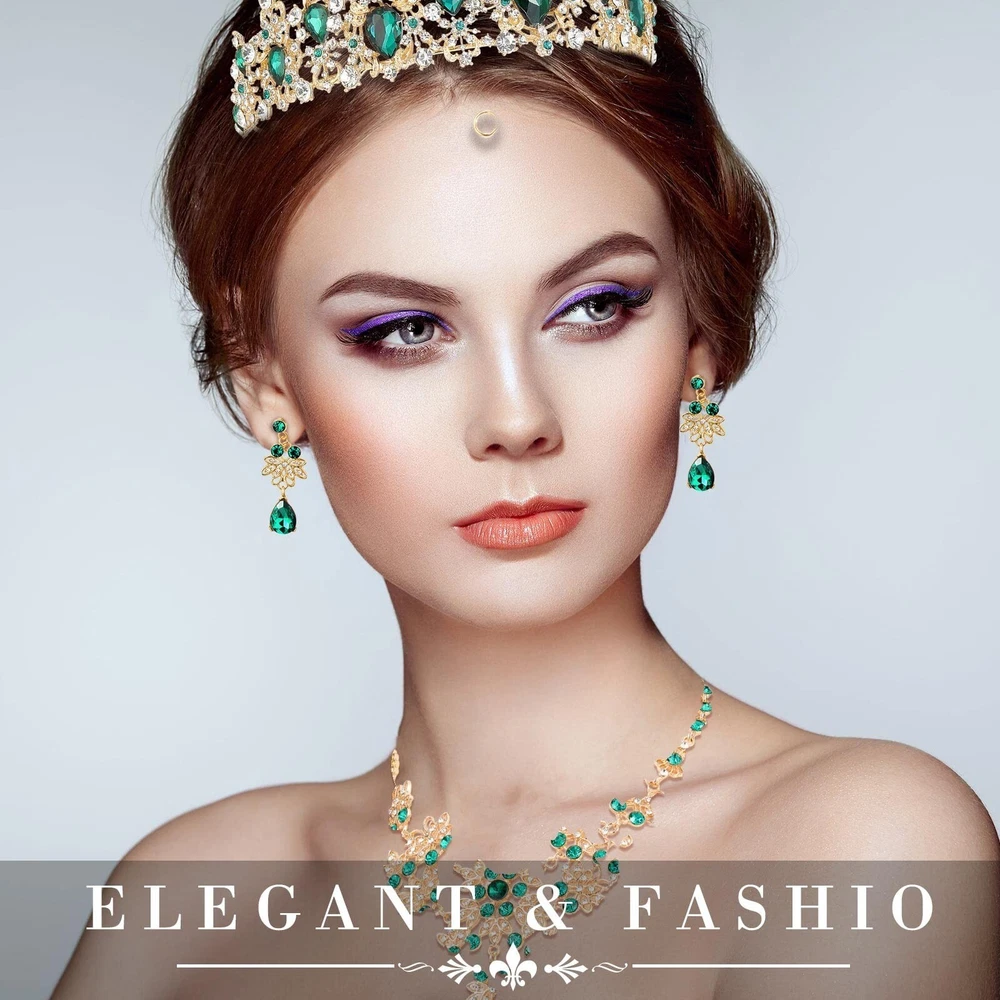 Sureio Baroque Bridal Jewelry Set 3 Pieces Tiara Earrings Necklace Bridal Jewelry Set Wedding Rhinestone Crystal Tiara Crown Headband Princess Baroque Crown for Bride Women Product Details Color: Green Brand: Sureio MPN: Does not apply UPC: Does not apply EAN: Does not apply Package Dimensions : 7.09 x 6.3 x 2.56 inches; 8.82 ounces Date First Available : November 16, 2021 Manufacturer : Sureio Brand, Seller, or Collection Name: Sureio Metal: Alloy Material: Rhinestone Clasp: Lobster Clasp Number of stones: 3 Features: Sweet gifts: The prom crown and tiara set is ideal gift choice for your lover, friends, family, colleagues or close neighbors, the exquisite princess tiara for women is sure to win their preference, showing your love and support for them. Vintage Style: The tiaras for women are designed with nice workmanship, and designed with vintage style, classic and beautiful, you can use them in different occasions, the medieval crown is suitable for vintage themed parties. Specifications: Material: alloy and crystal Color: as pictures shown Height of the princess crown: 6 cm/ 2.36 inch Diameter of the princess crown: 17 cm/ 6.7 inch Length of the earring: 4.5 cm/ 1.77 inch Length of the necklace is 39 cm/ 15.35 inch Package includes: 1 Piece of princess crown 2 Pieces of earrings 1 Piece of necklace Notes: Manual measurement, please allow slight errors on size. The color may exist slight difference due to different screen displays. Small items, please keep away from little kids to avoid swallowing. Winding risk may exist, please keep away from little kids. Pointed parts included, please keep away from kids, if needed, under adult's care.