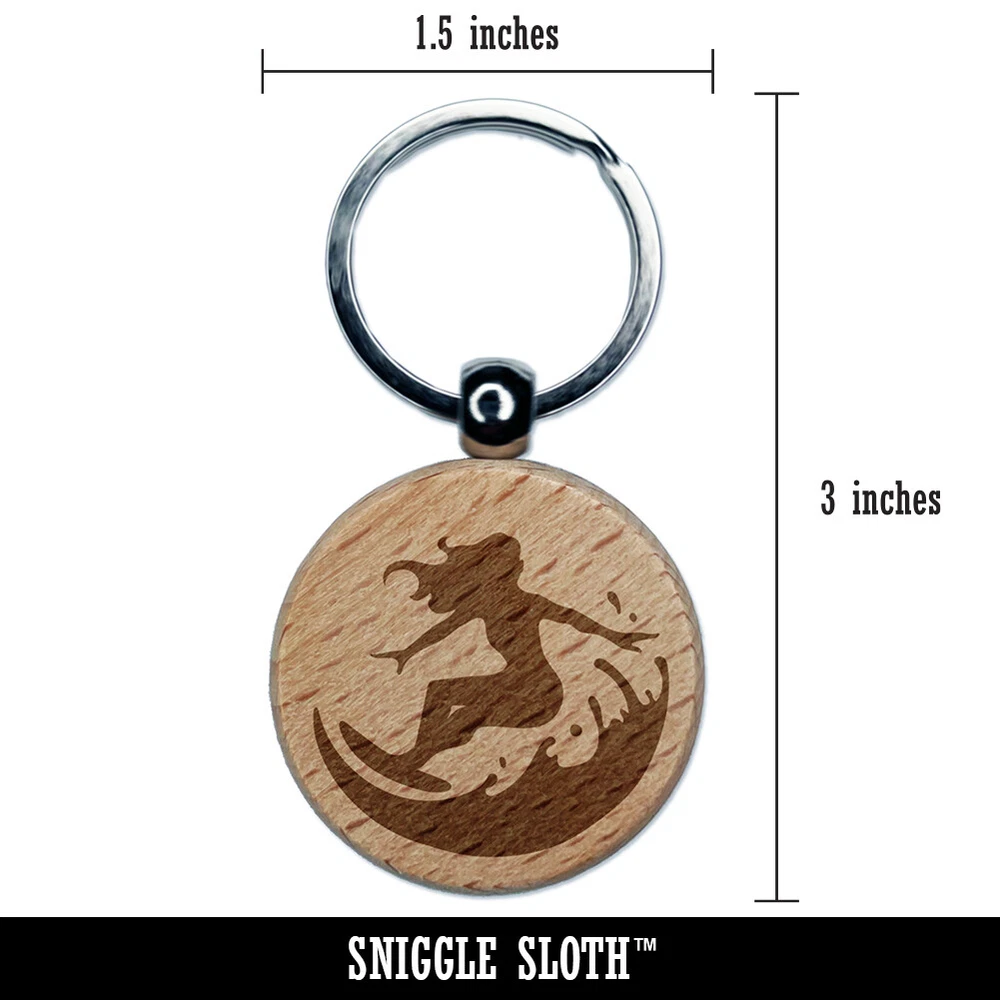 Surfing Surfer Girl on Wave Engraved Wood Round Keychain Tag Charm